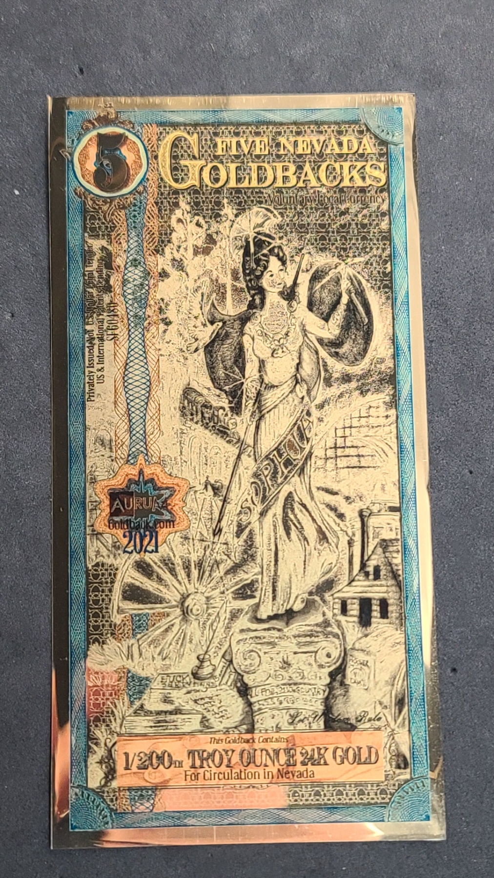 (1) 2021 1/200th Troy Ounce 24K Gold 5 Goldbacks Note -Nevada