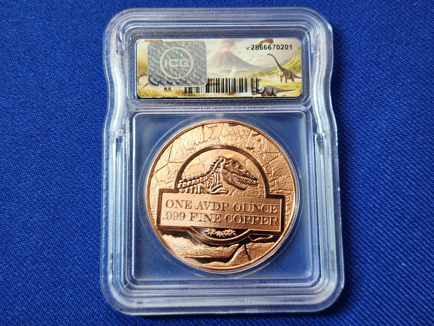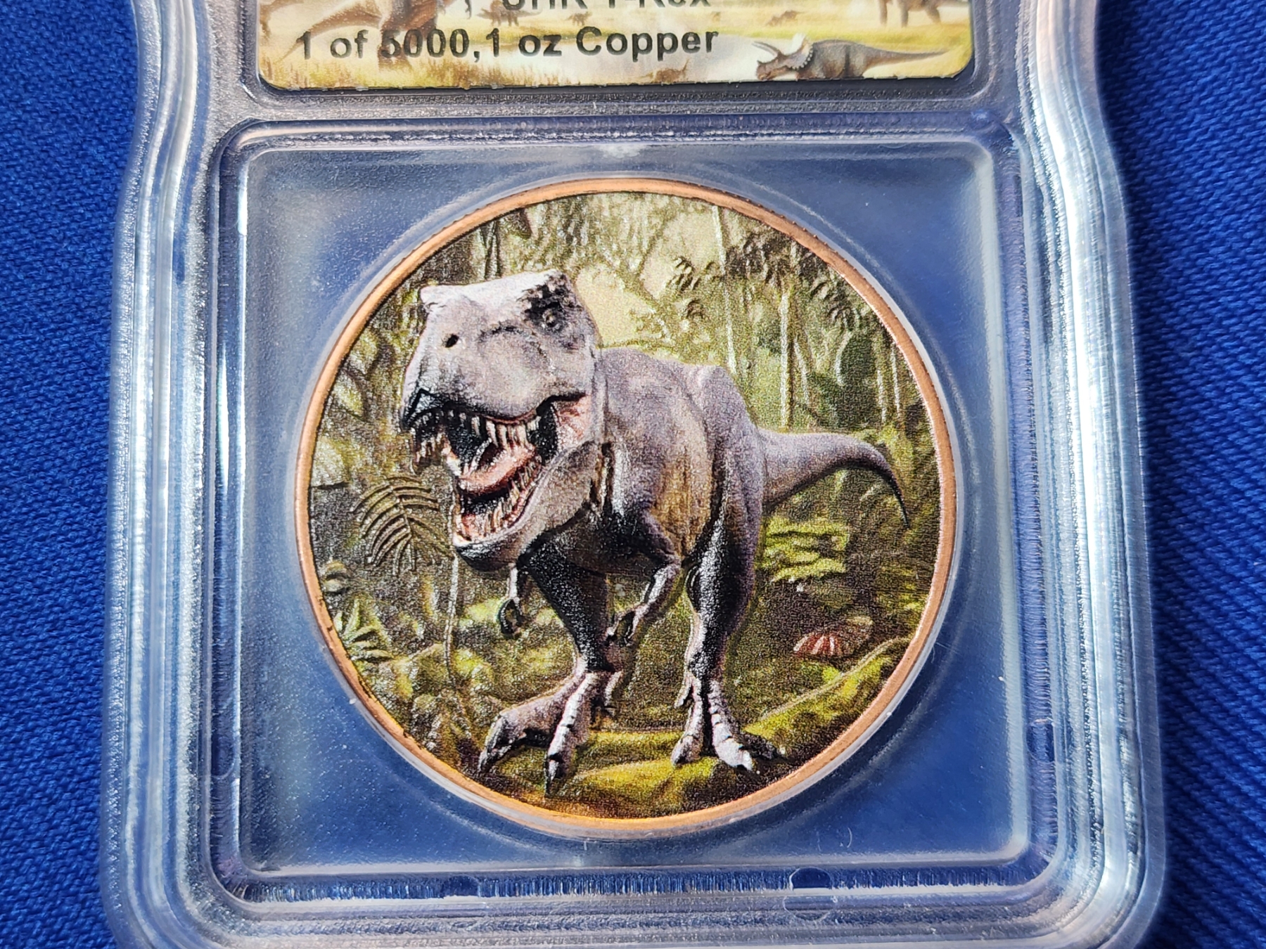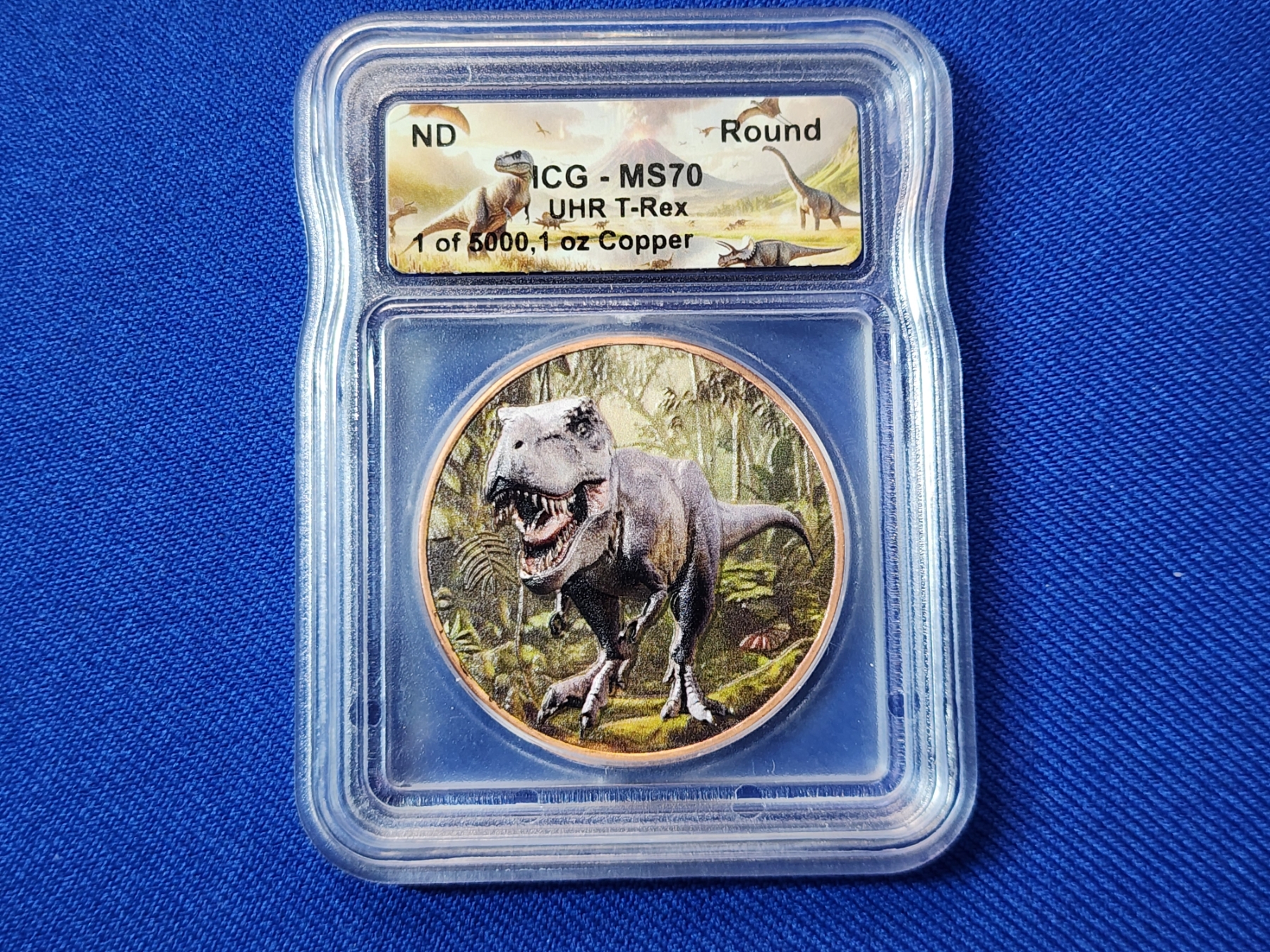 1 oz .999 Fine Copper Colorized UHR T-Rex Round - ICG MS 70