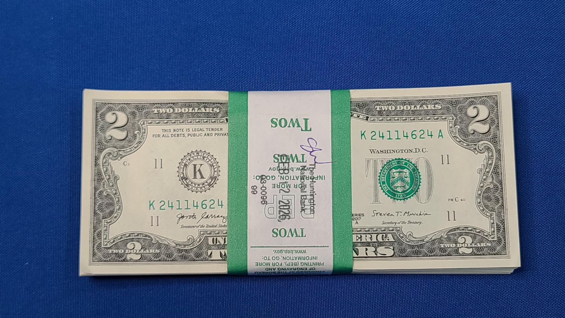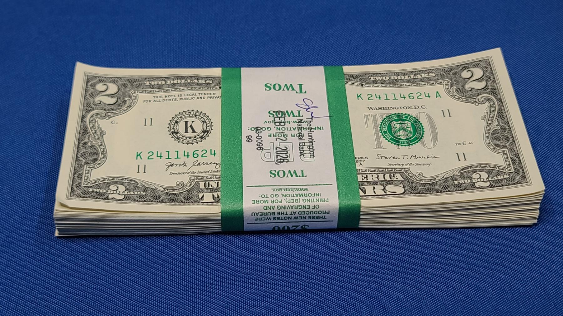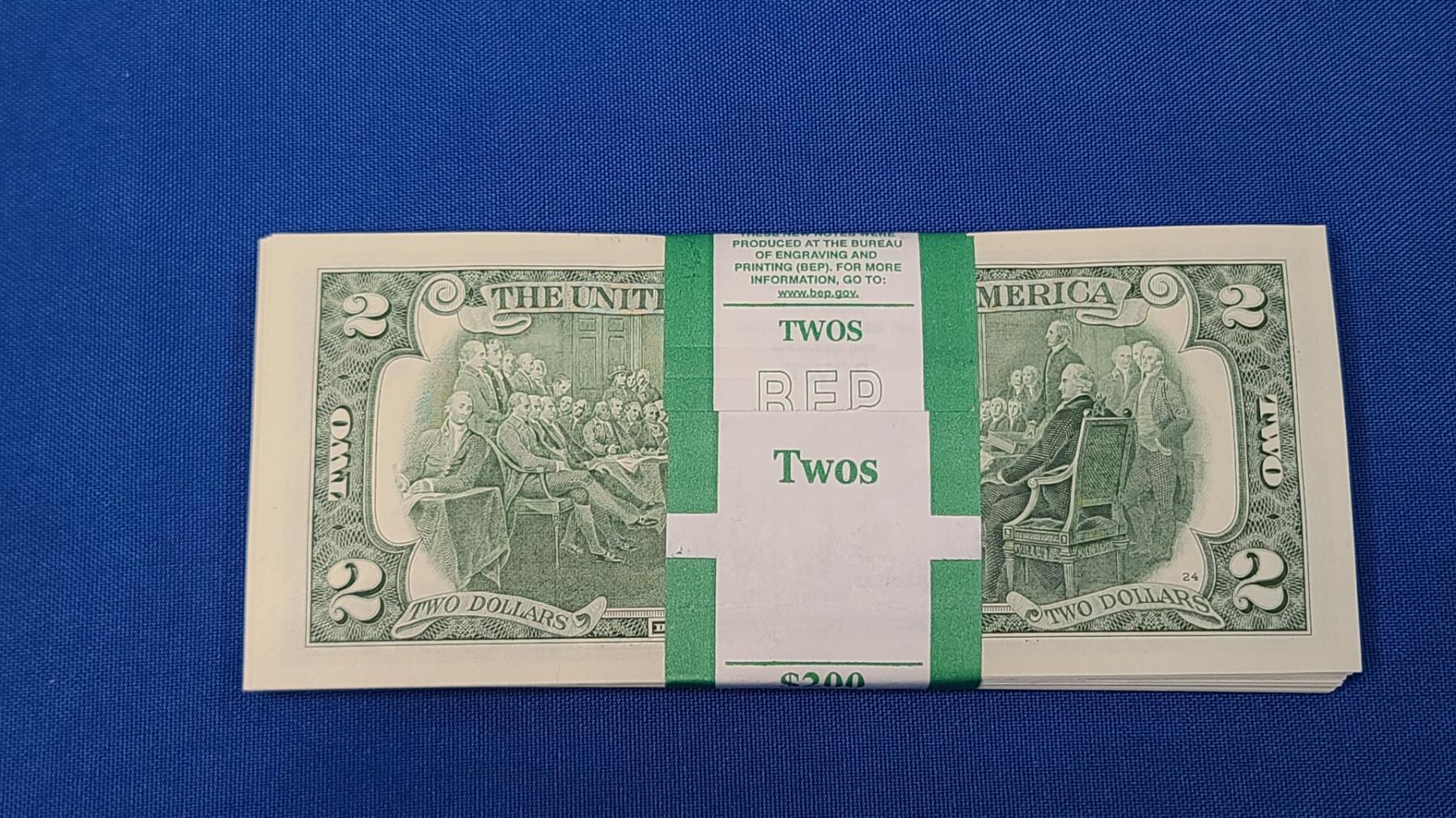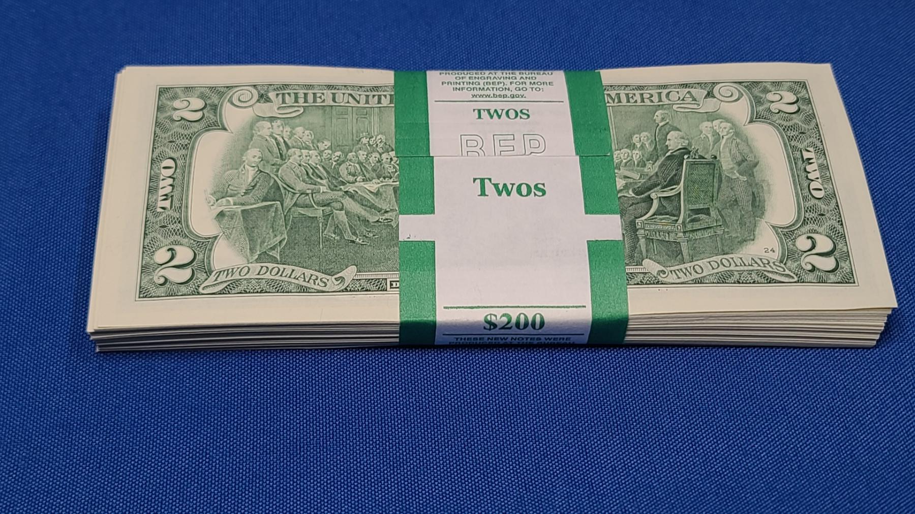100 - $2.00 United States Bills - Federal Reserve Wrap - Mint Condition - Face Value $200.00 - Consecutive Numbered Bills