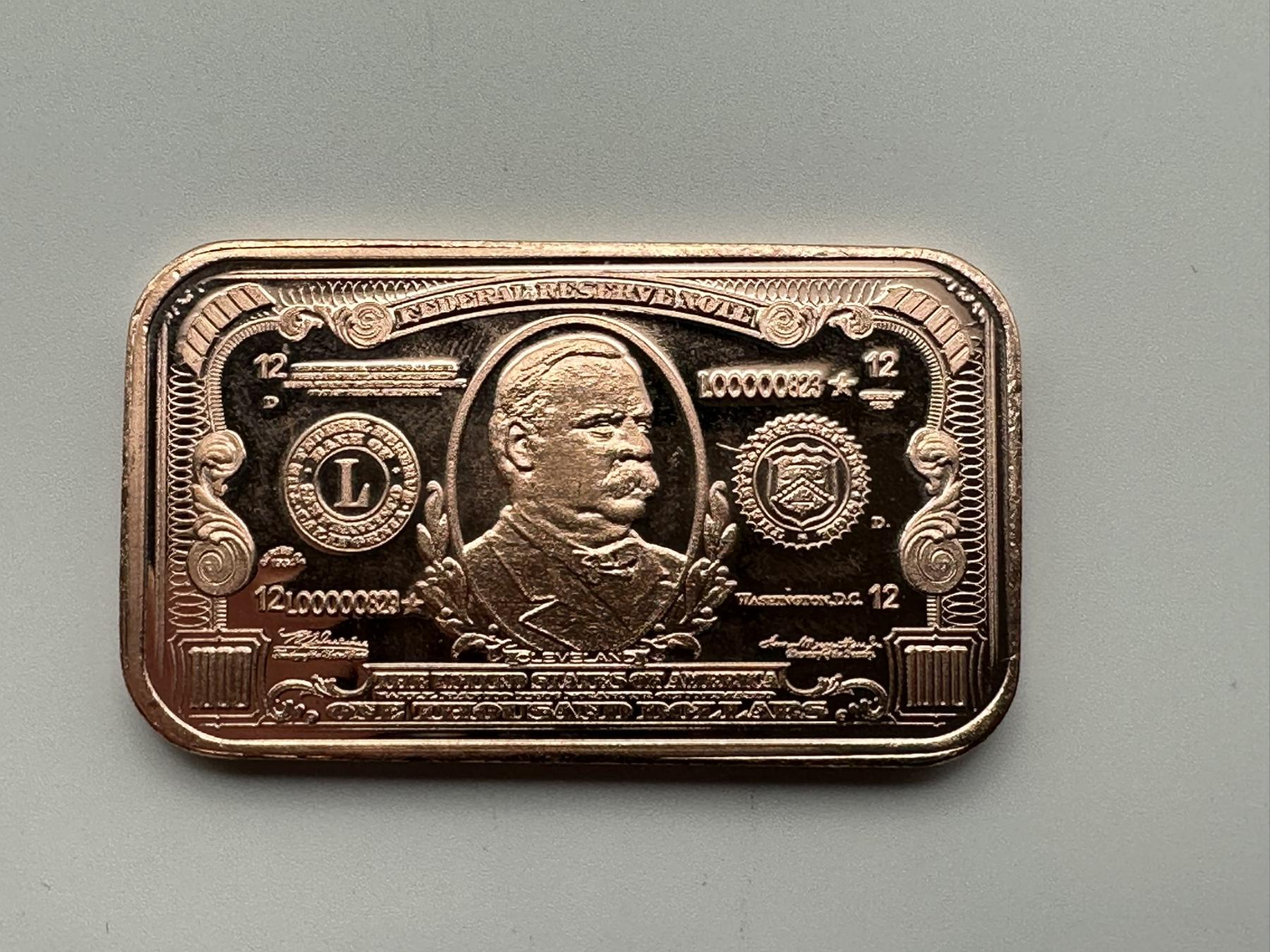 $1000 22nd & 24th President Grover Cleveland Commemorative 1 AVDP oz .999 Fine Copper Bar