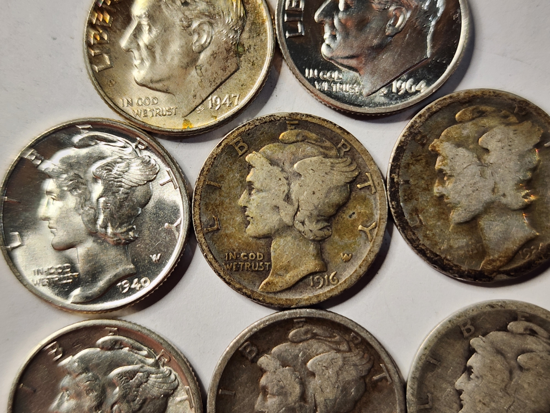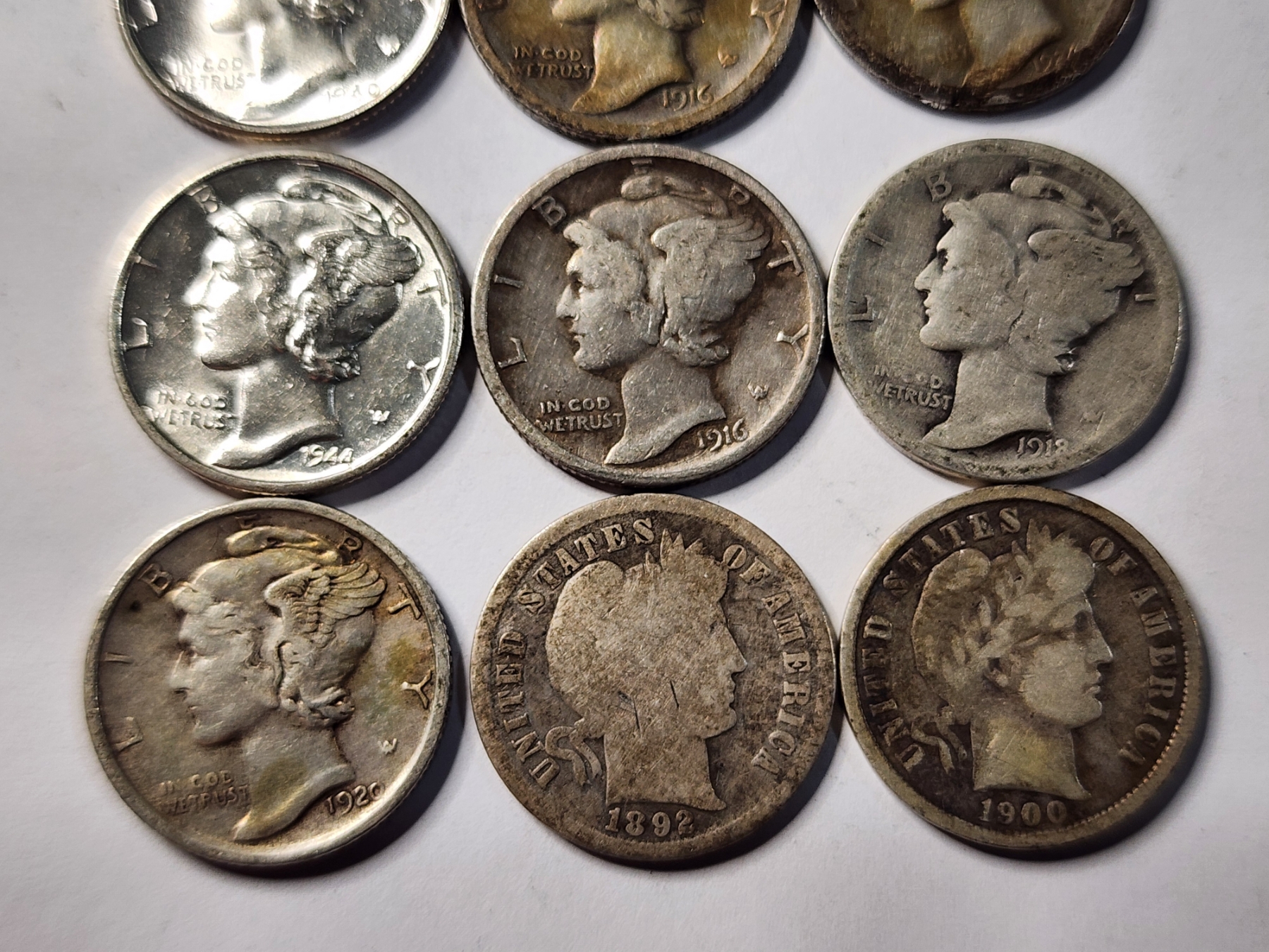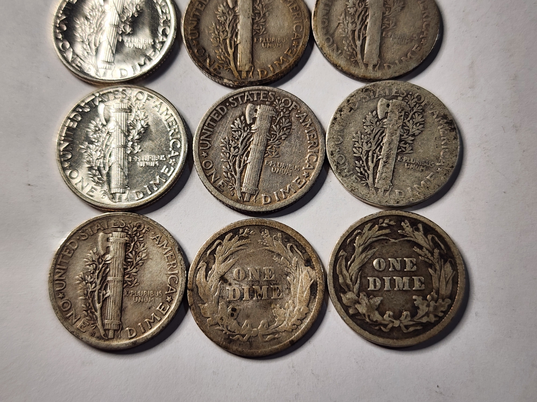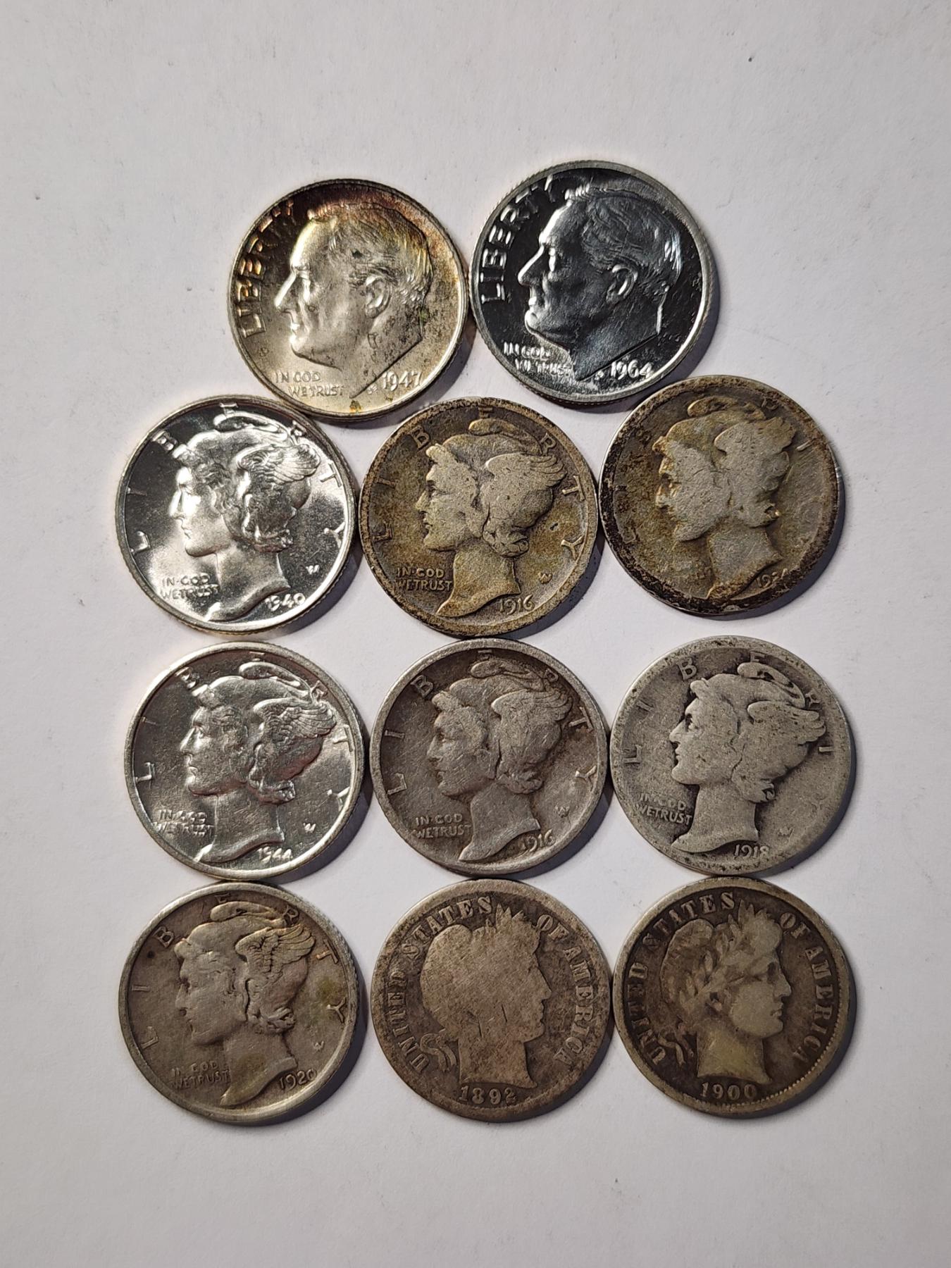 11 Assorted 90% Silver United States Dimes Including Barbers, Mercury & Roosevelt ~ DATING BACK TO 1892 ~ FACE VALUE $1.10