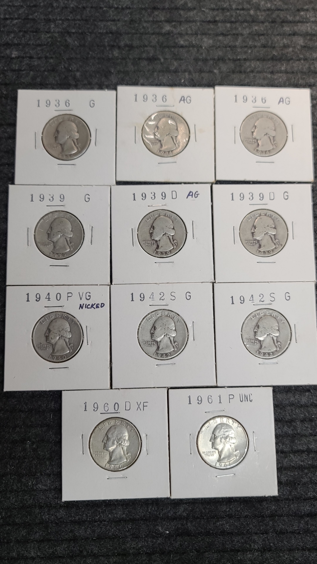 (11) Assorted Years 90% Silver Washington Quarters Years: 1936 x3 , 1939, 1939-D x2, 1940-P, 1942-S x2, 1960-D & 1961-P Face Value: $2.75