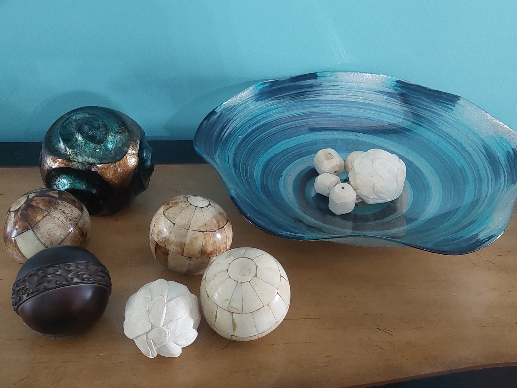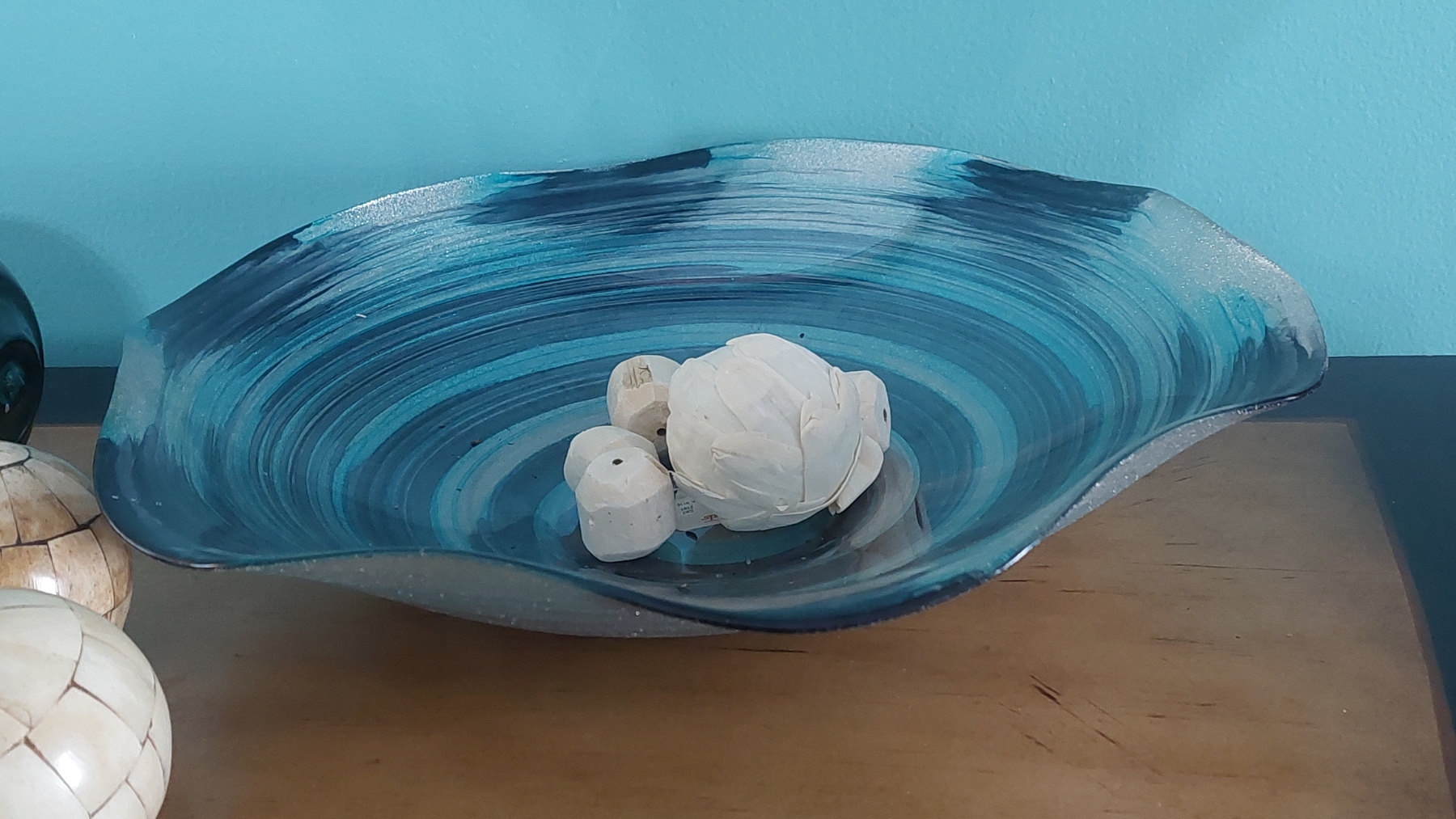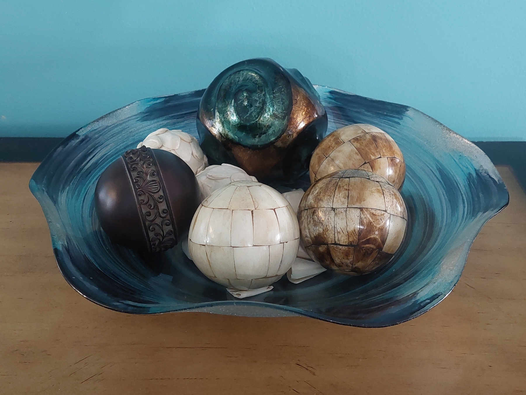 14" Art Glass Hand Blown Ruffled Edge Bowl With Decorative Balls As shown