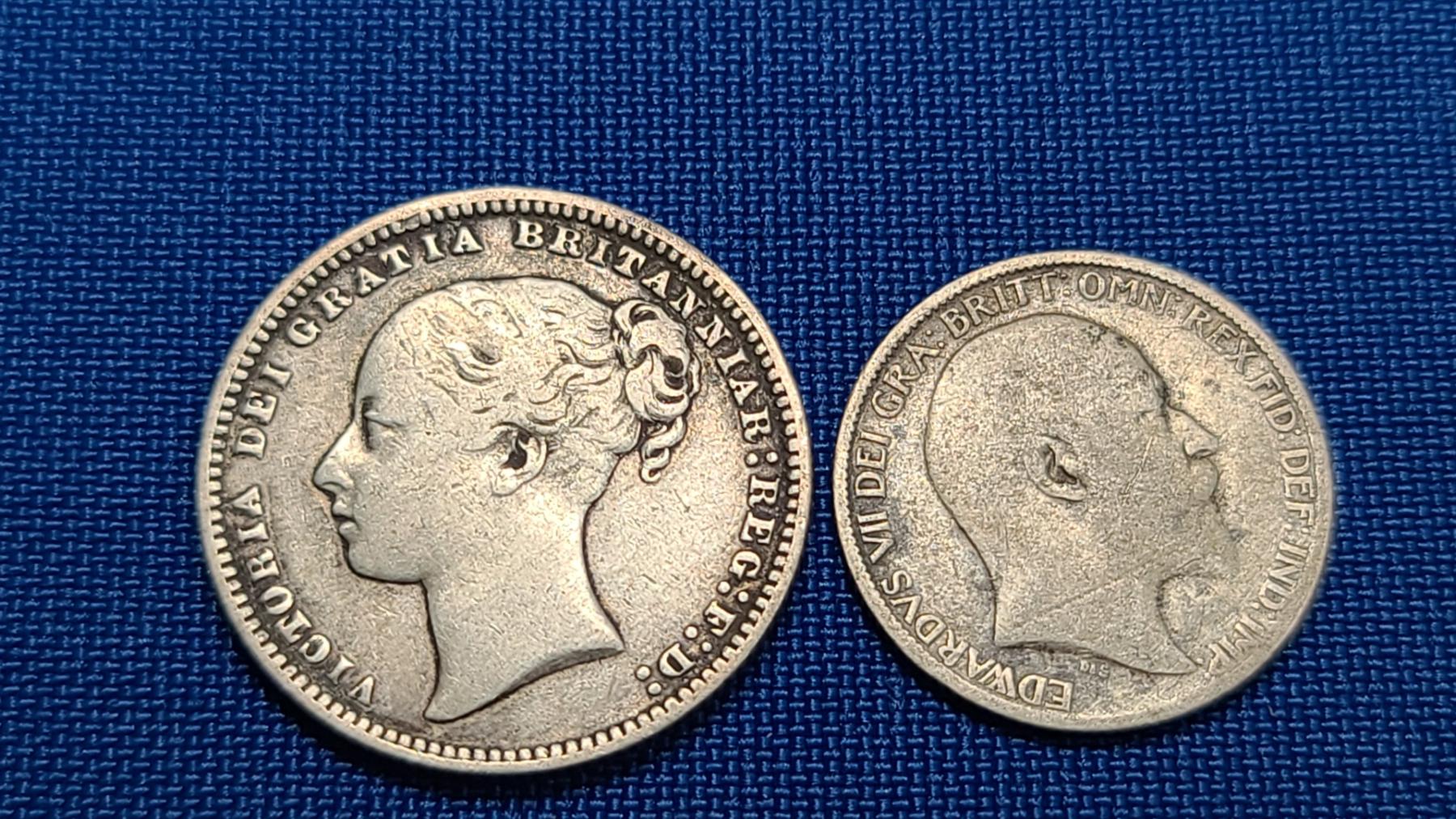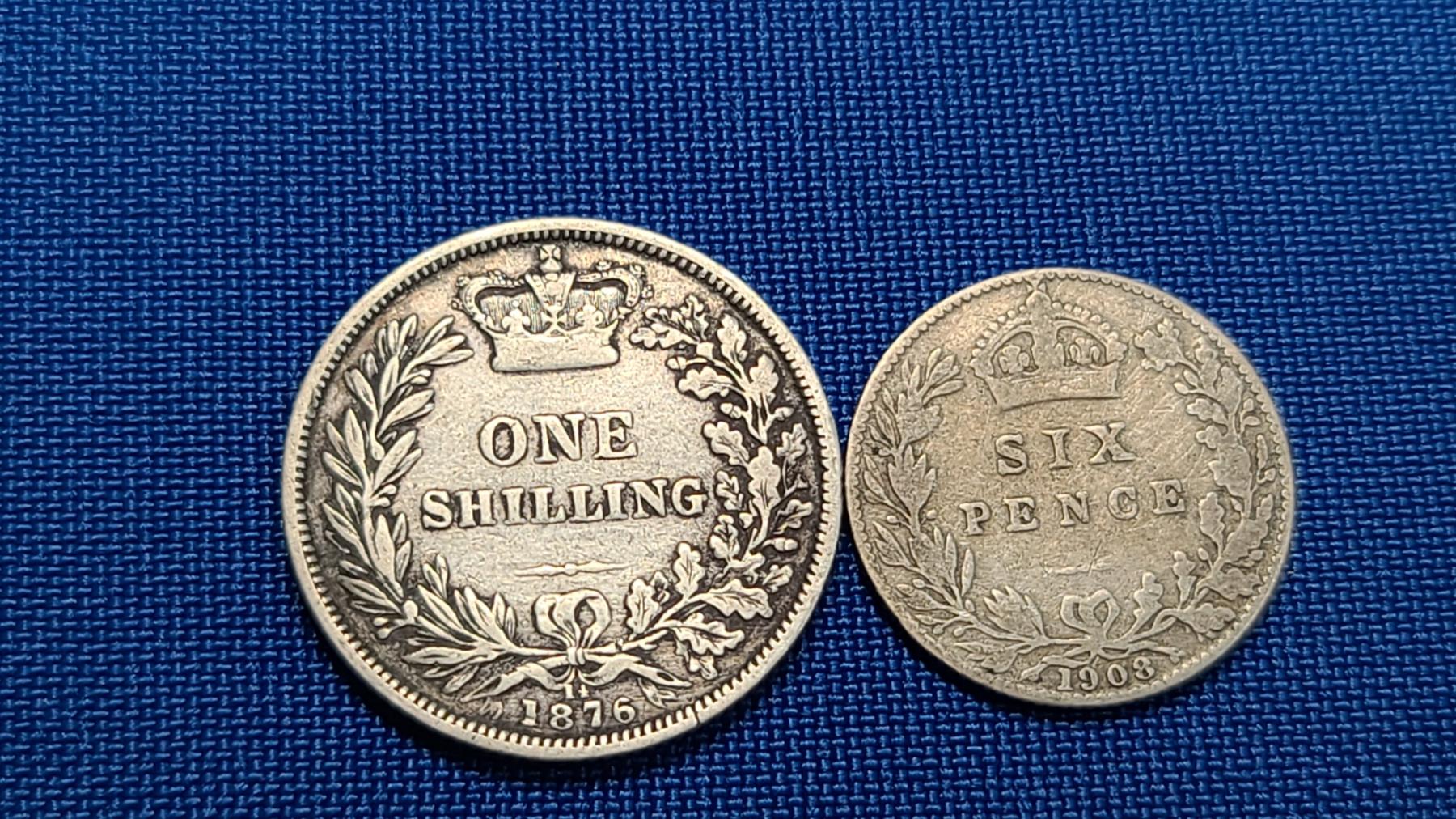 1876 Queen Victoria British One Shilling 0.9250 Silver Coin & 1908 King Edward VII Great Britain 0.9250 Silver Sixpence Coin