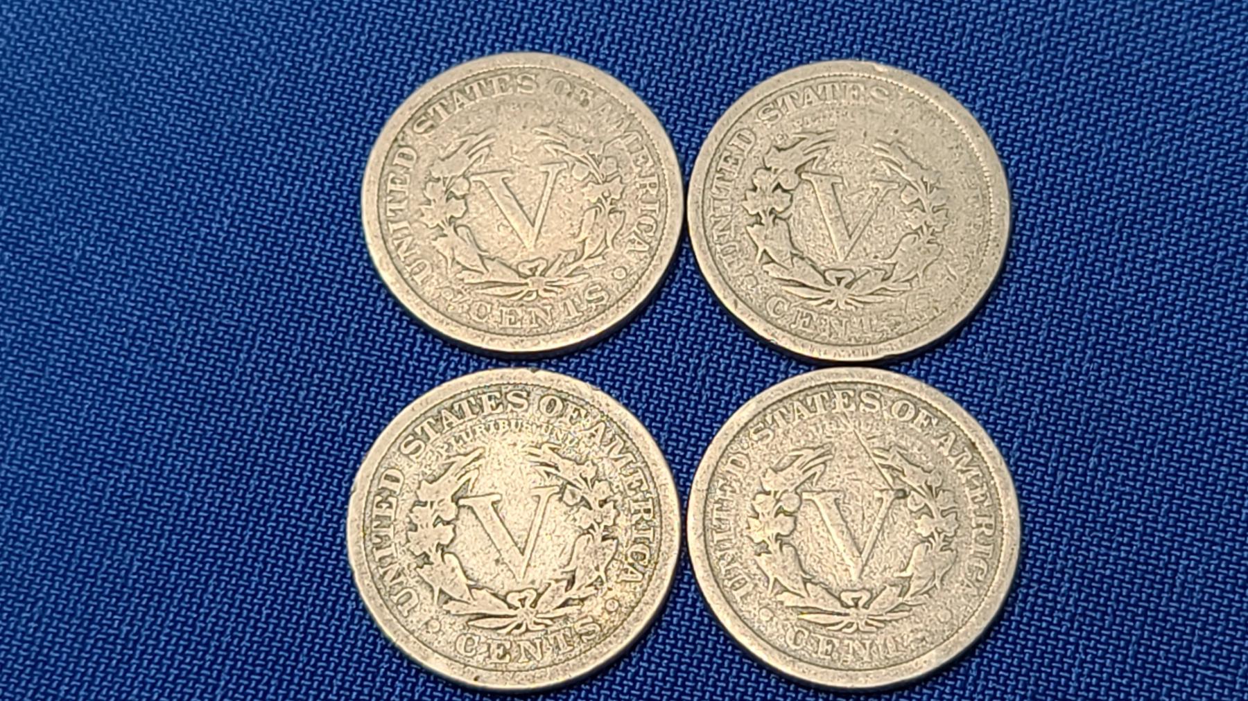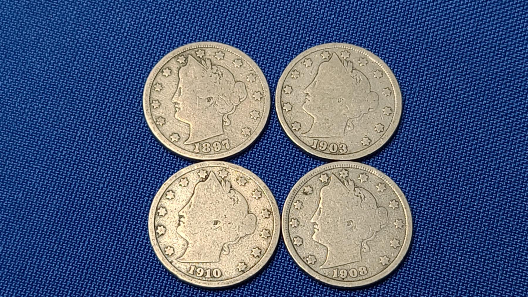 1897, 1903, 1908 & 1910 V Nickels - Face Value: $0.20