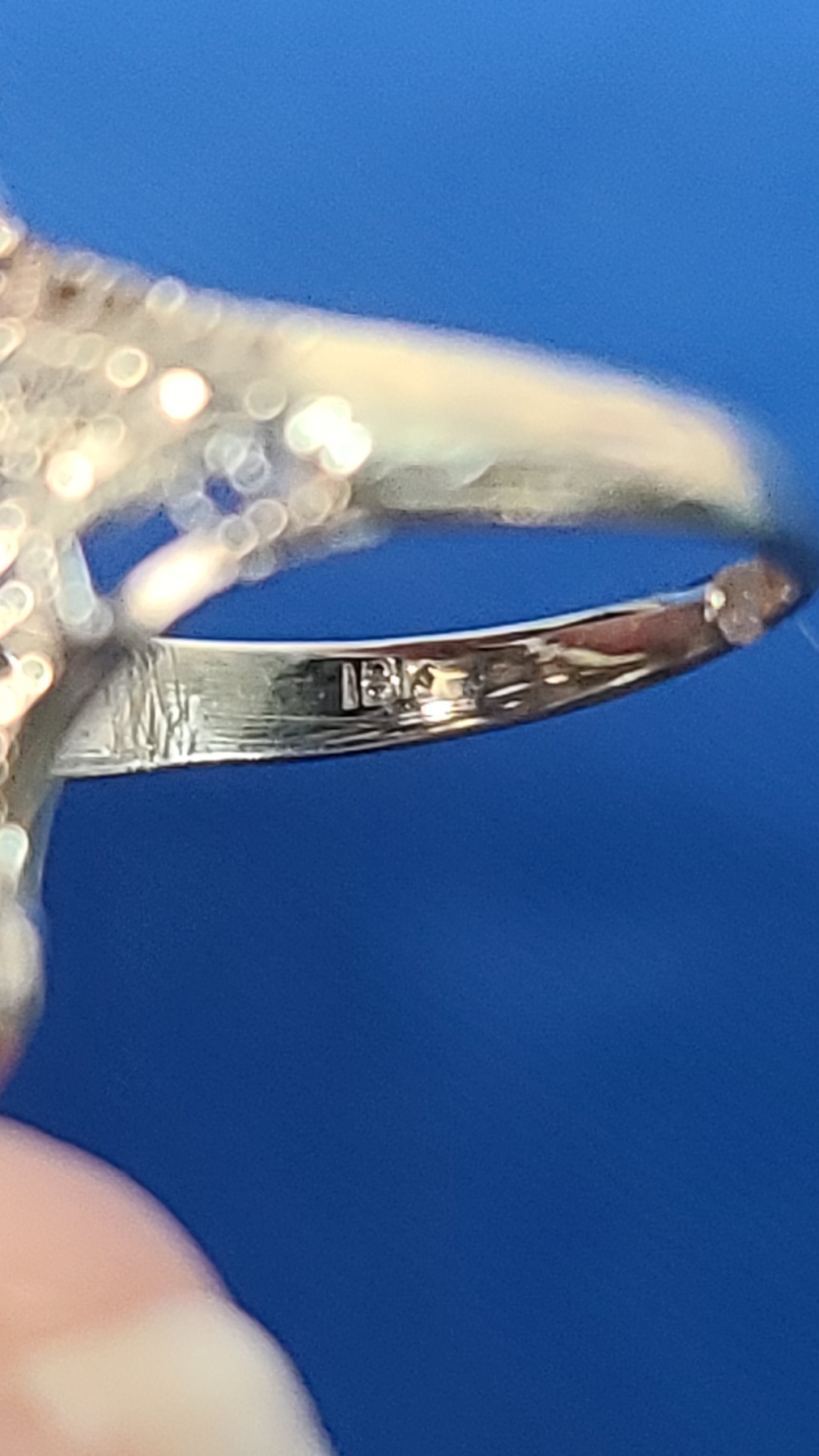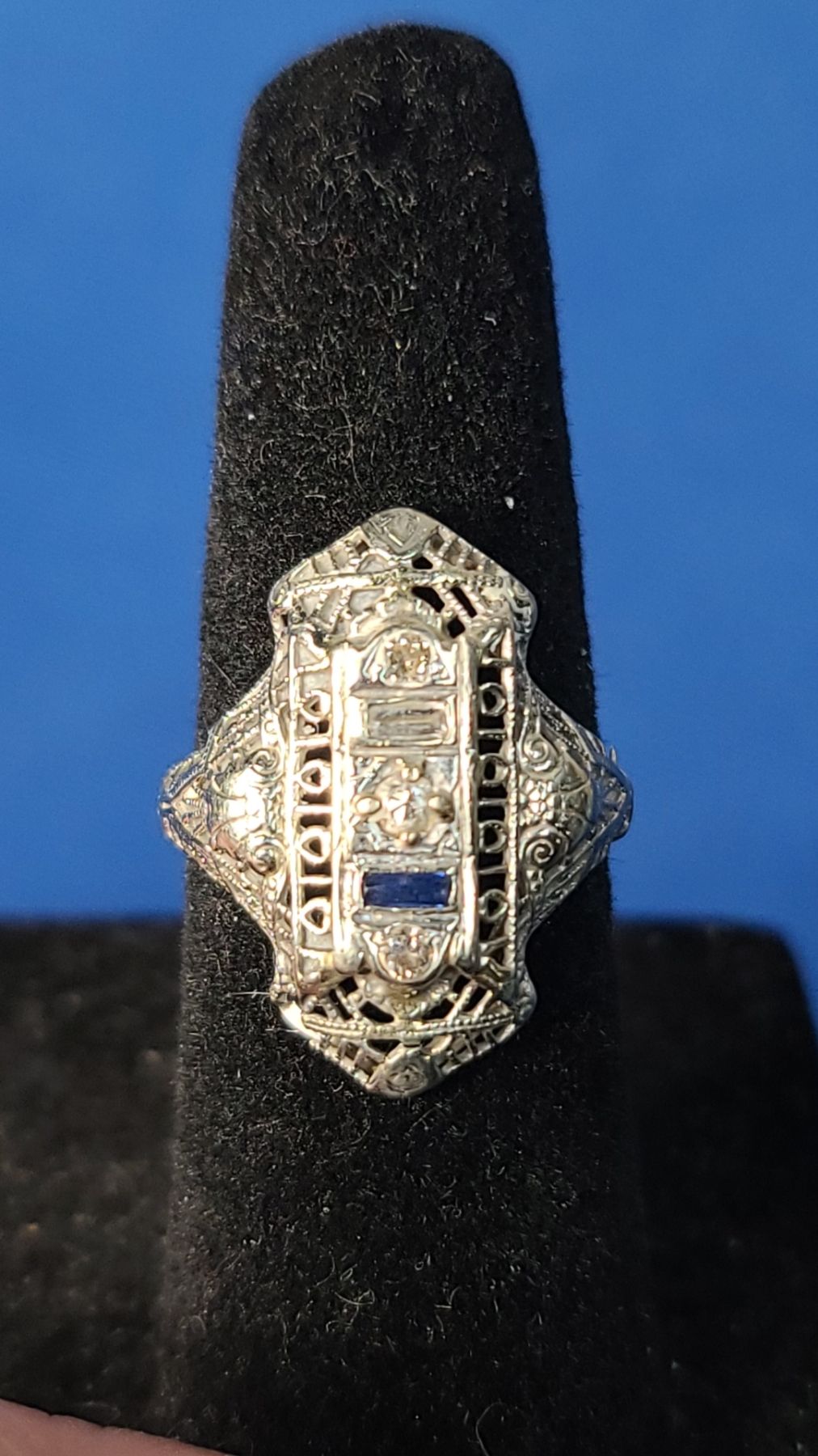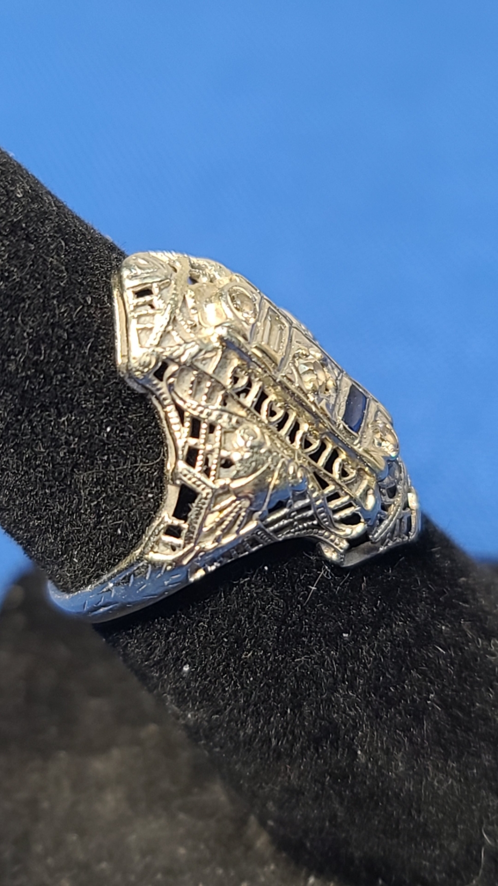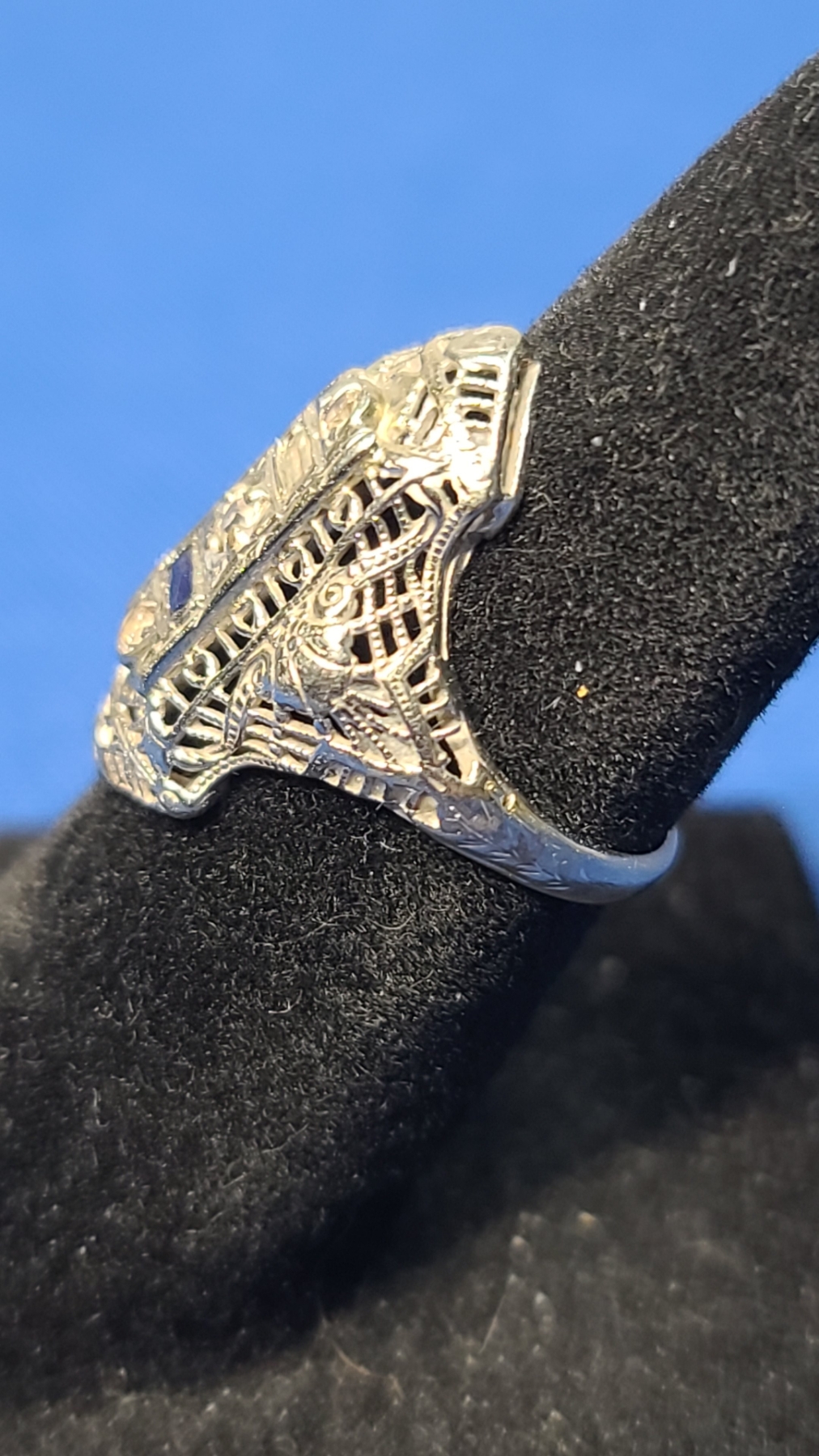 18K White Gold Vintage Art Deco Filigree Ring With Some Diamonds - Size 4 - Weight: 2.5g