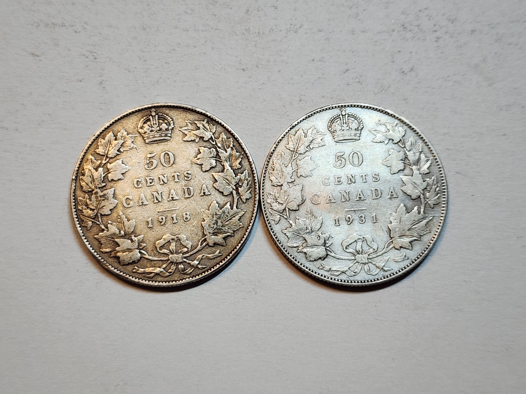 1918 Canadian 50 Cent Silver Coin ASW: 0.3456 oz and 1931 Canadian 50 Cent Silver Coin ASW: 0.3 oz