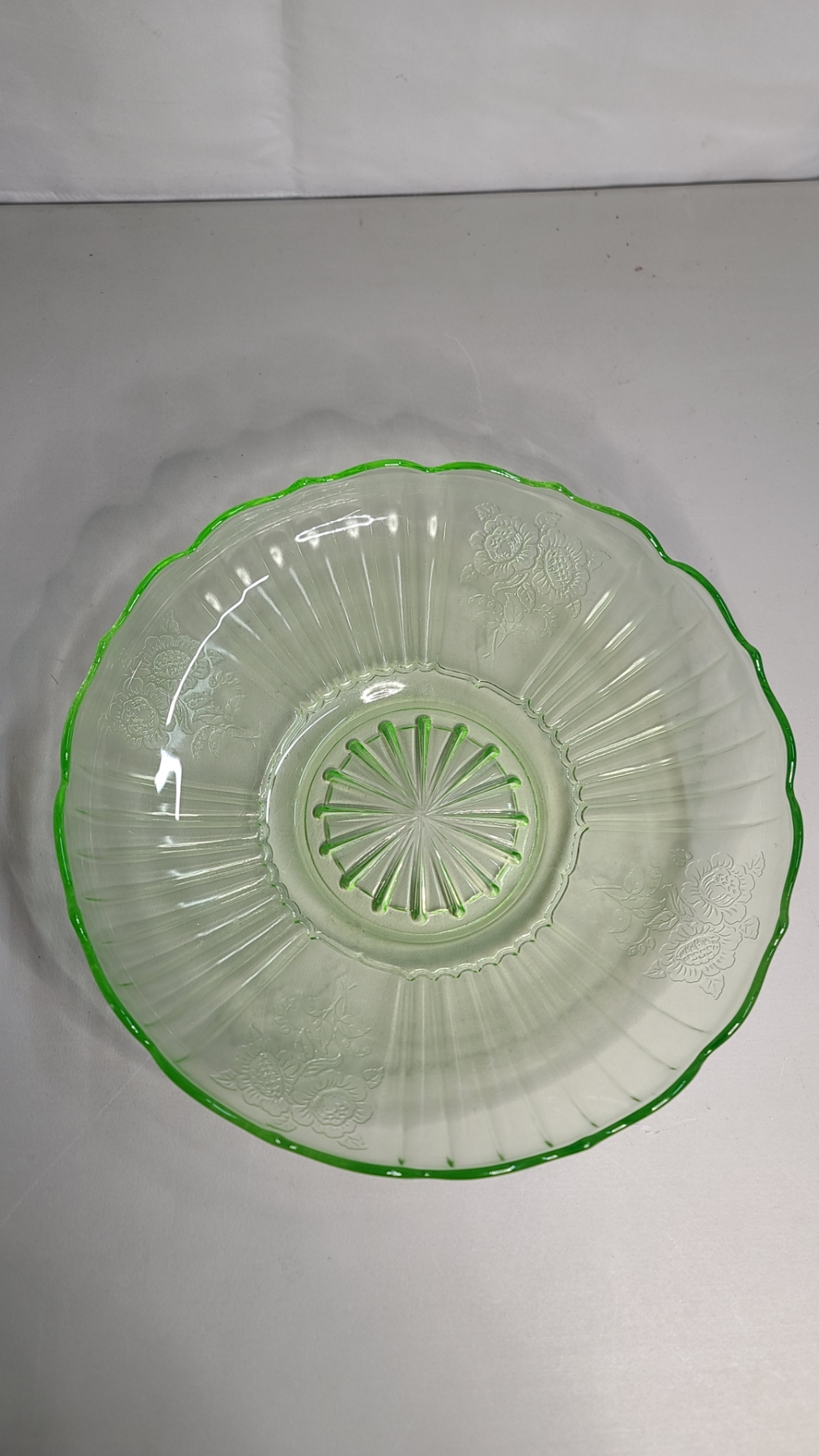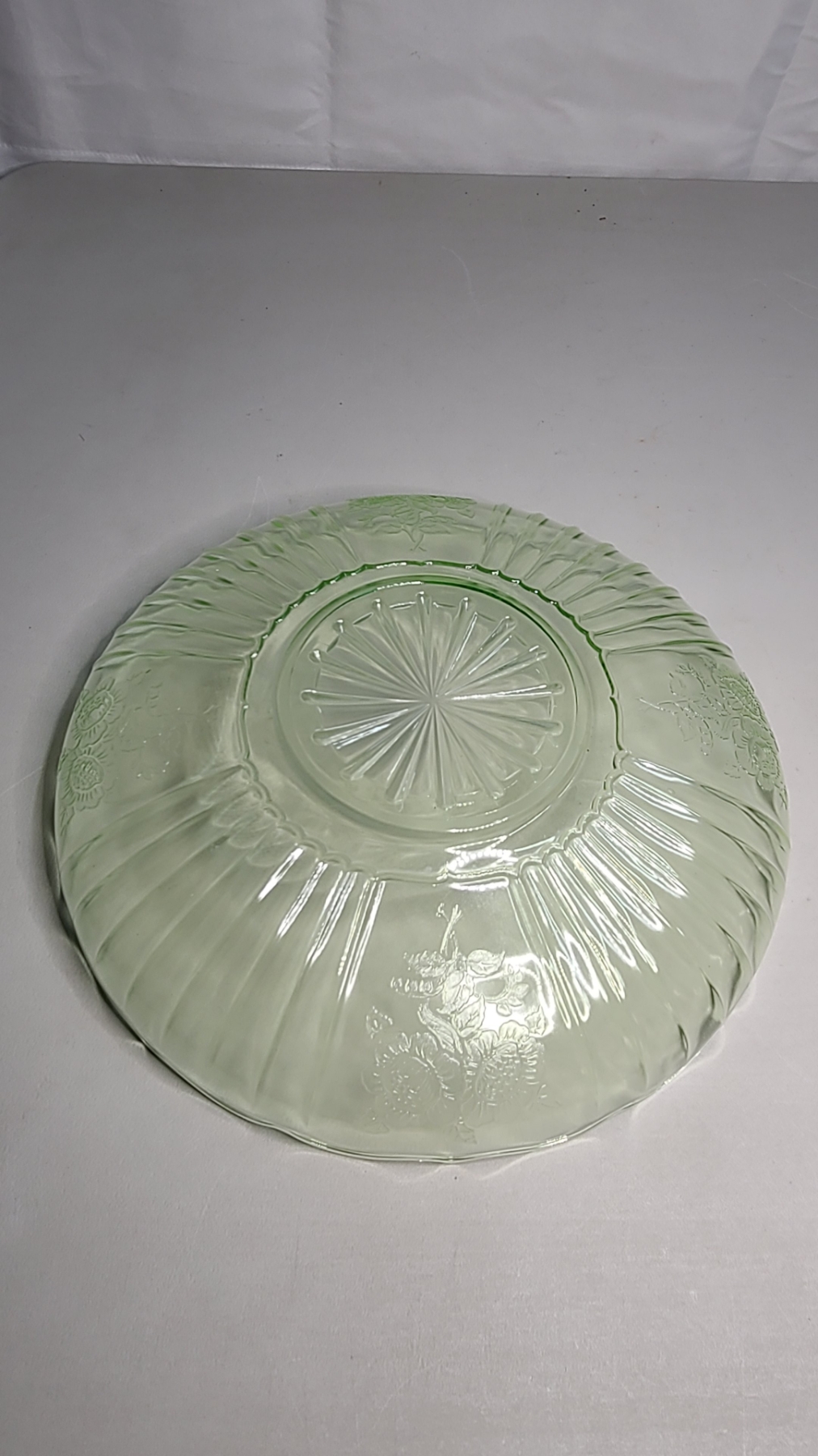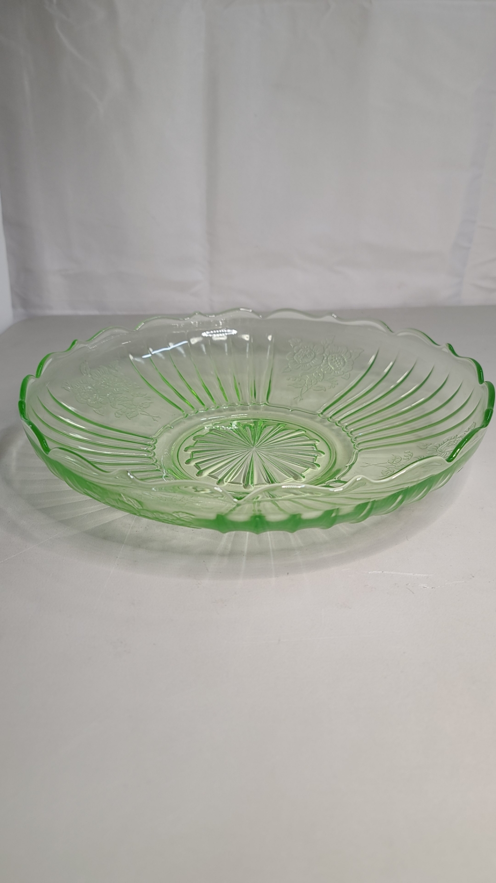 1930's Anchor Hocking Mayfair/Open Rose Green Uranium Glass Depression Glass Low Bowl
