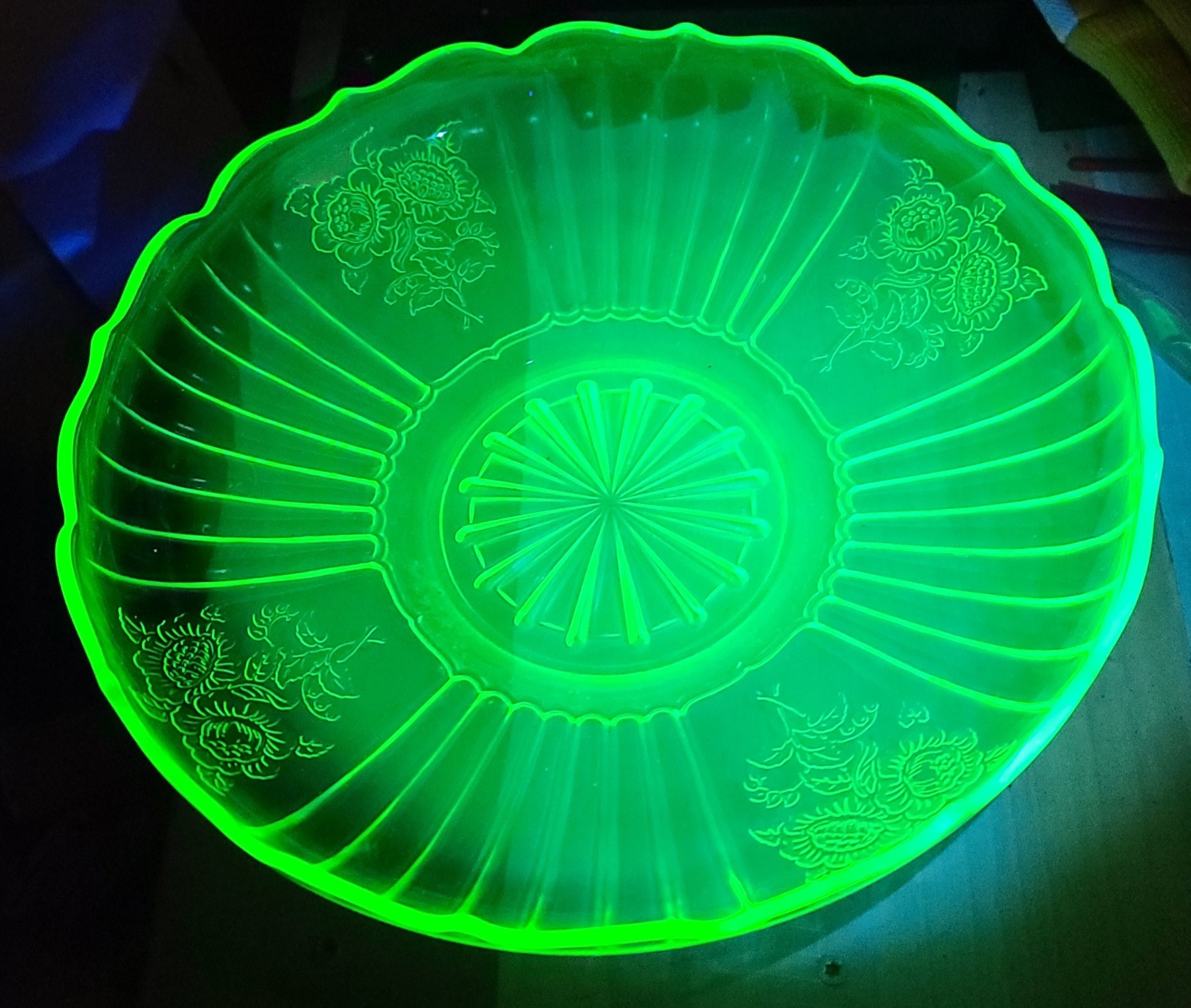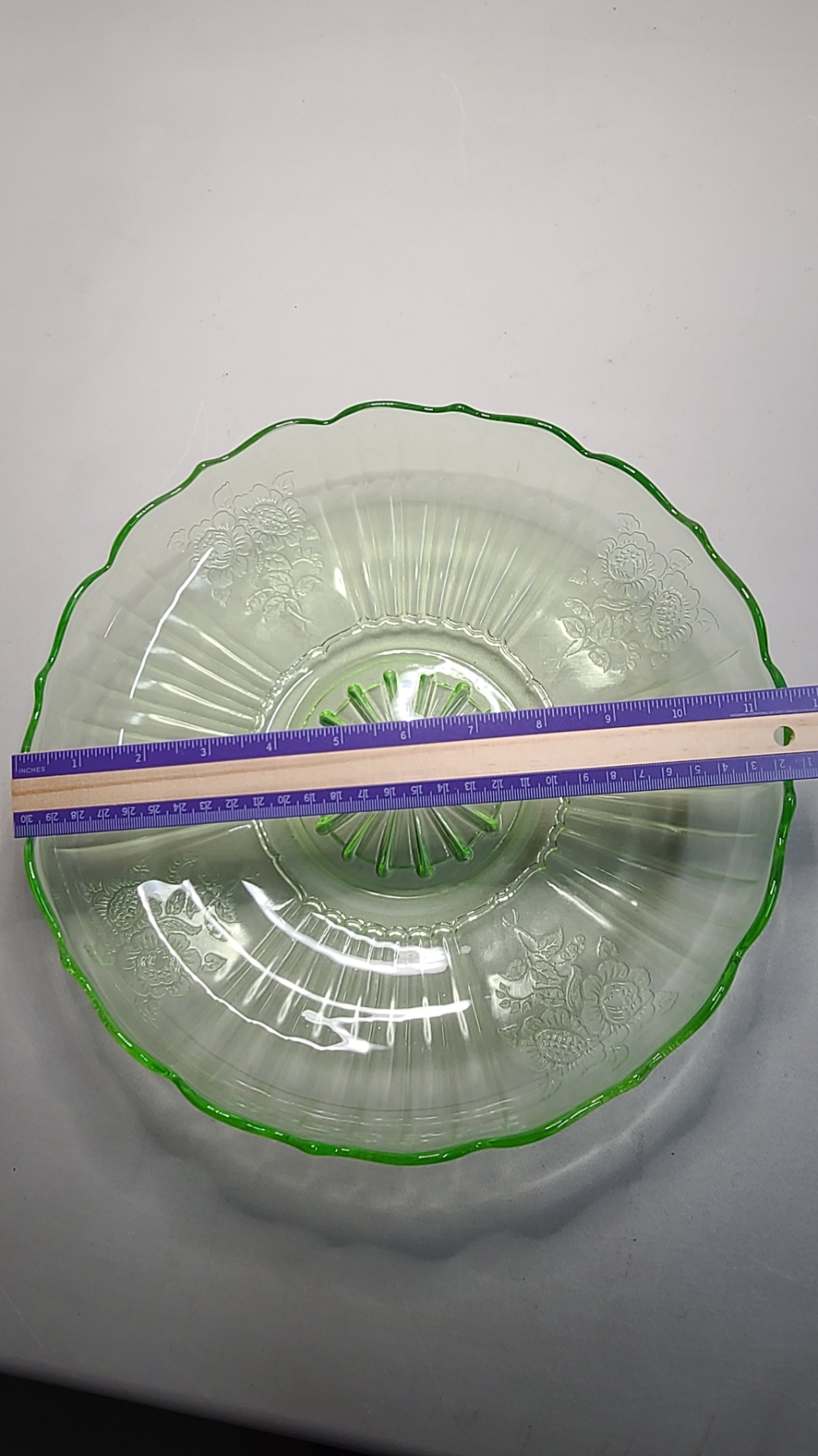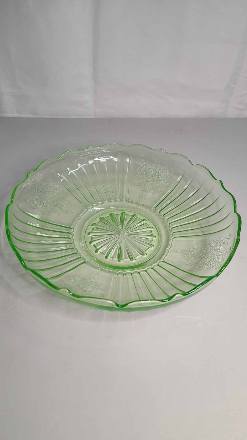 1930's Anchor Hocking Mayfair/Open Rose Green Uranium Glass Depression Glass Low Bowl