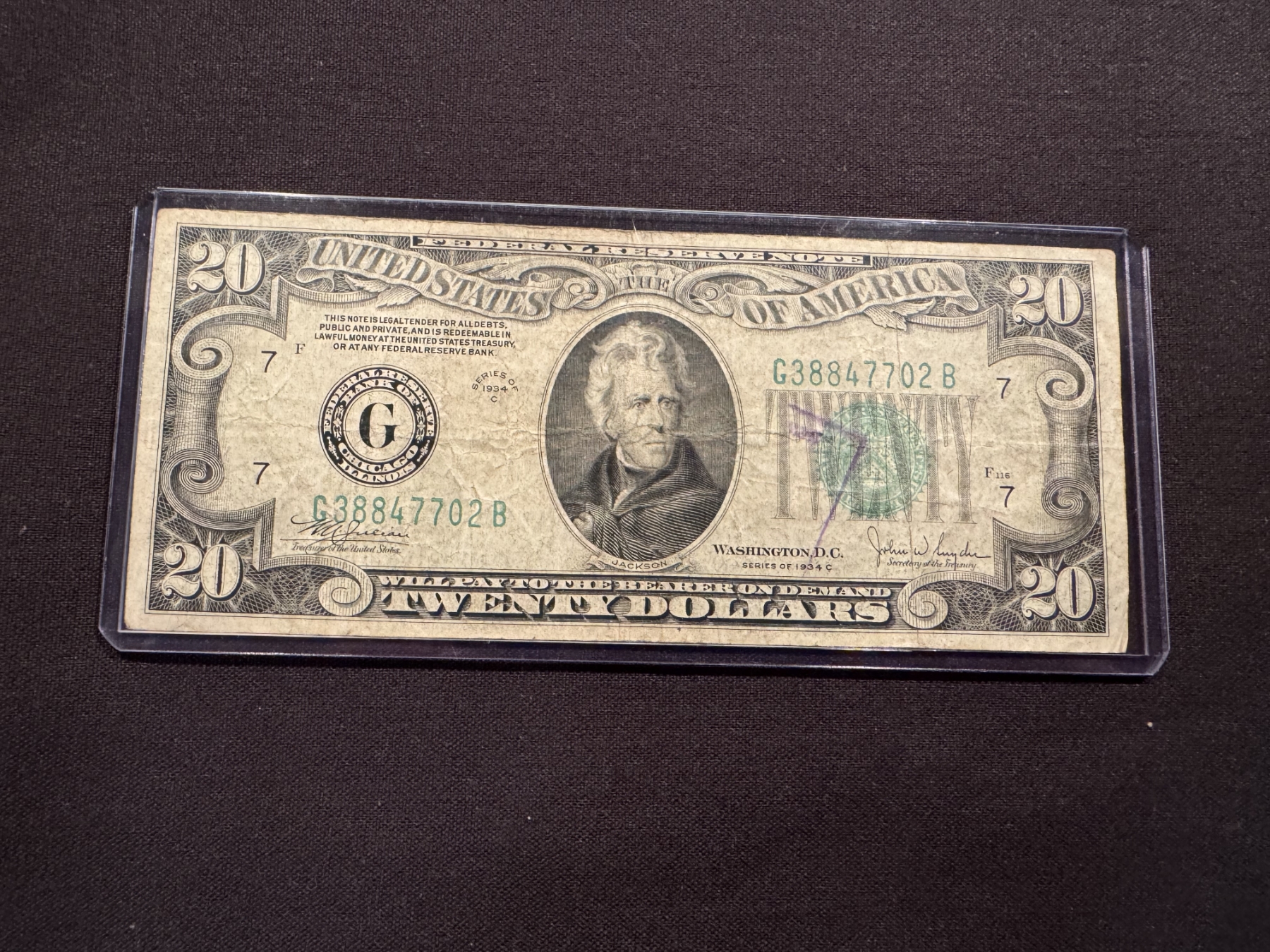1934 $20 United States Bill - President Jackson In Protective Holder