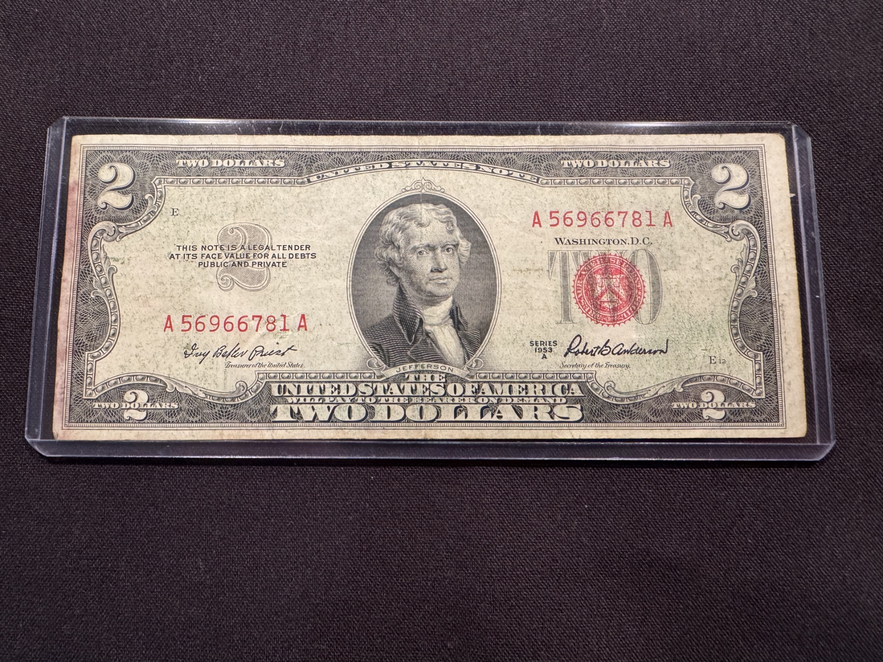 1953 United States Thomas Jefferson $2.00 Bill In Protective Holder - Authentic Bill