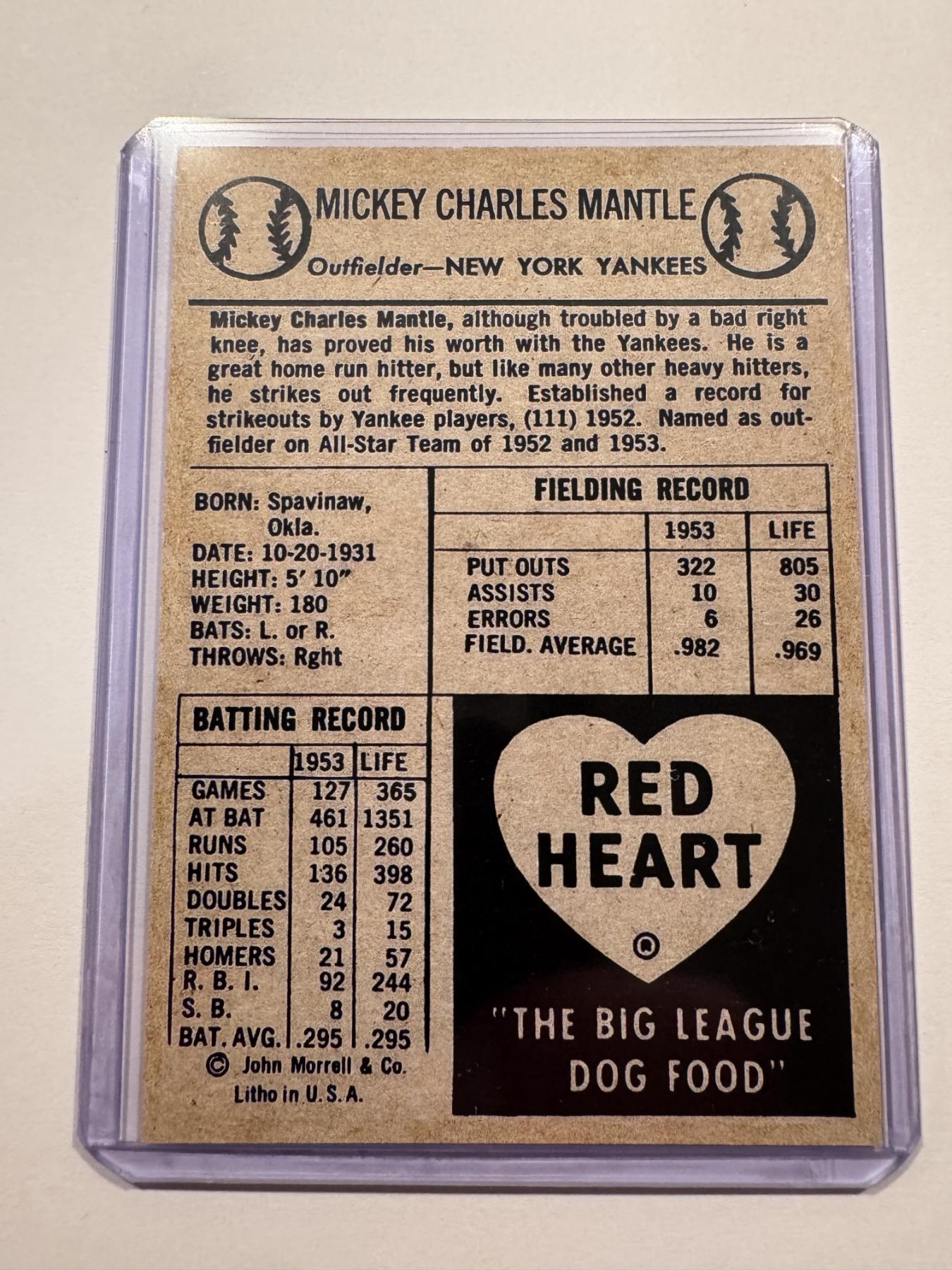 1954 Mickey Mantle Red Heart Archive Baseball Card In Protective Holder - Mint Condition