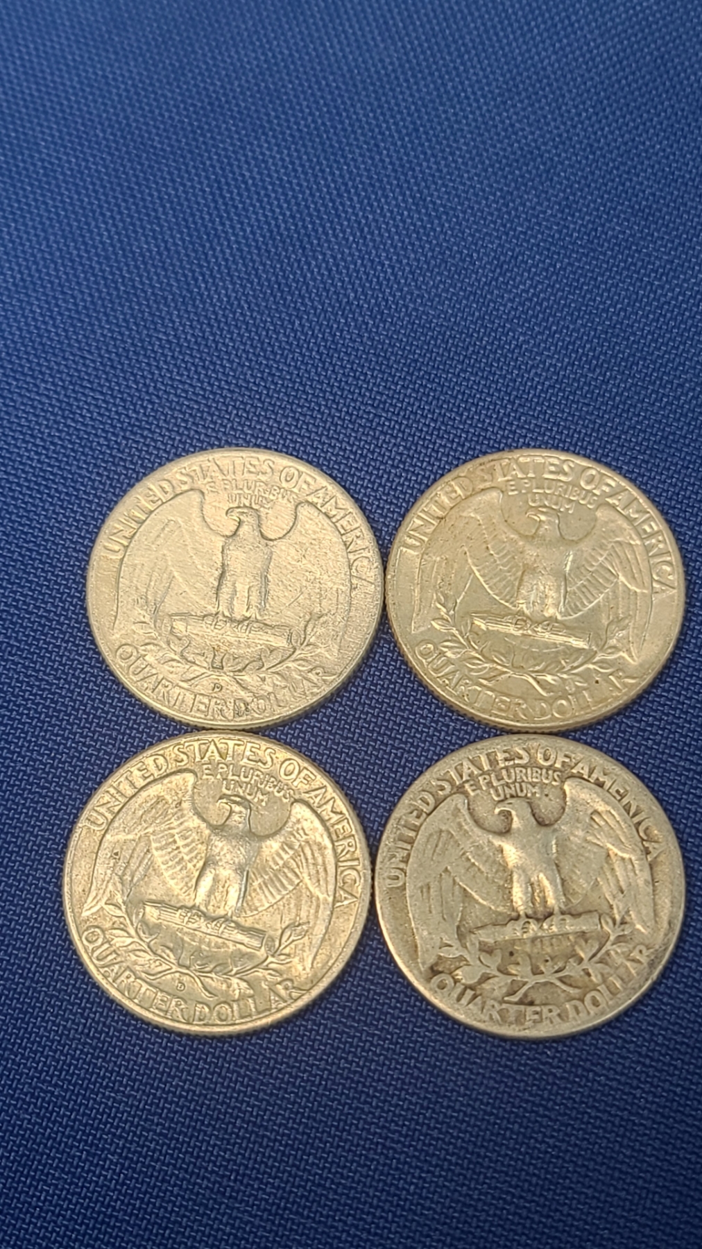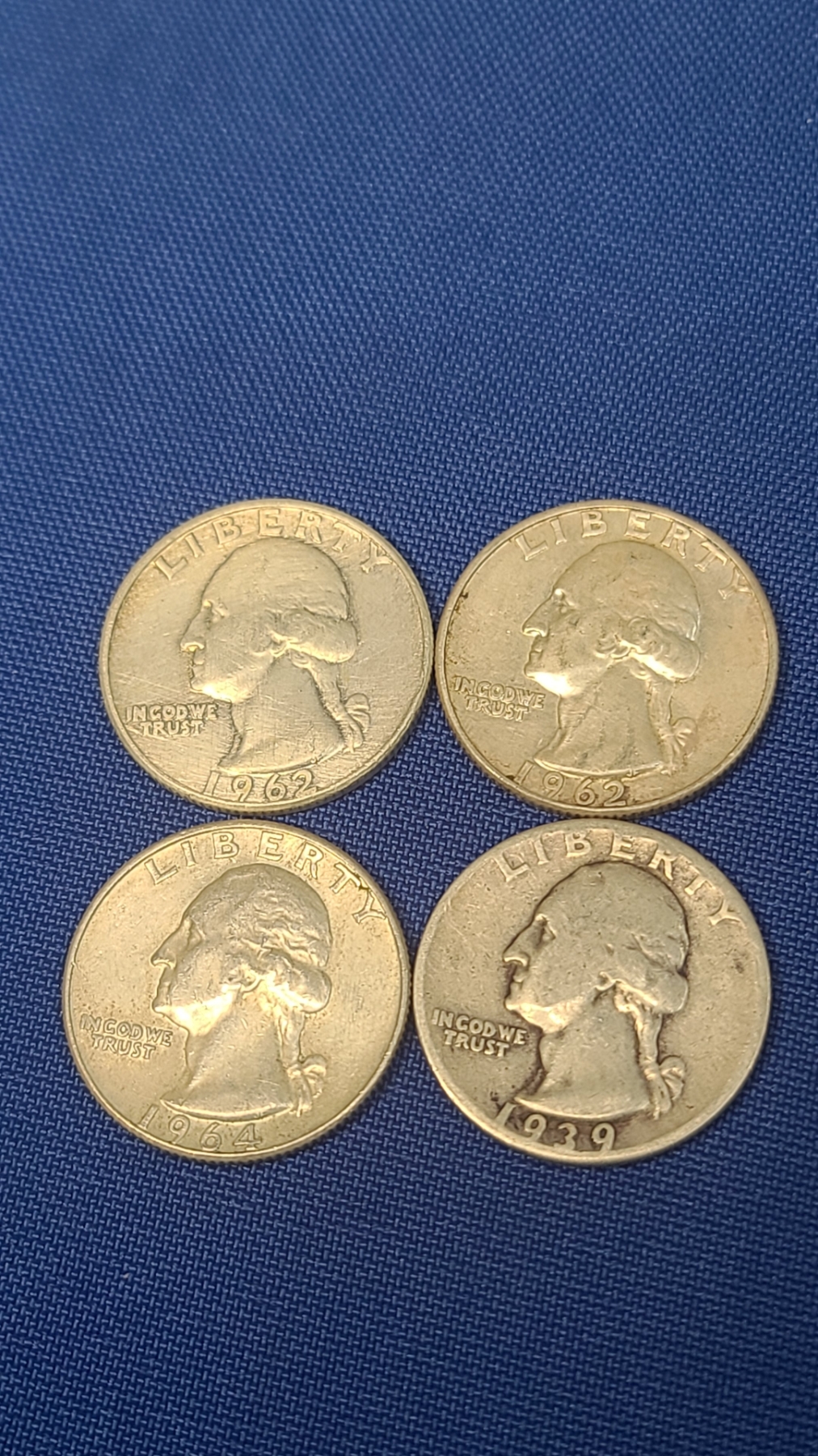 1962-D, 1962, 1939 (Possible Mint Mark), 1964-D 90% Silver Washington Head Quarters - Face Value: $1.00