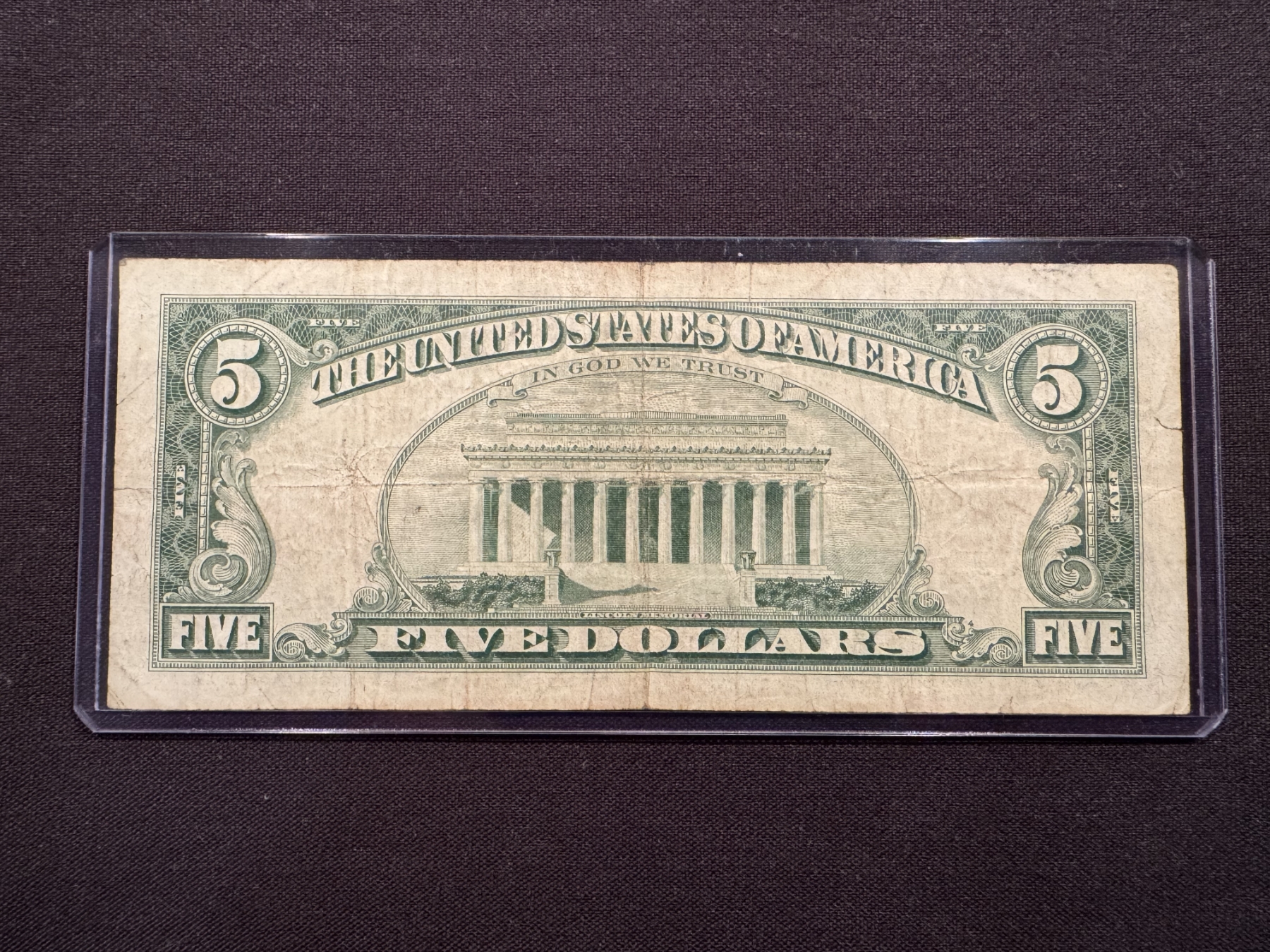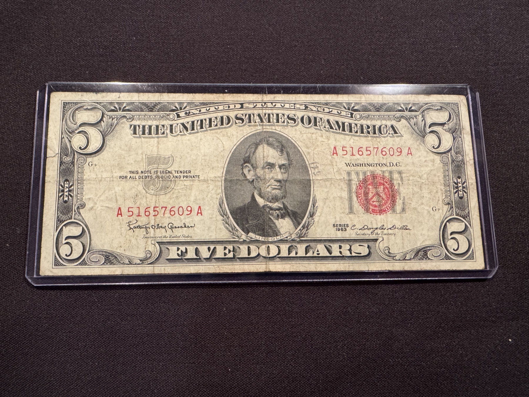 1963 United States Lincoln $5.00 Bill - Red Seal In Protective Holder - Excellent Note