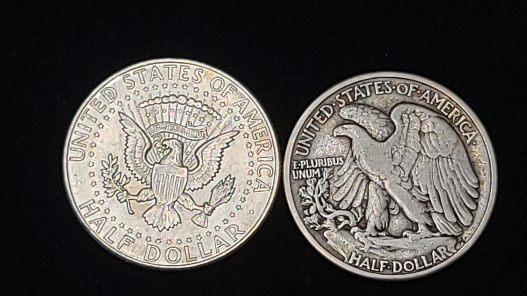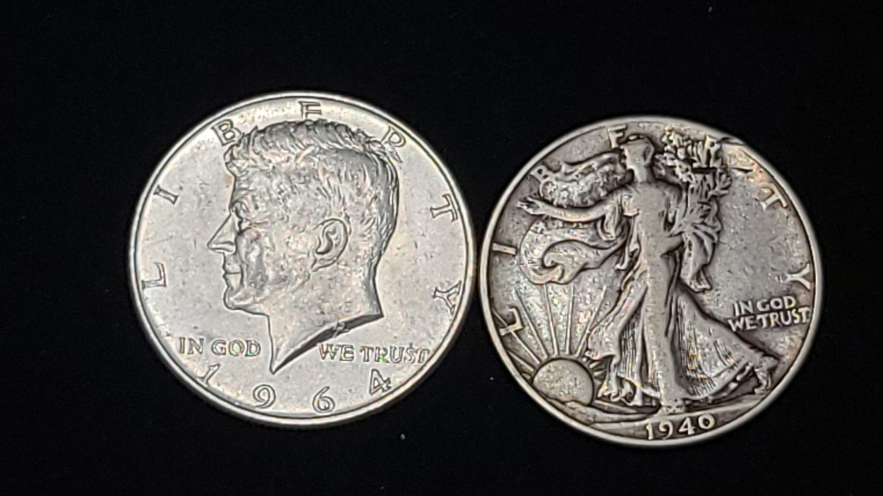 1964 90% Silver Kennedy Half Dollar & 1940 90% Silver Walking Liberty Half Dollar - Face Value $1.00