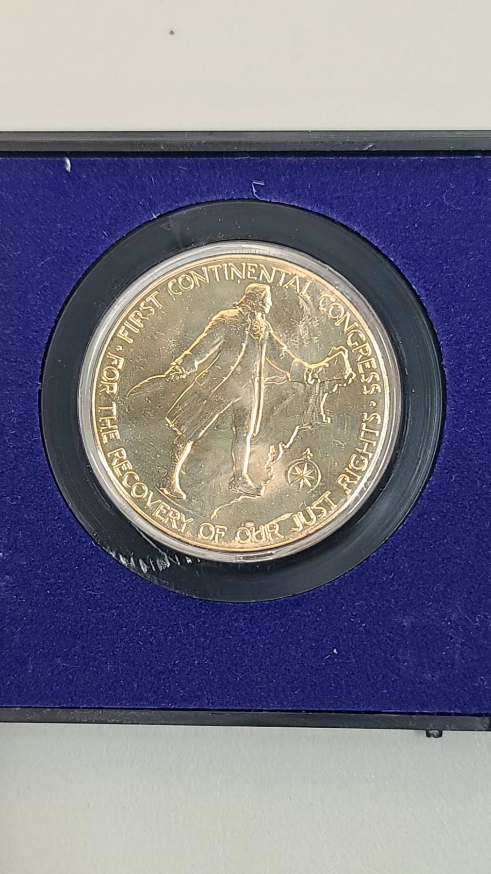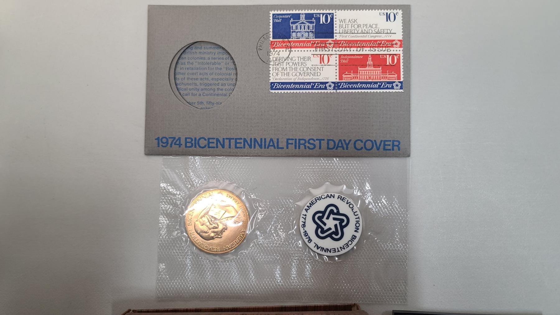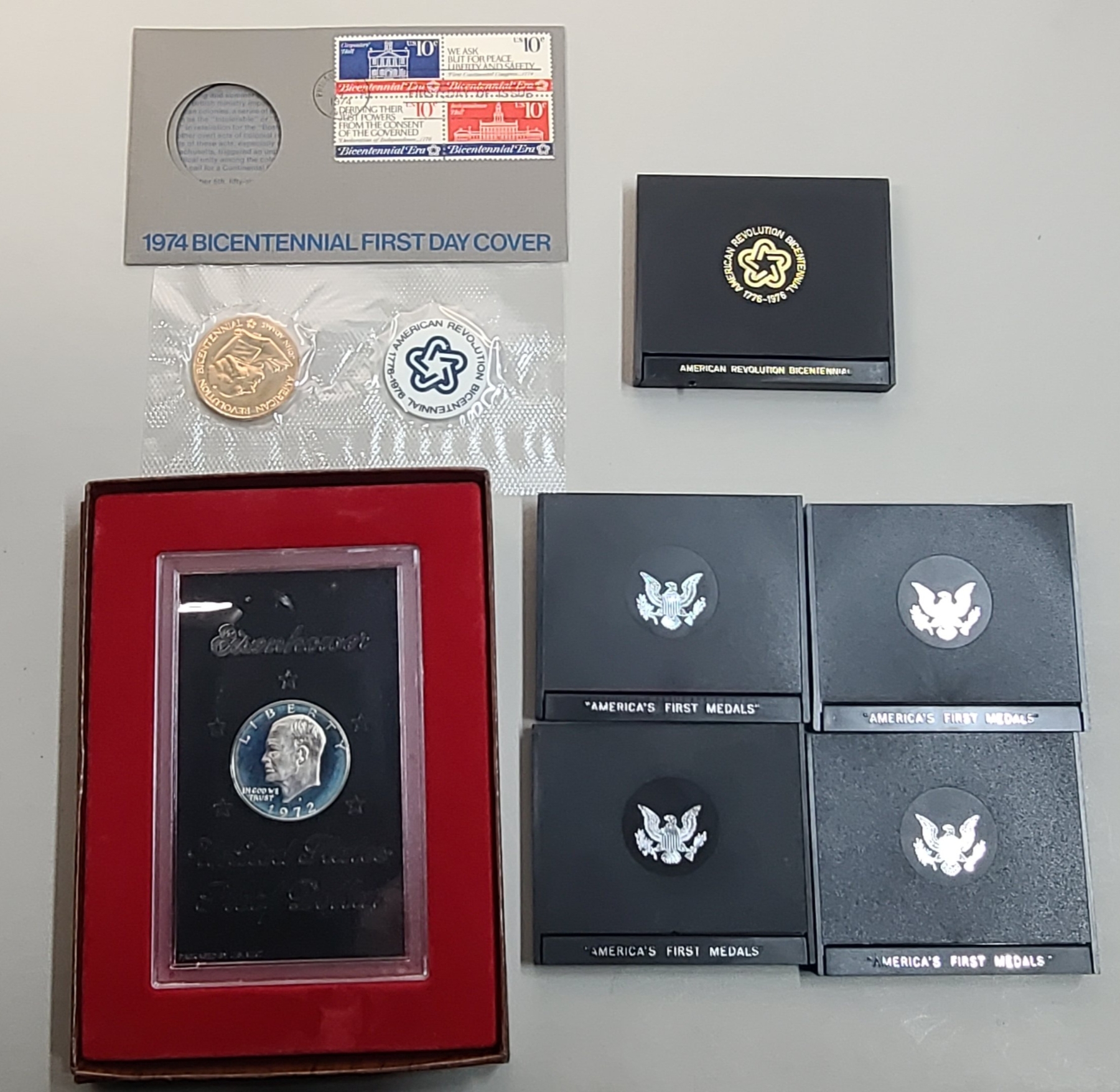 1972-S Eisenhower Uncirculated Silver Dollar Proof Coin, 1974 Bicentennial First Day Cover Medal, American Revolution Bicentennial Commemorative Medal & (4) America's First Medals