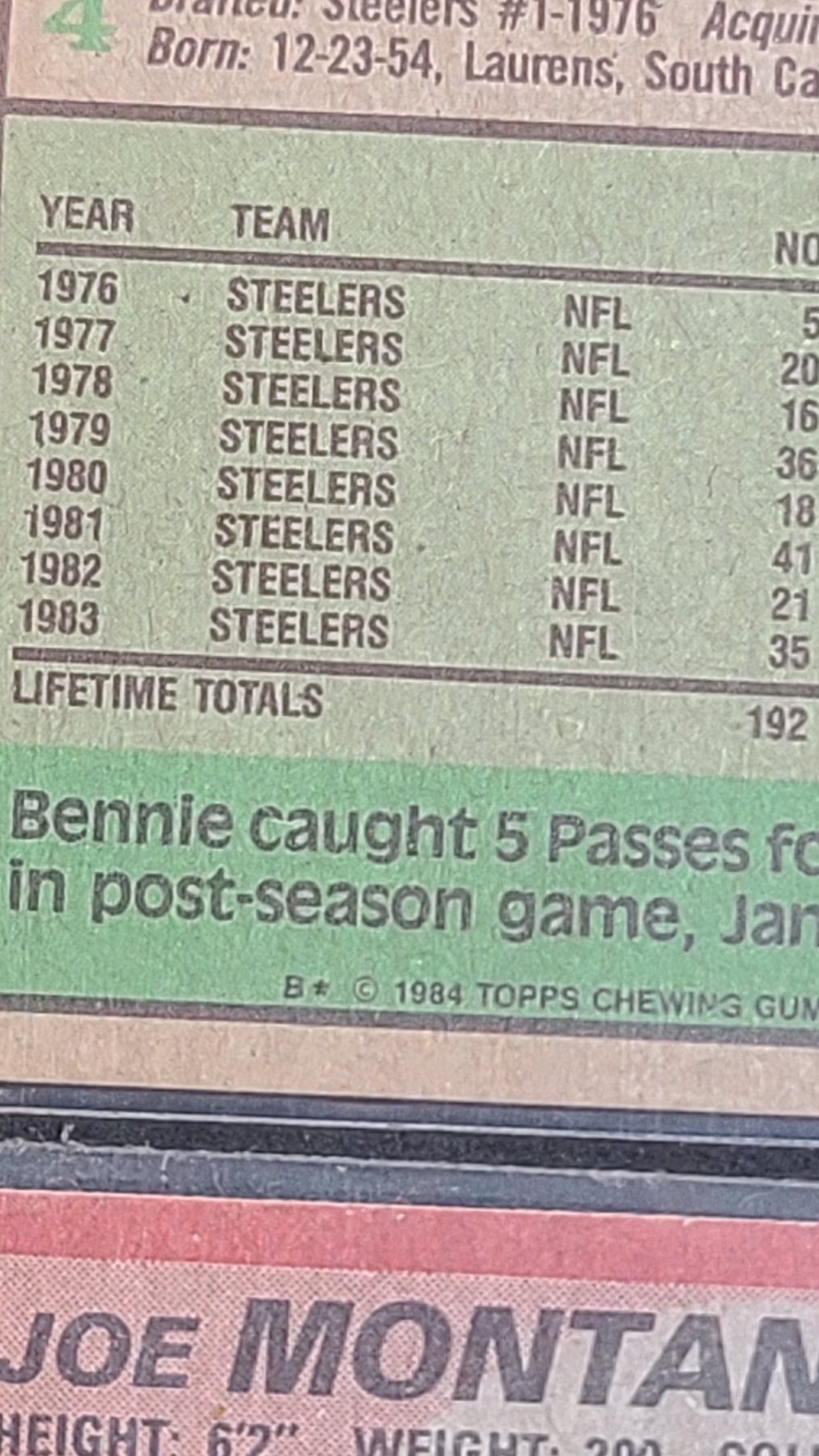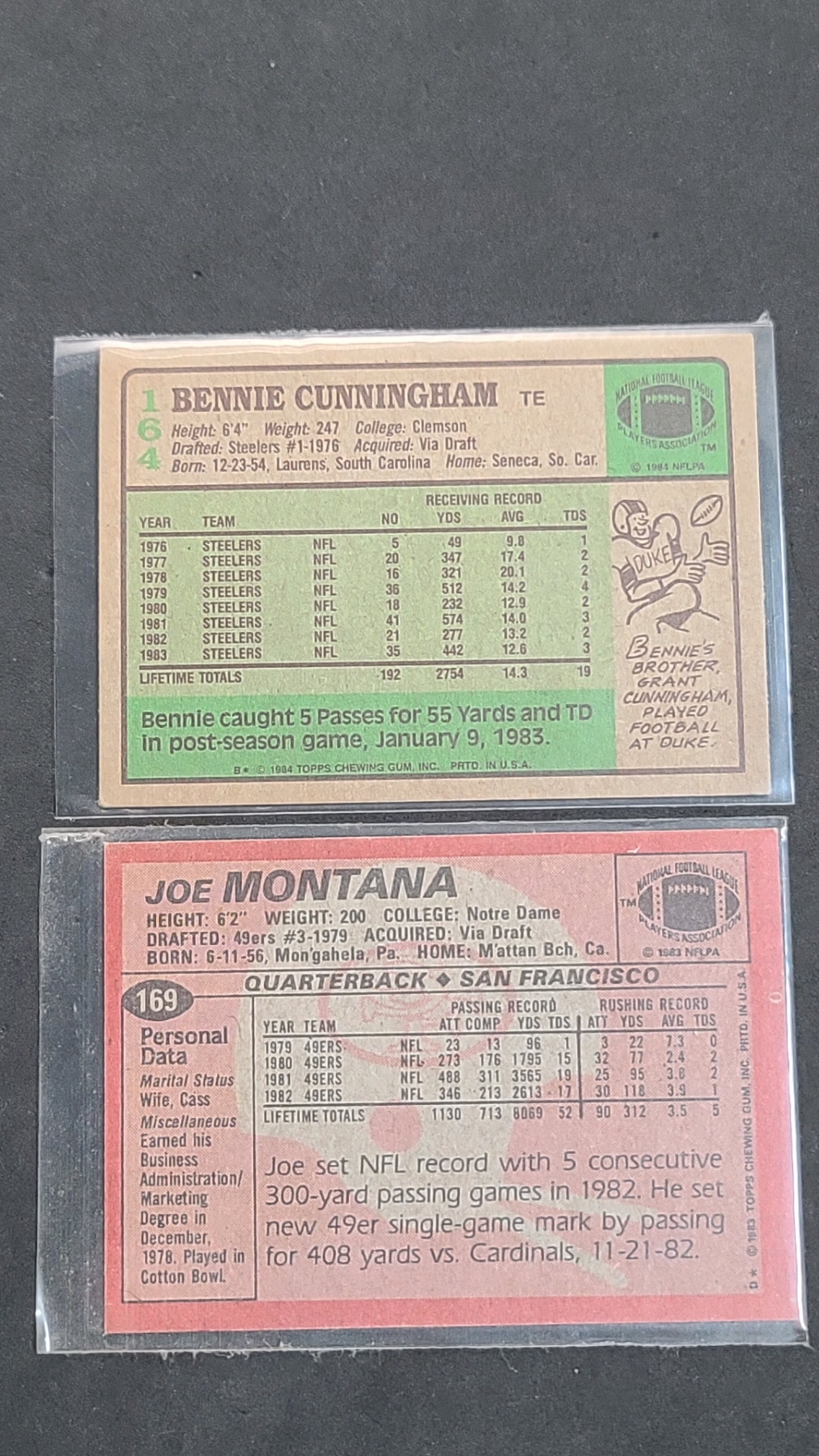 1980's Topps Bennie Cunningham Steelers & Joe Montana 49'ers Football Cards
