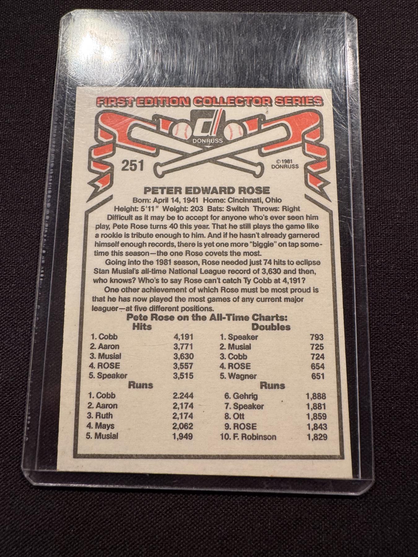 1981 Donruss Pete Rose Baseball Card #251 - in Protective Card Sleeve - Mint Condition