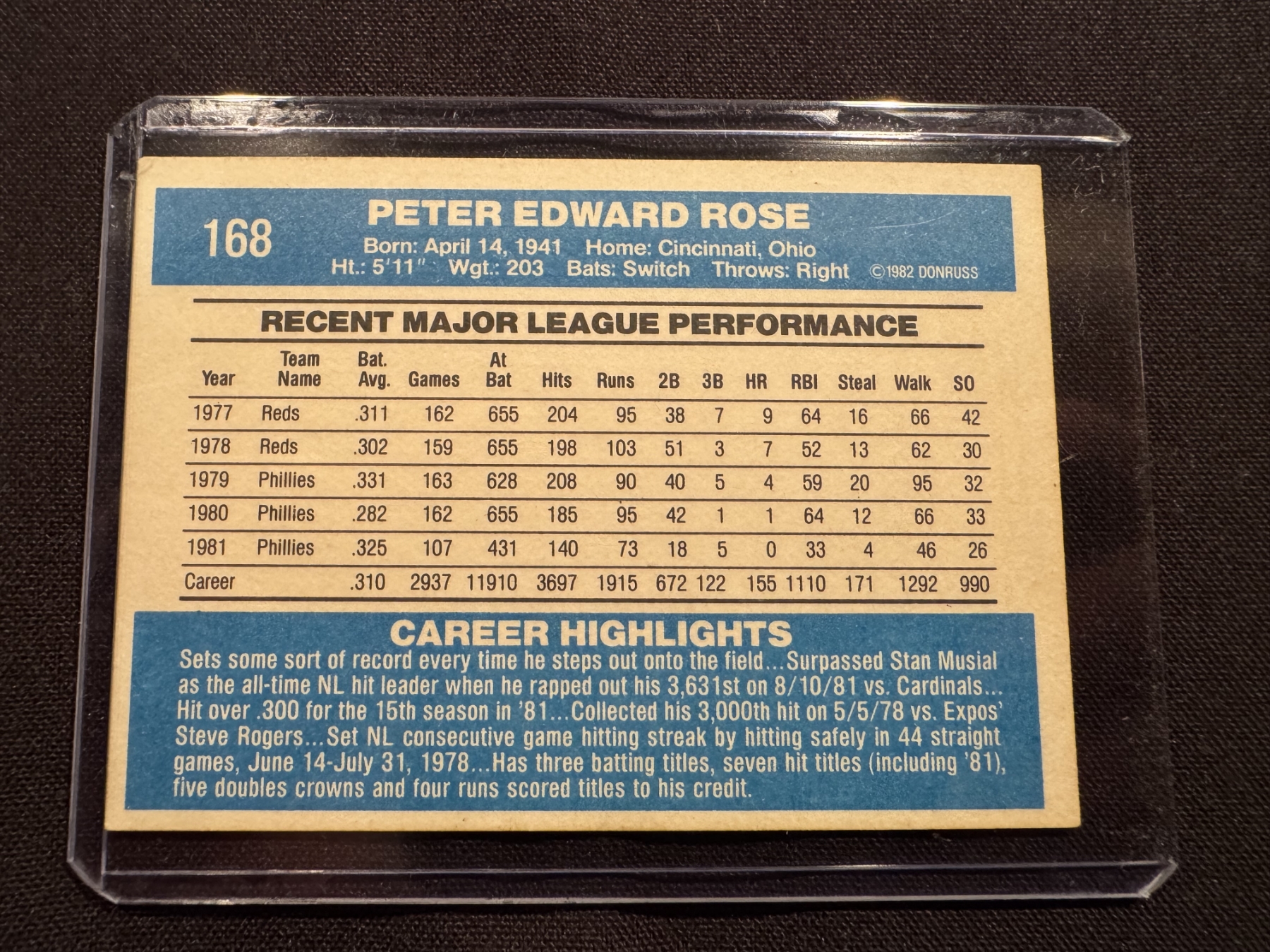 1982 Donruss Pete Rose Phillies Baseball Card - Mint Condition