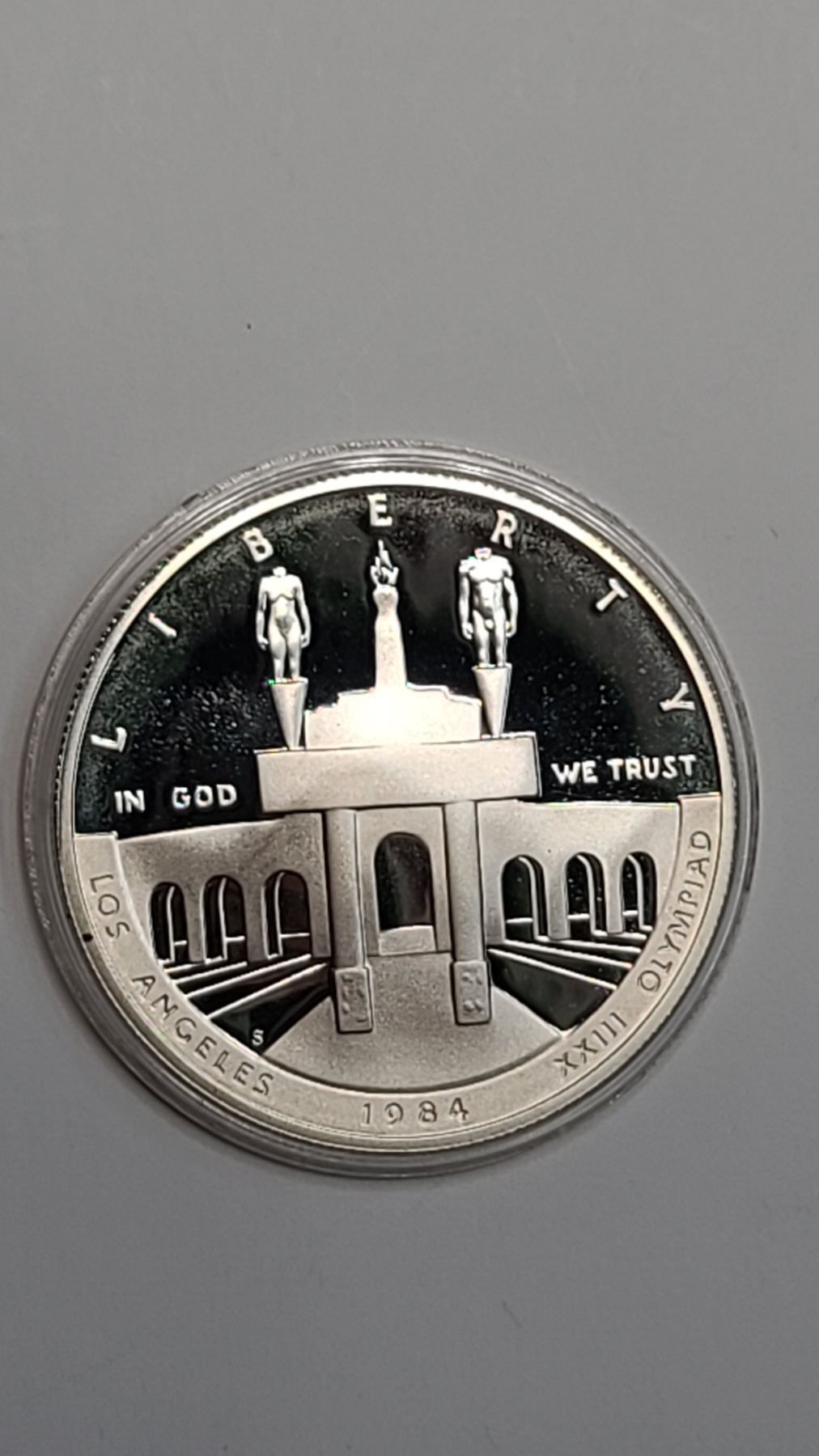 1984-S Los Angeles XXIII Olympiad Coliseum Commemorative 90% Silver Proof Dollar Coin In Coin Capsule