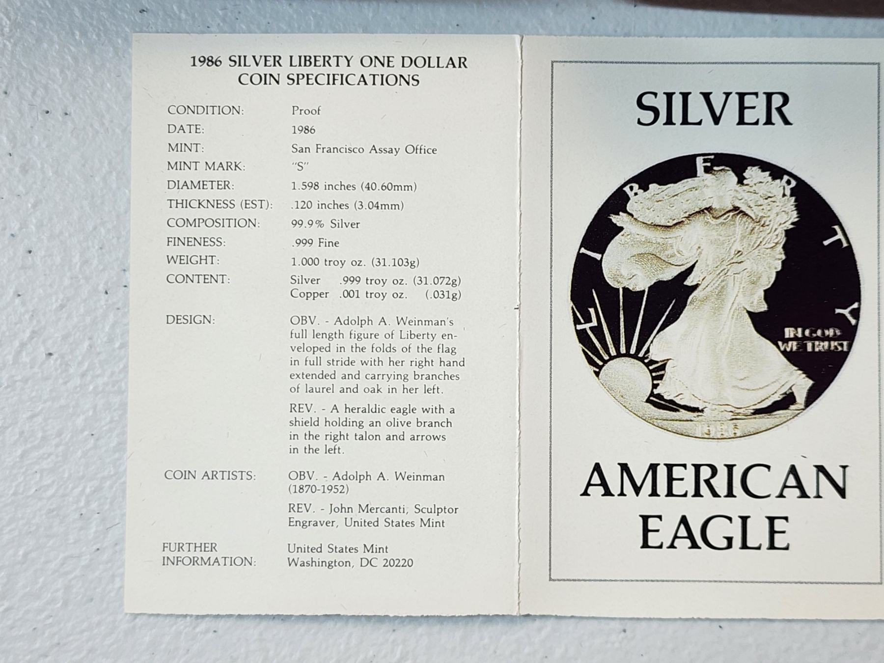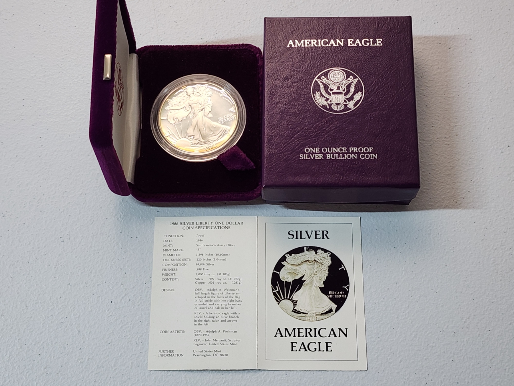 1986-S Silver $1 American Silver Eagle Proof Coin 1 oz Fine Silver with Original Box and COA