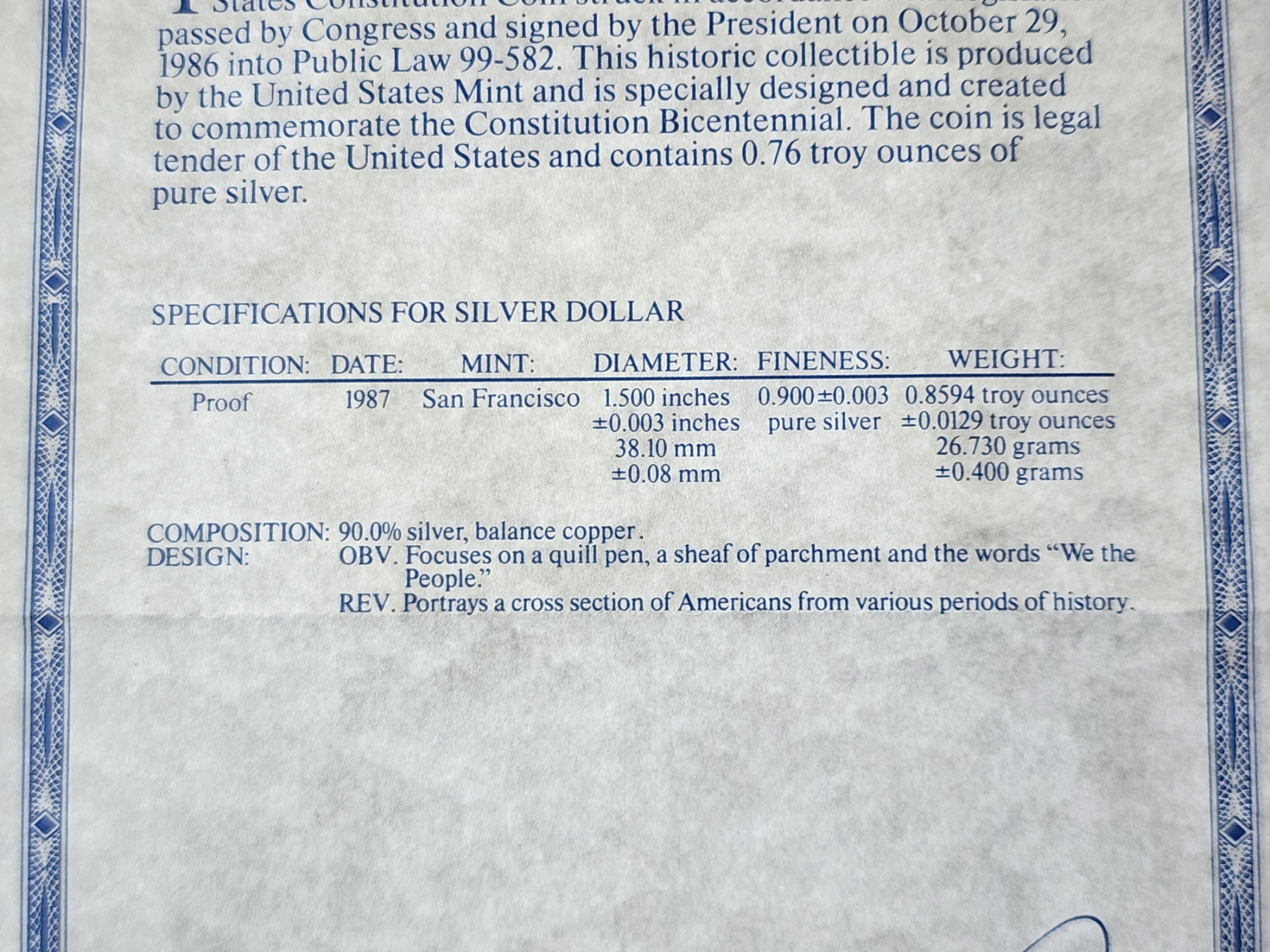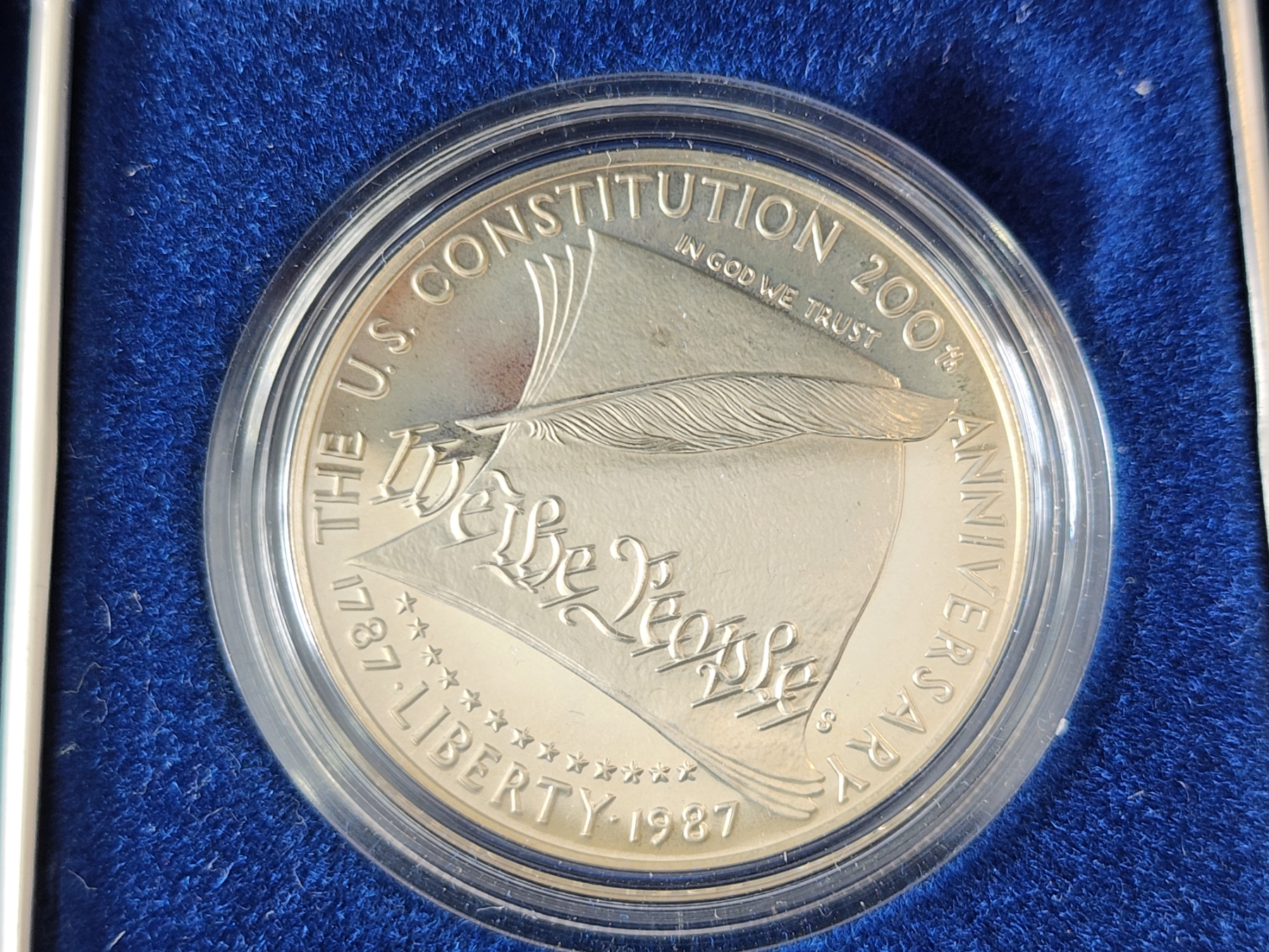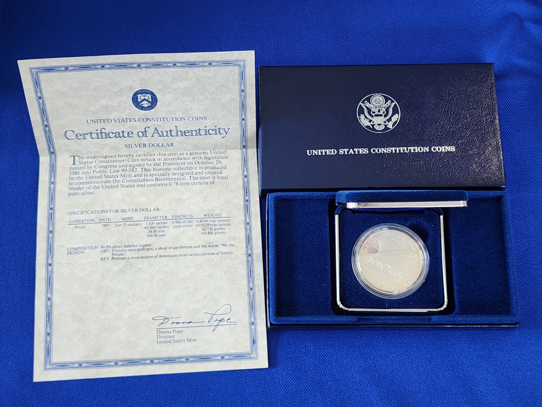 1987 U.S. Constitution 90% Silver Dollar Proof w/ Box & CoA