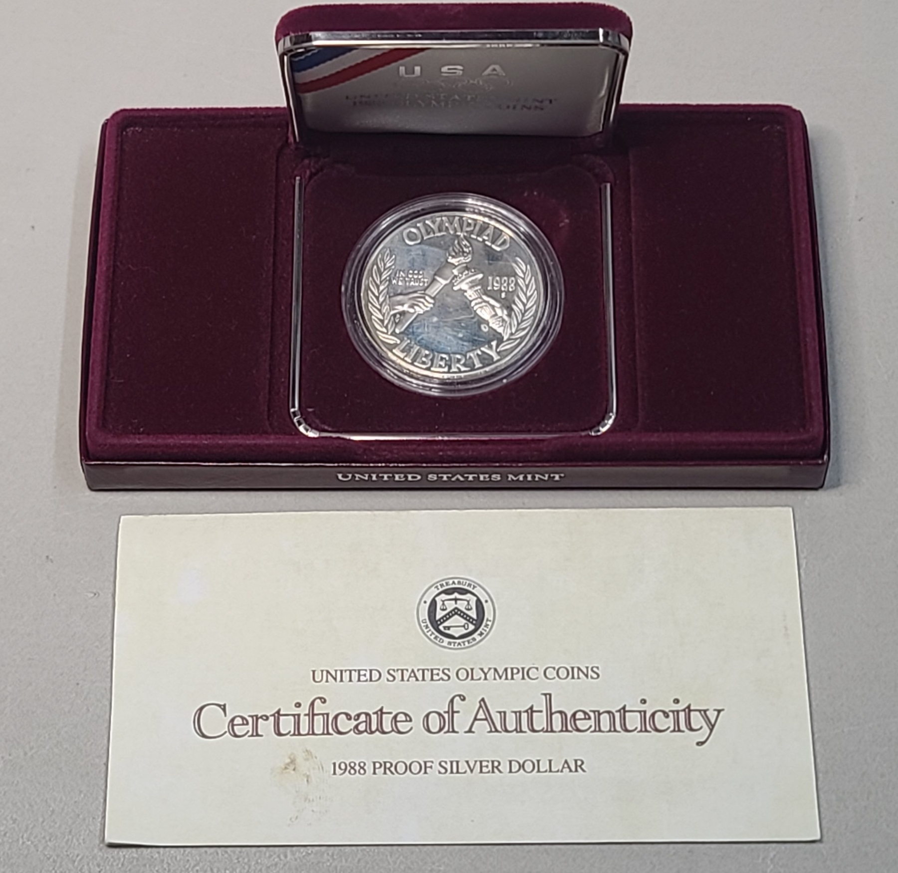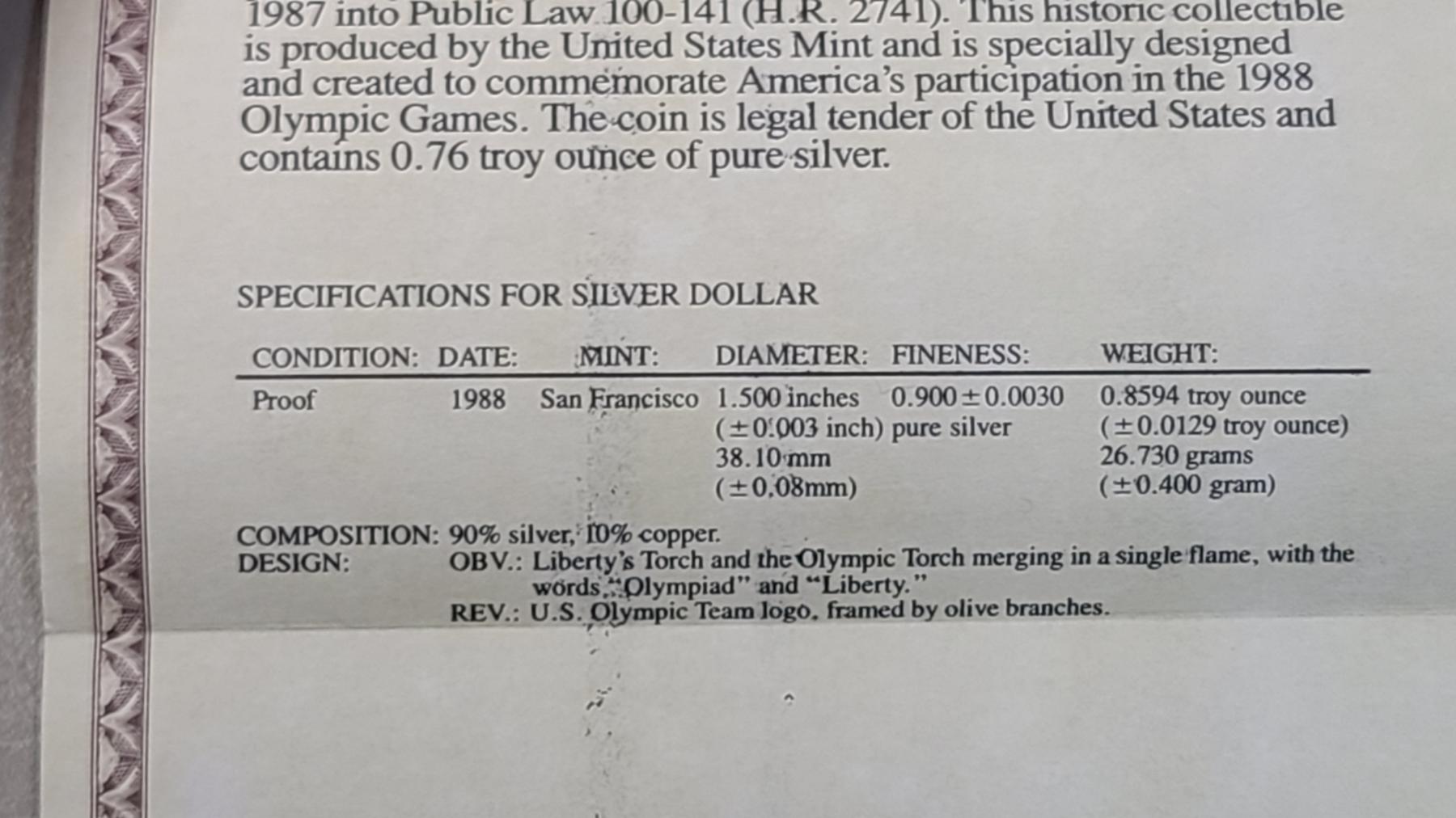 1988 U.S Olympic Commemorative 90% Silver Dollar With COA