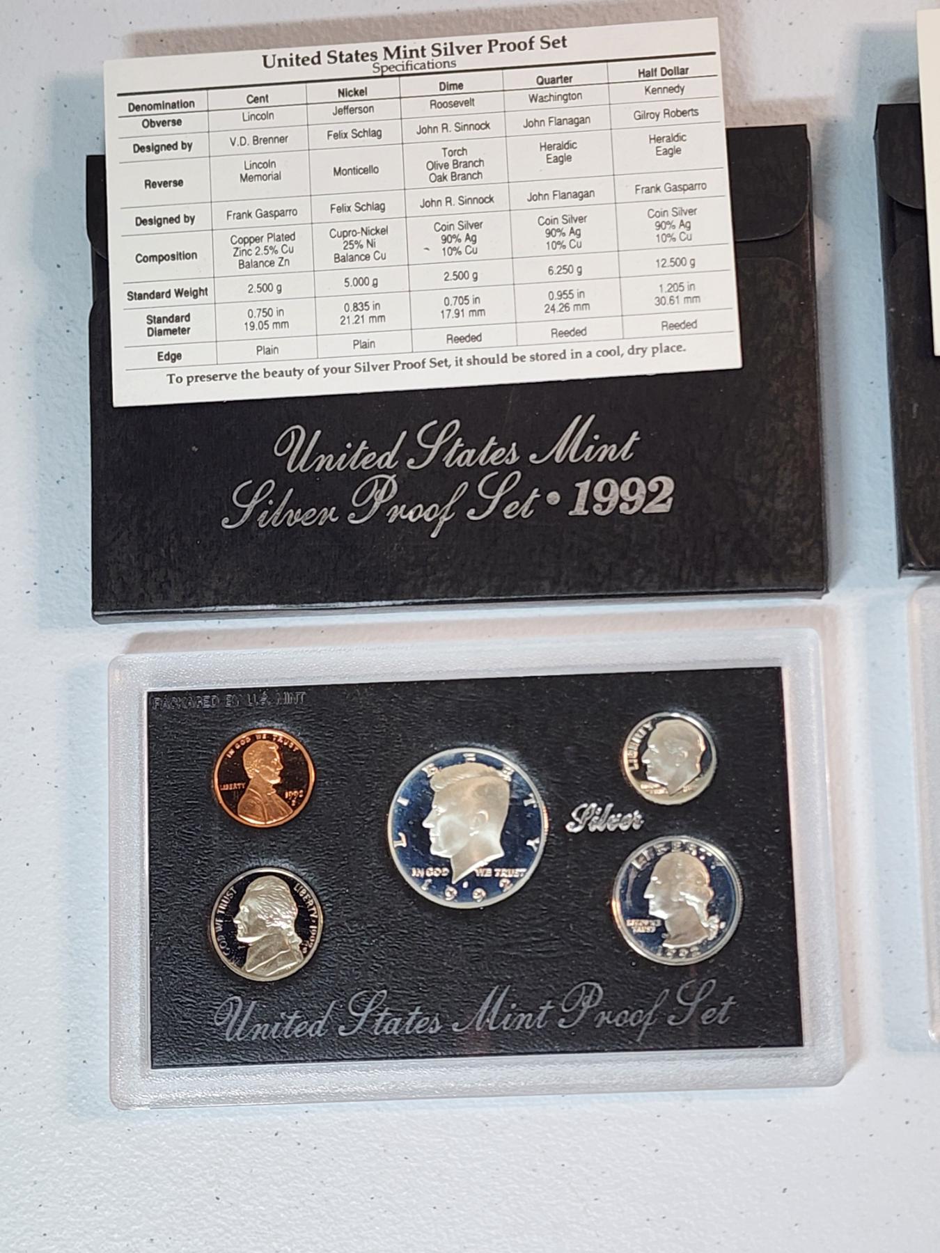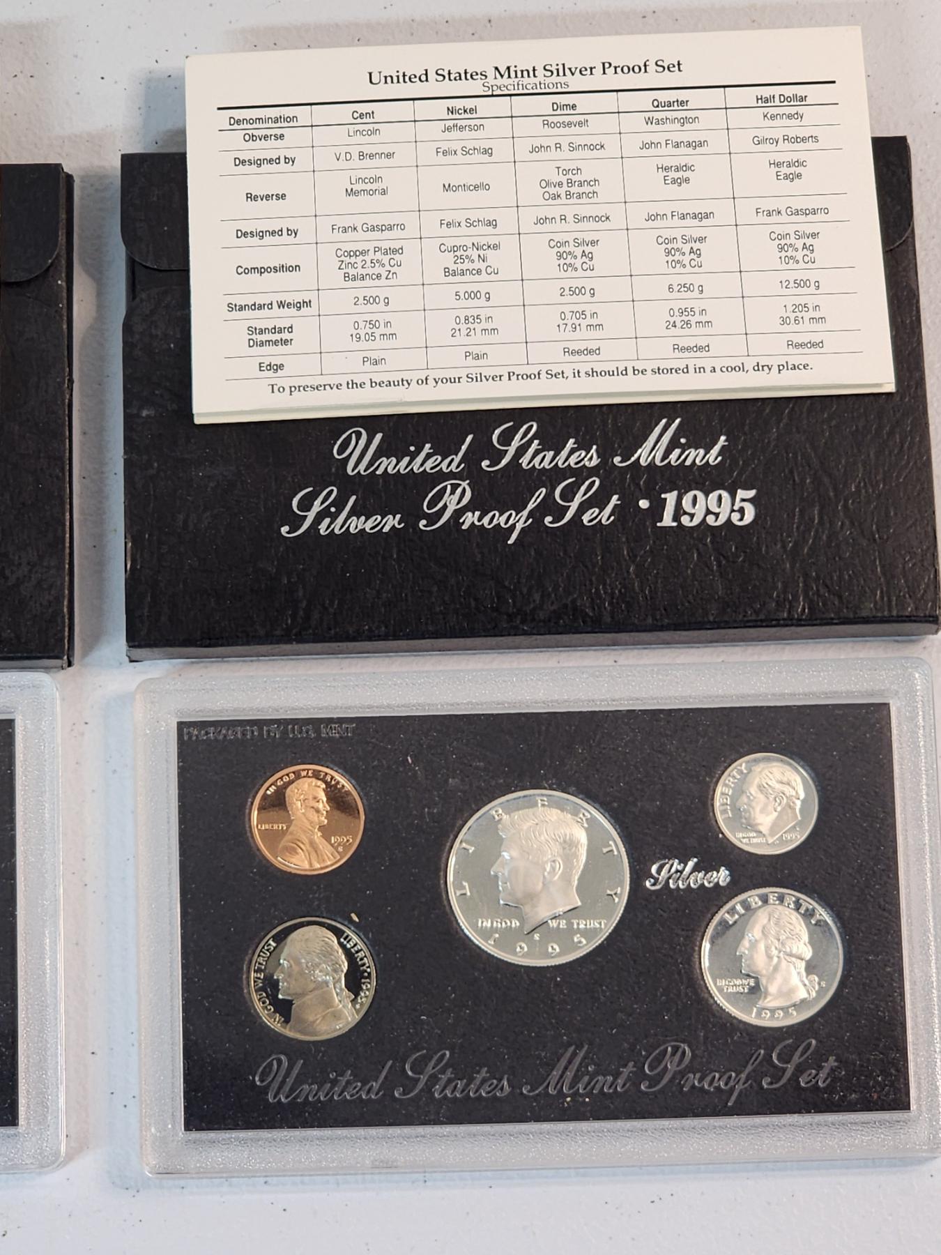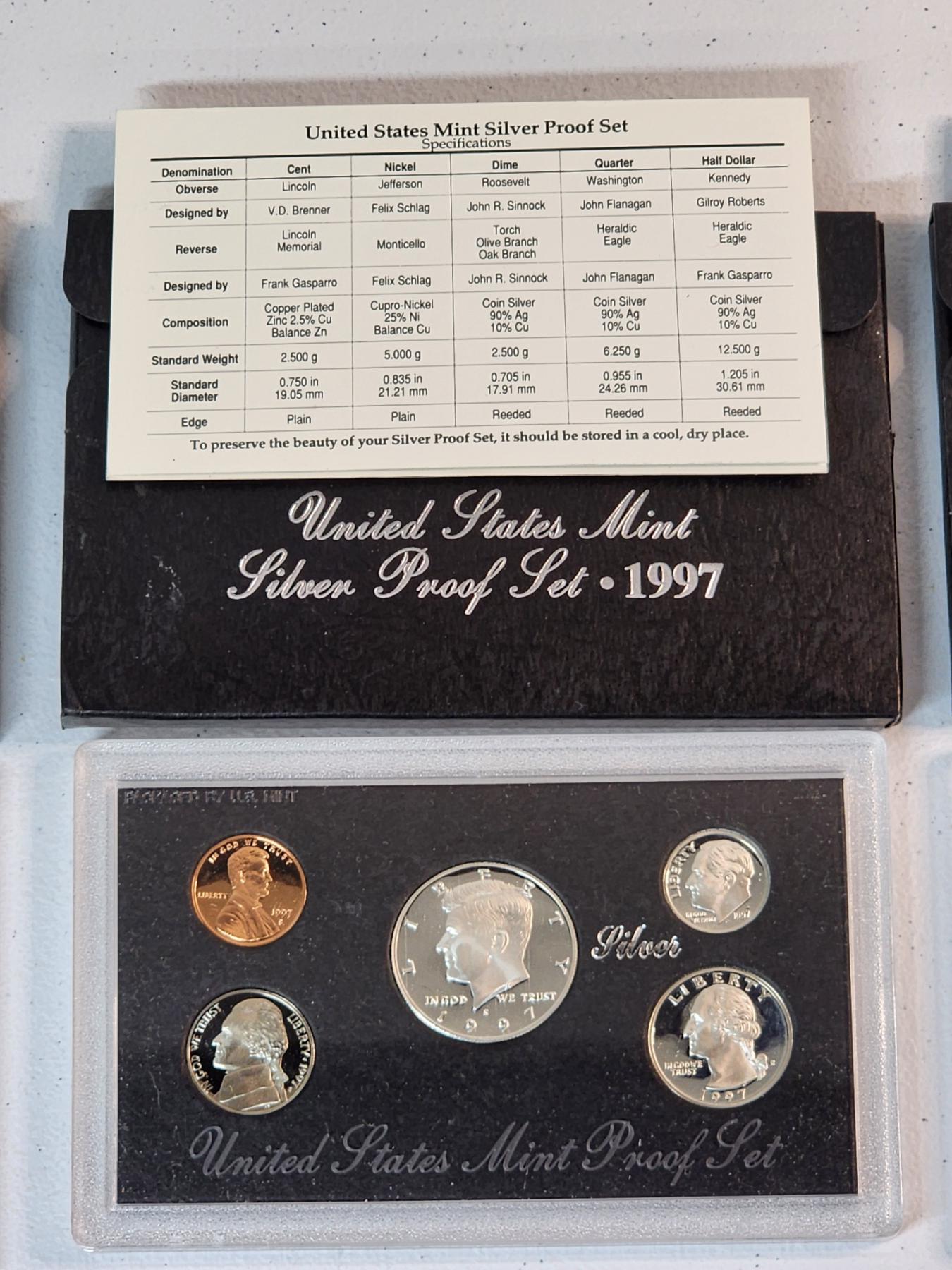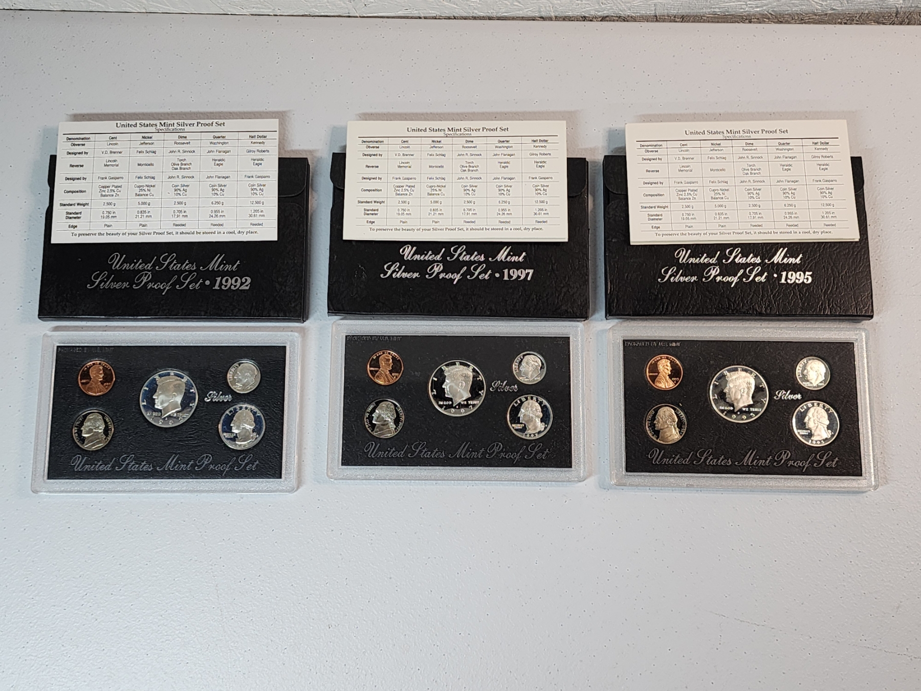 1992, 1997, and 1995 United States Mint Silver Proof Set with Boxes and COA