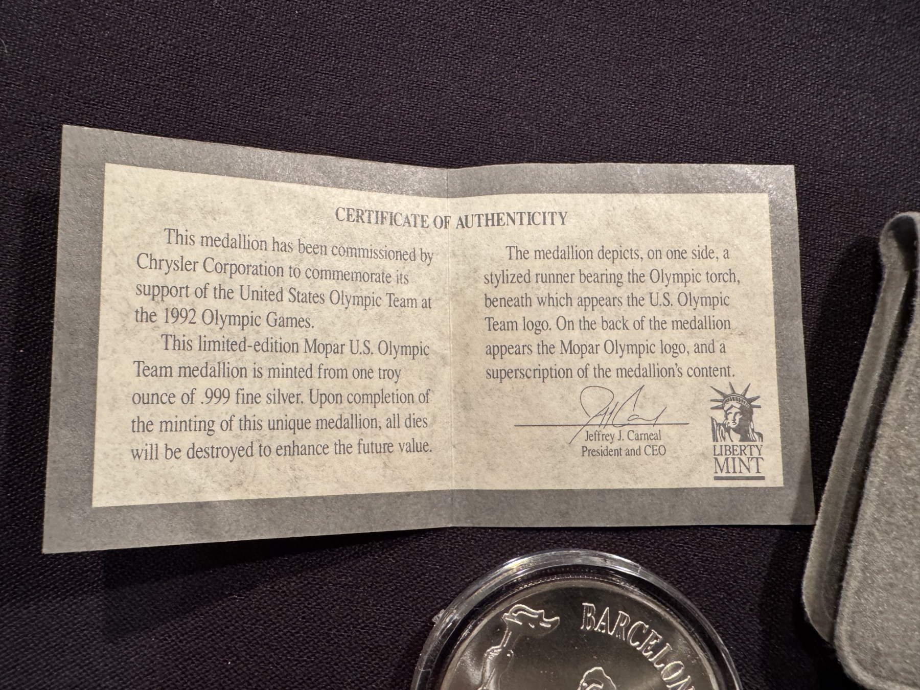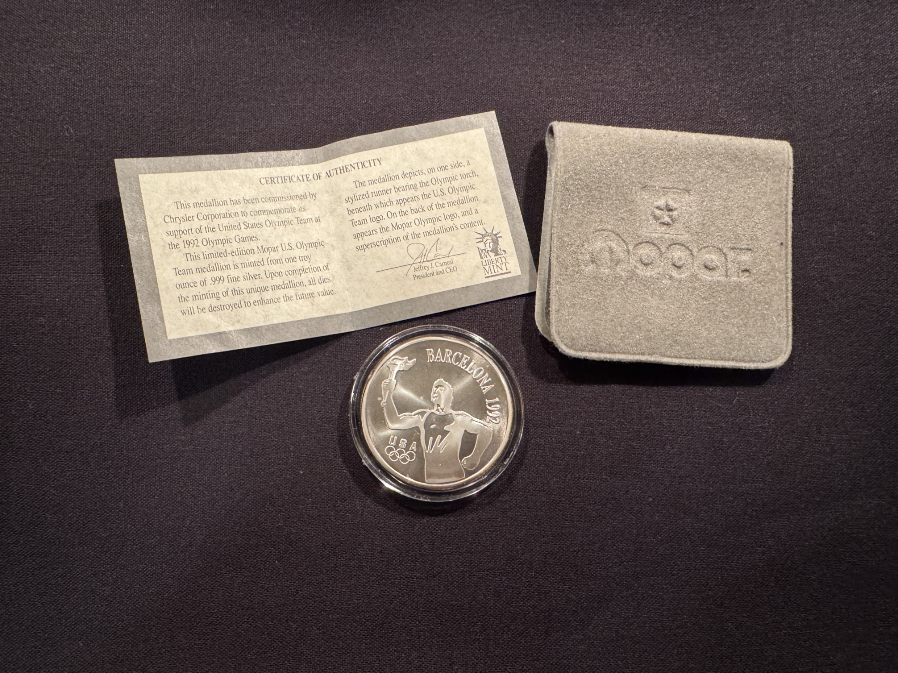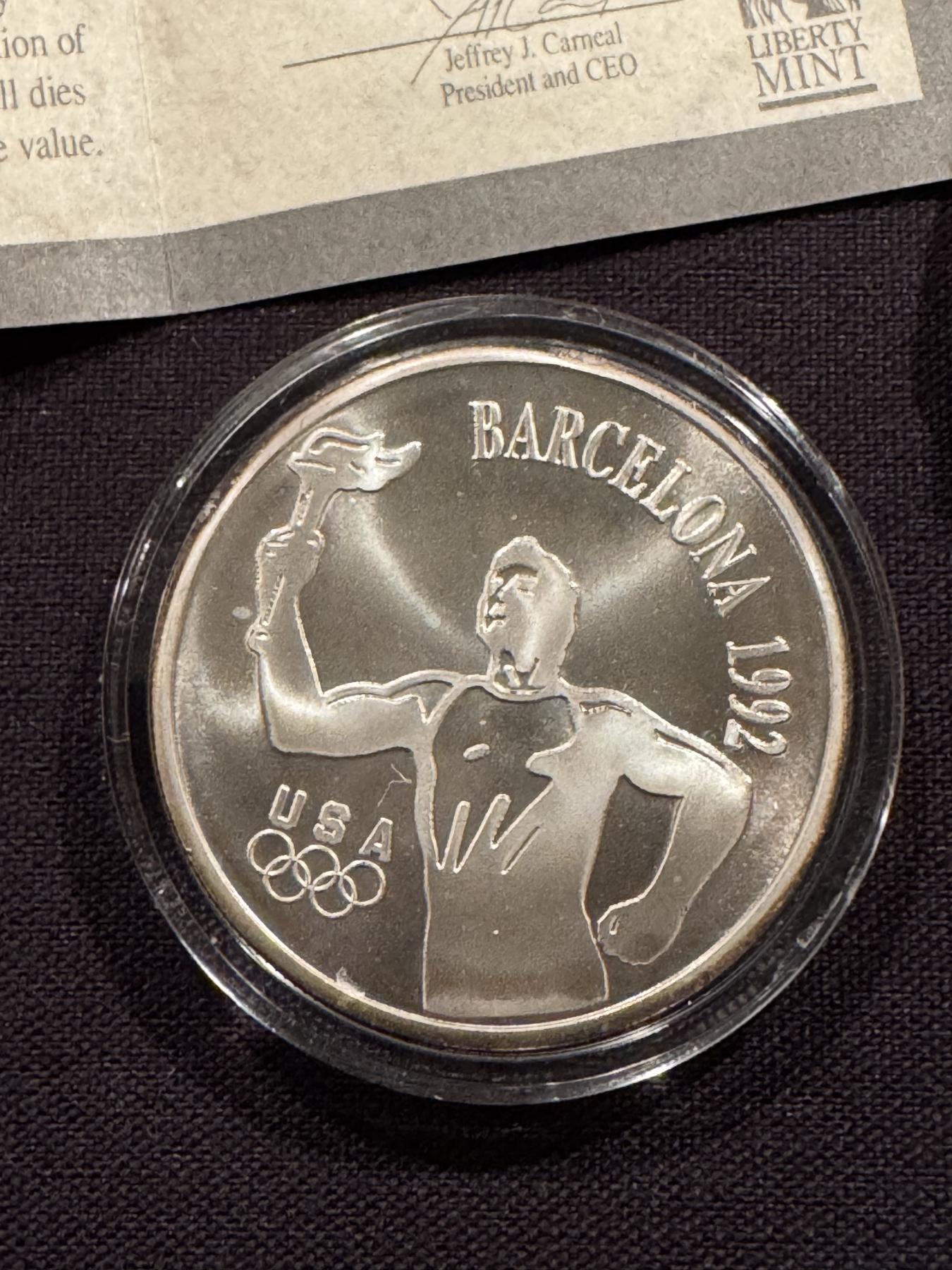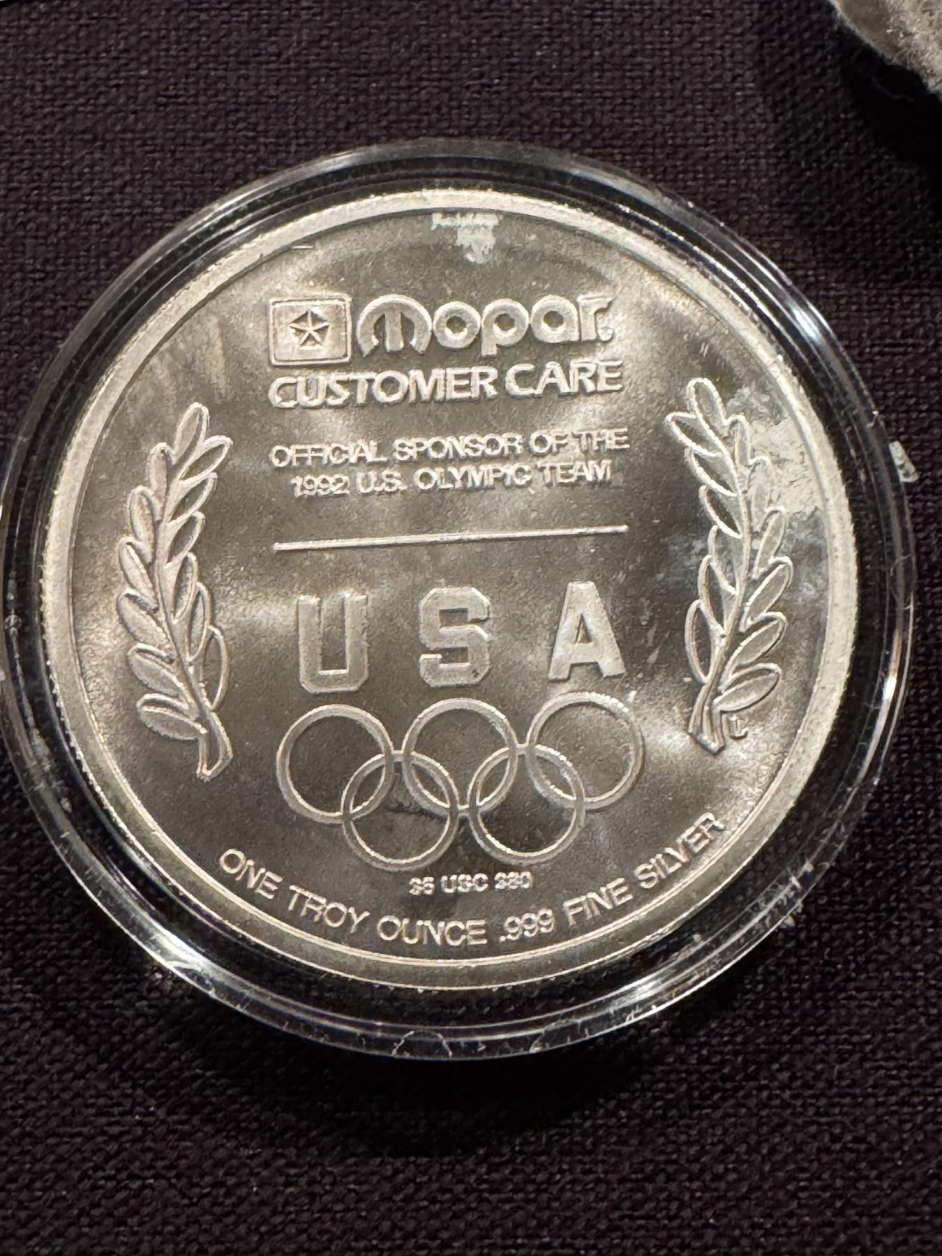 1992 Barcelona Olympics Mopar Coin 1 Troy Oz .999 Fine Silver In Holder - Harder To Find