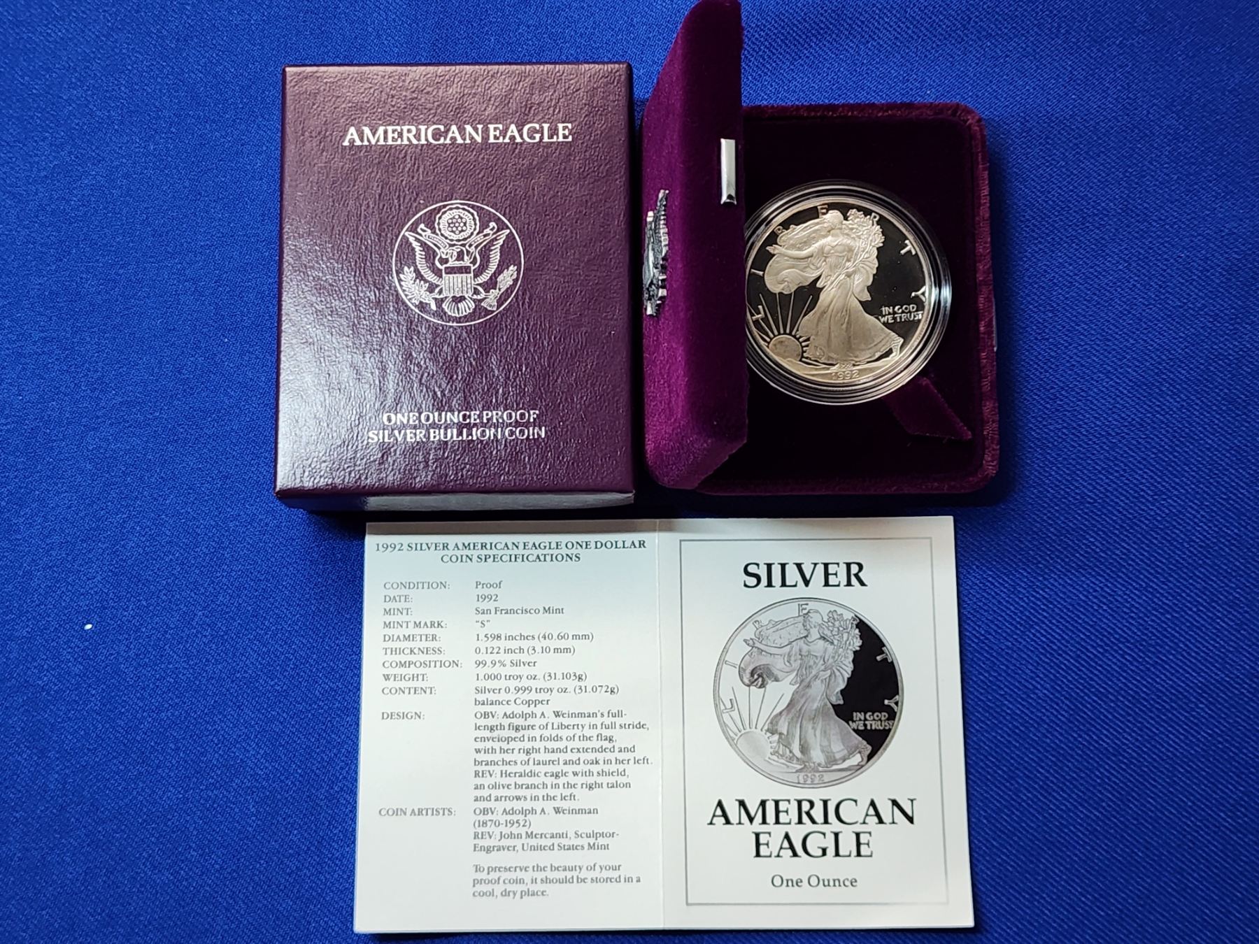 1992-S Silver American Eagle $1 Proof - 1 Troy Ounce 99.9% Silver w/ Original Box & COA