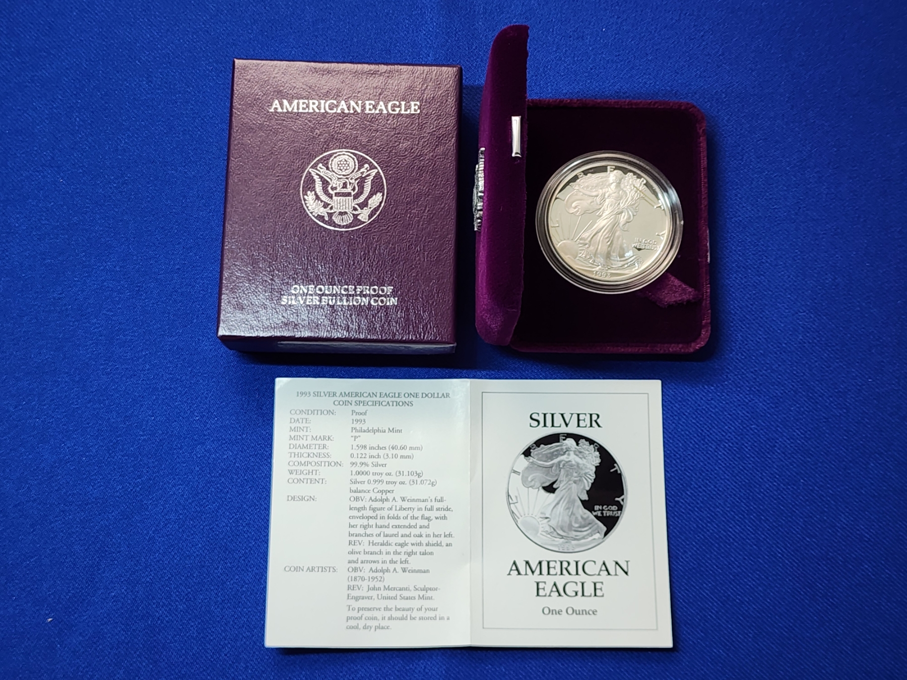 1993 Silver American Eagle $1 Proof - 1 Troy Ounce 99.9% Silver w/ Original Box & COA