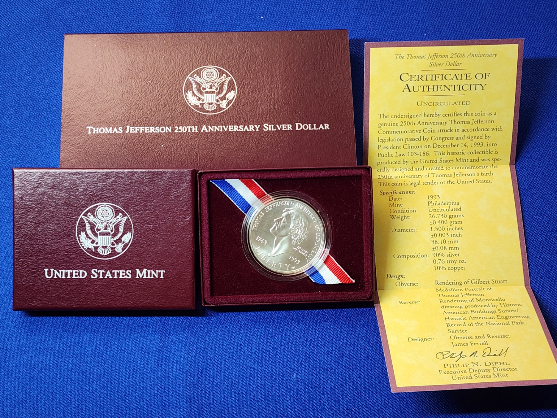 1993 Thomas Jefferson 250th Anniversary Silver Dollar 0.76 troy oz. 90% Silver Coin