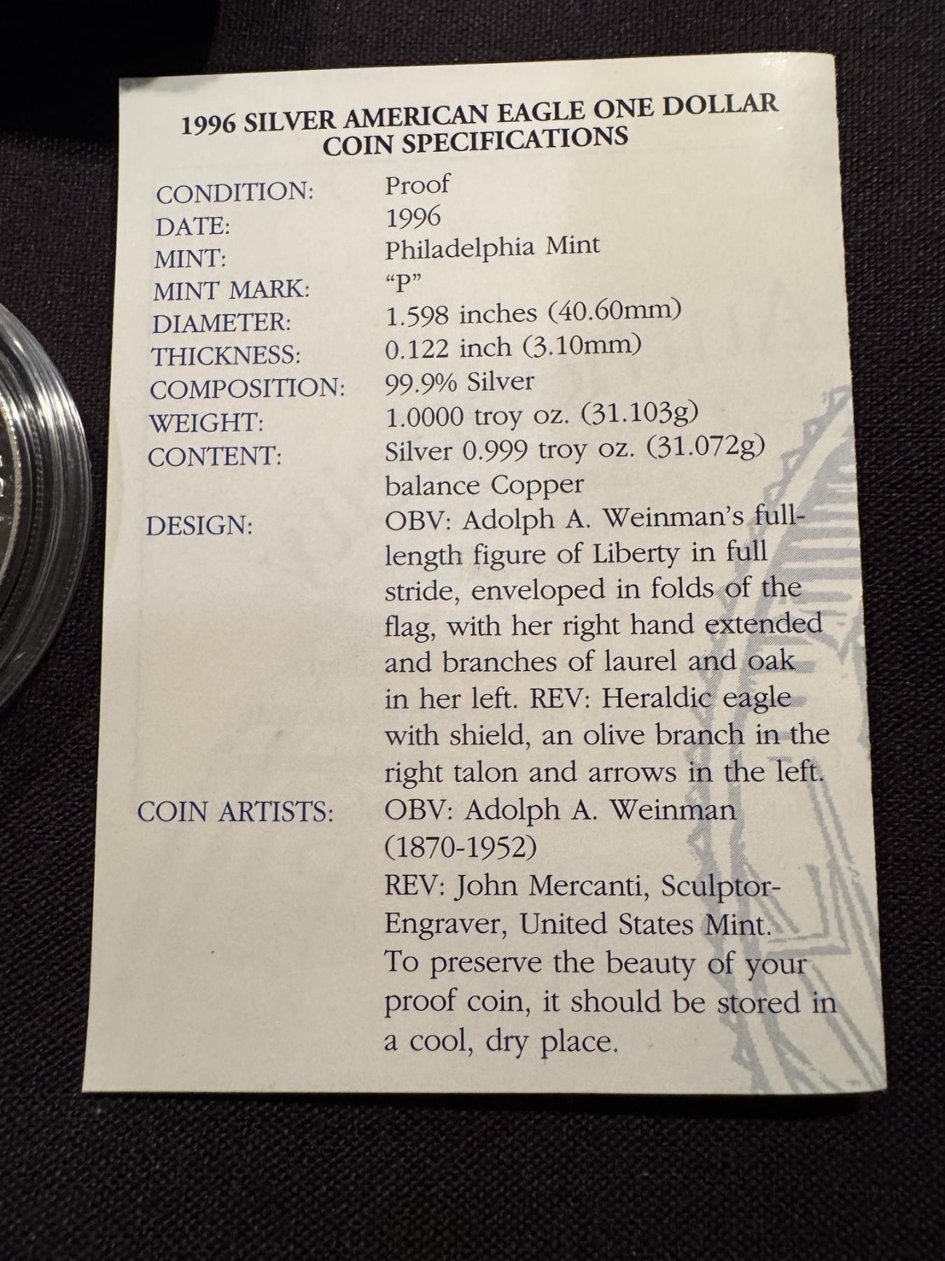 1996-P American Eagle One Ounce Proof Silver Bullion Coin - Low Mintage - Mint Condition