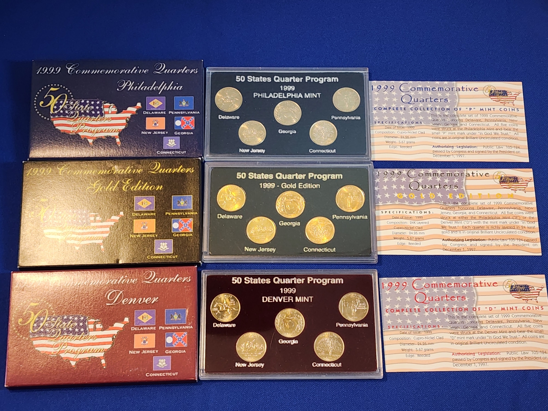 1999 Commemorative Quarter Sets: Philadelphia Mint, Denver Mint, & Gold Edition