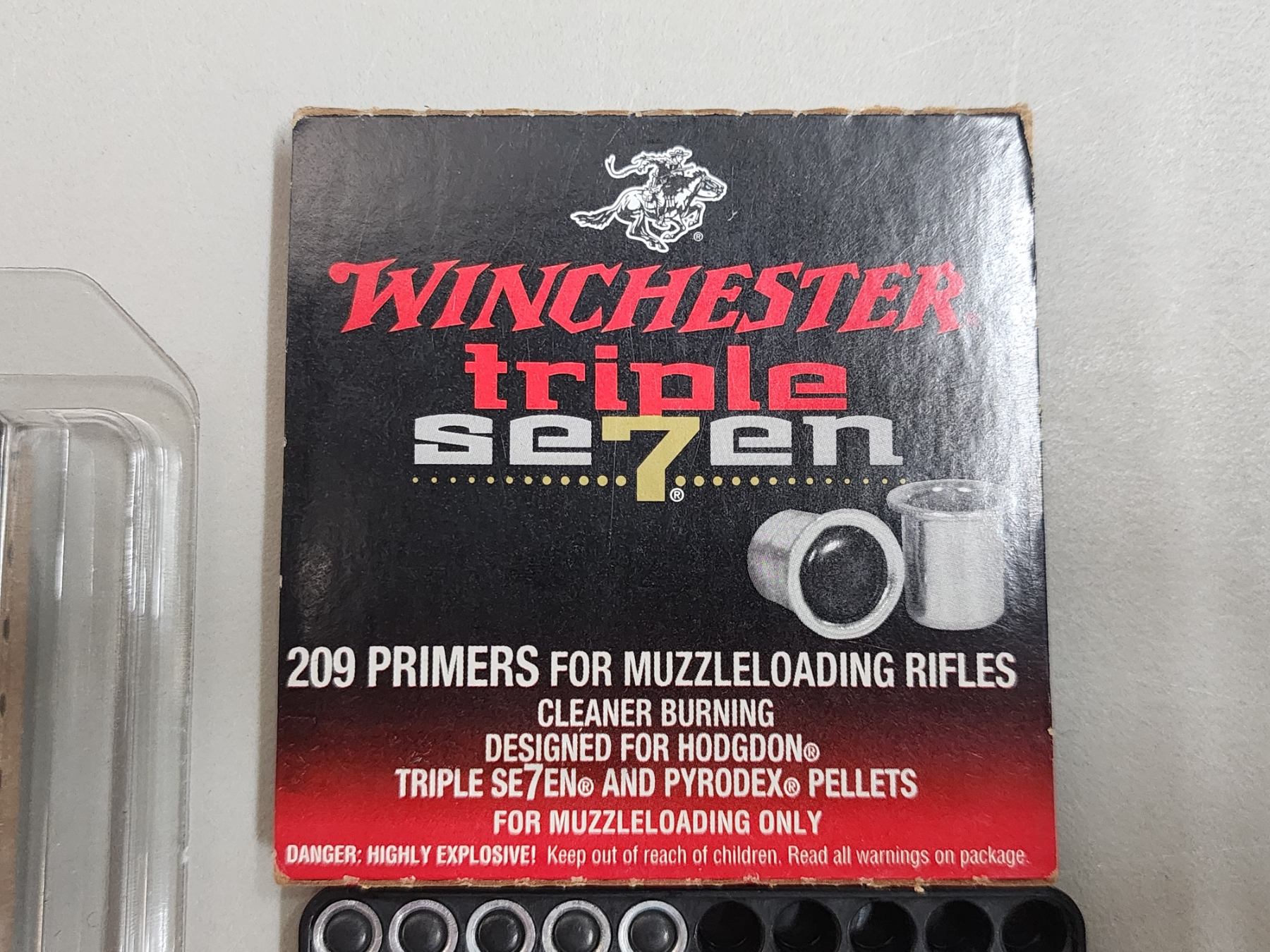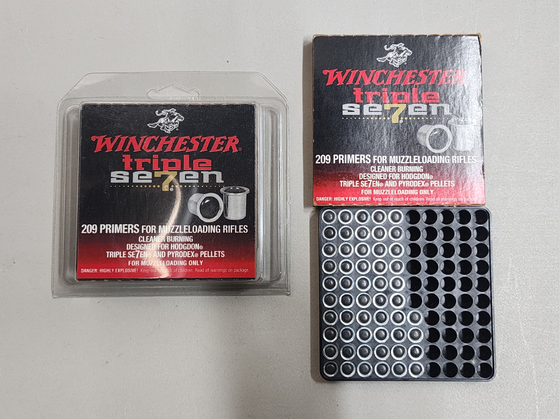 2 Boxes of Winchester Triple Se7en 209 Muzzleloading Primers - One Box Sealed One Opened (154 Total)