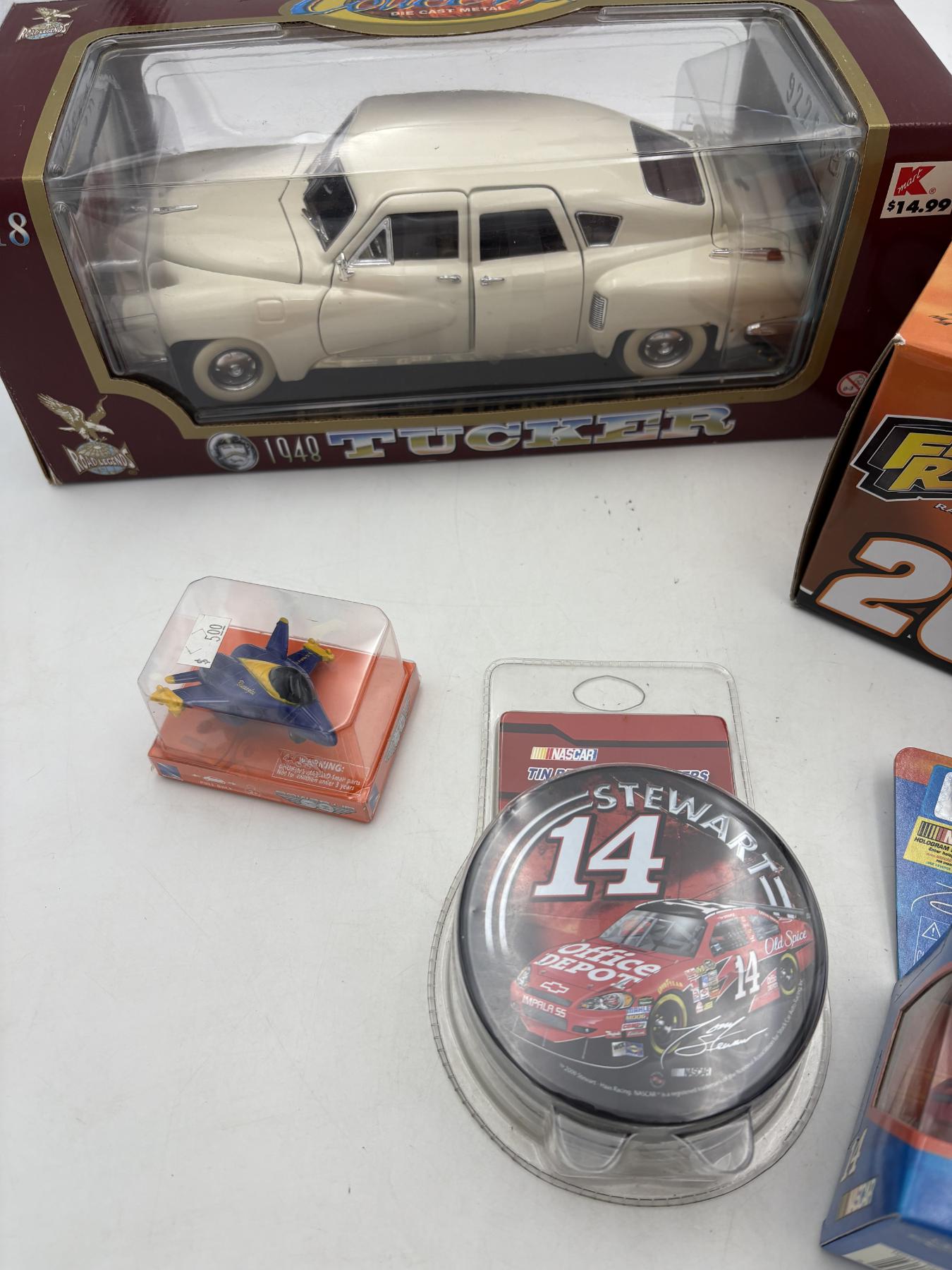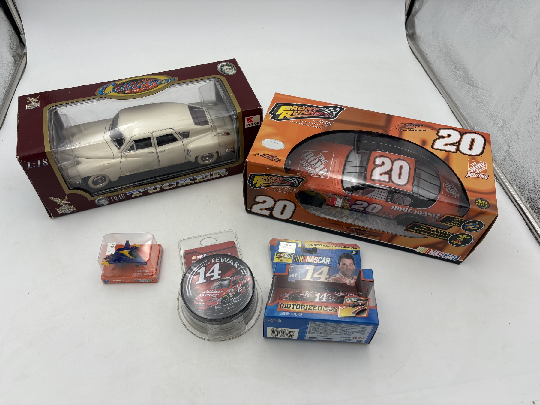 2 Collectible Cars - Small Car - Old Spice Stewart 14 - Small Airplane - In Packaging - 1948 Tucker Road Legends 1:18 Collection Die Cast Metal - The Home Depot Nascar 20 Front Runners