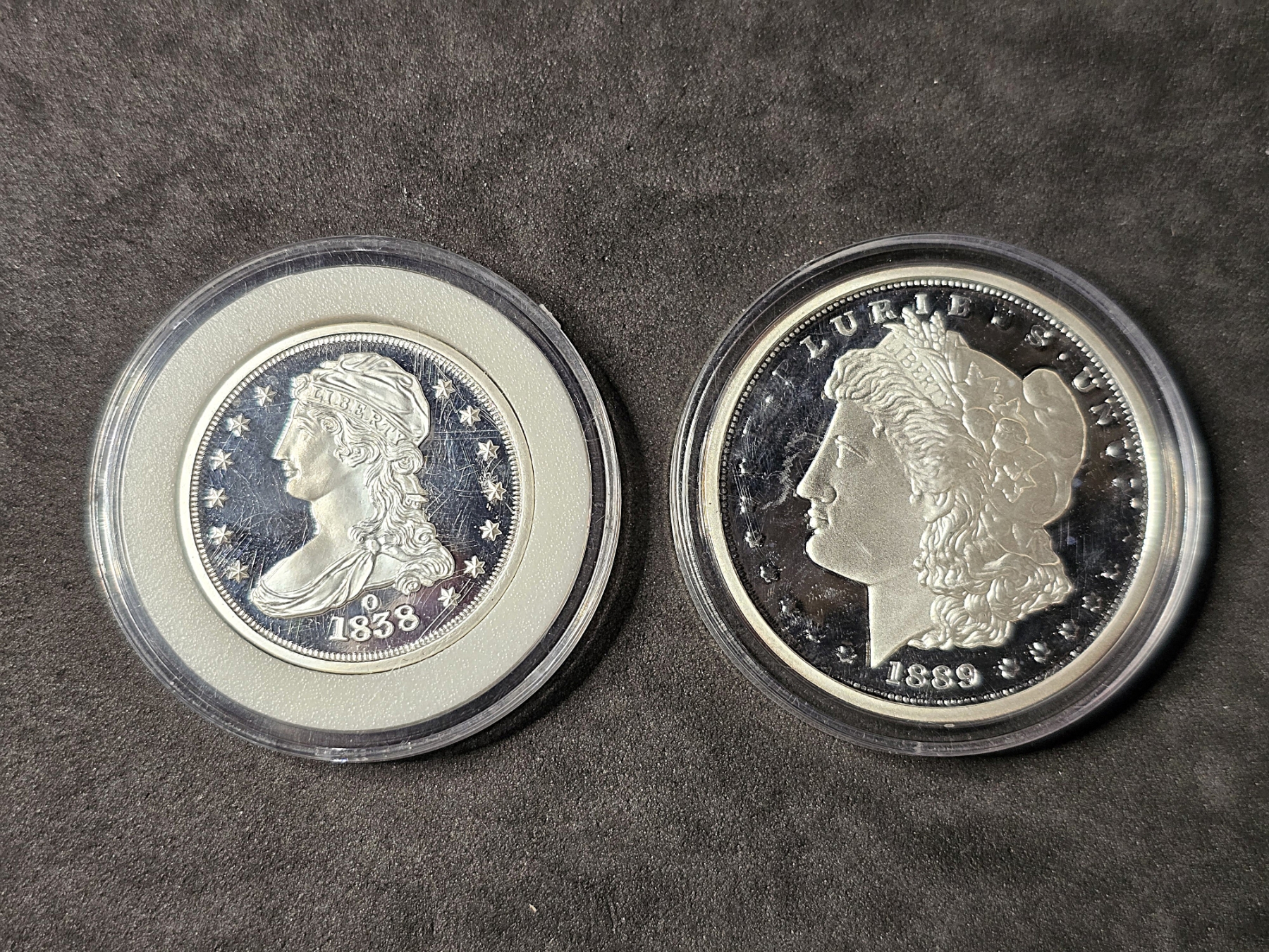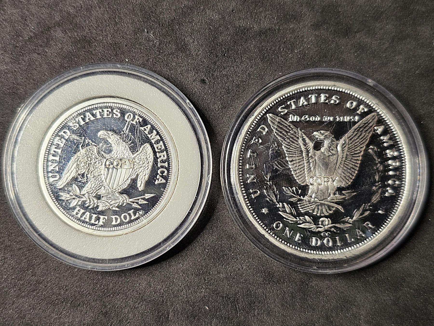 (2) Educational Replica Coins - Morgan Silver Dollar & Half Dollar