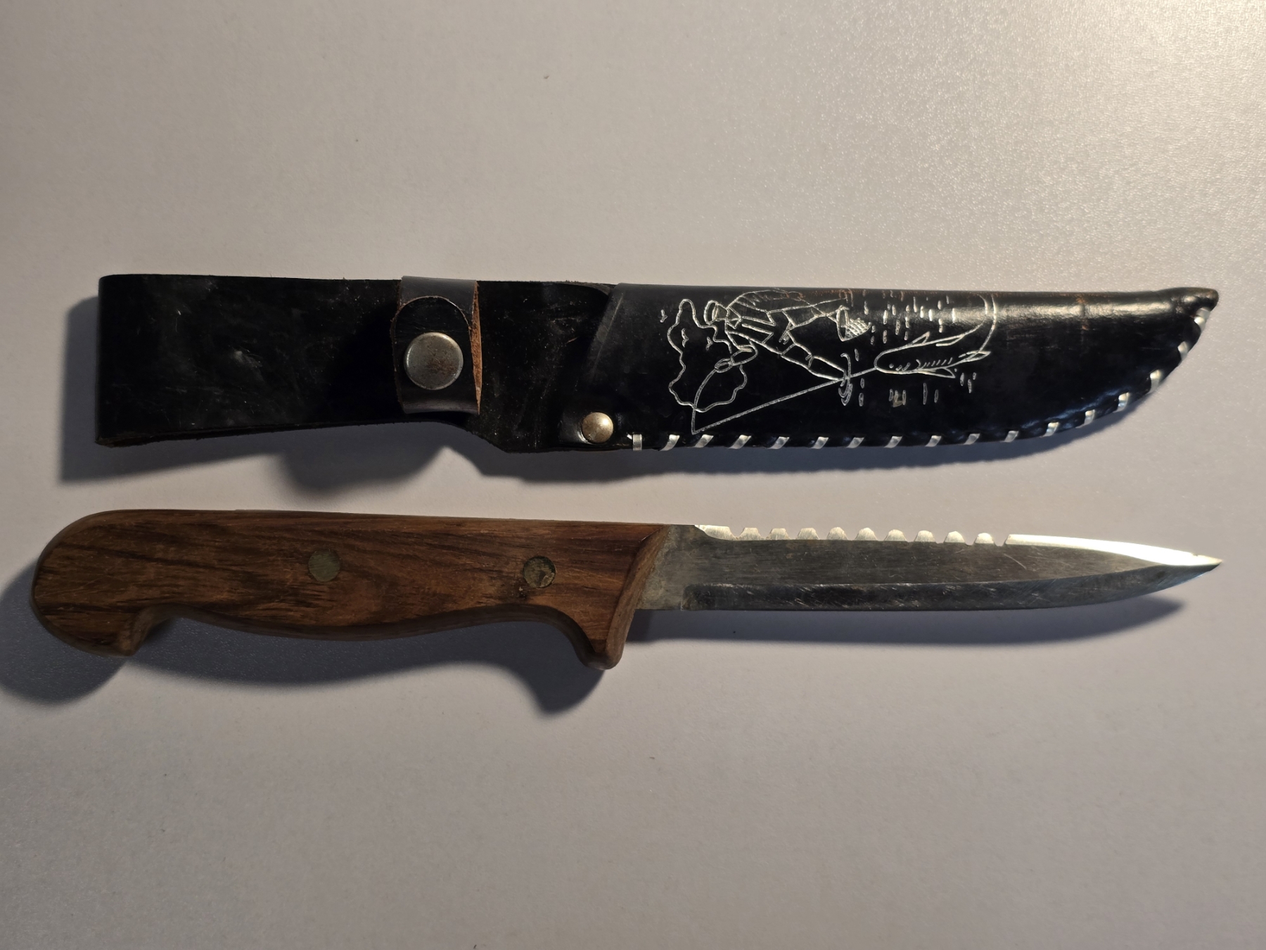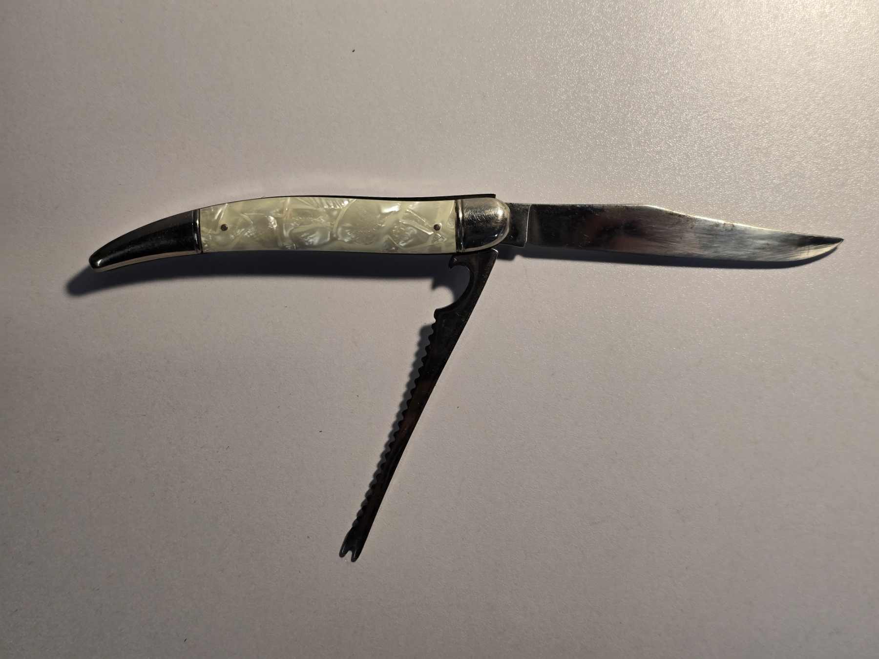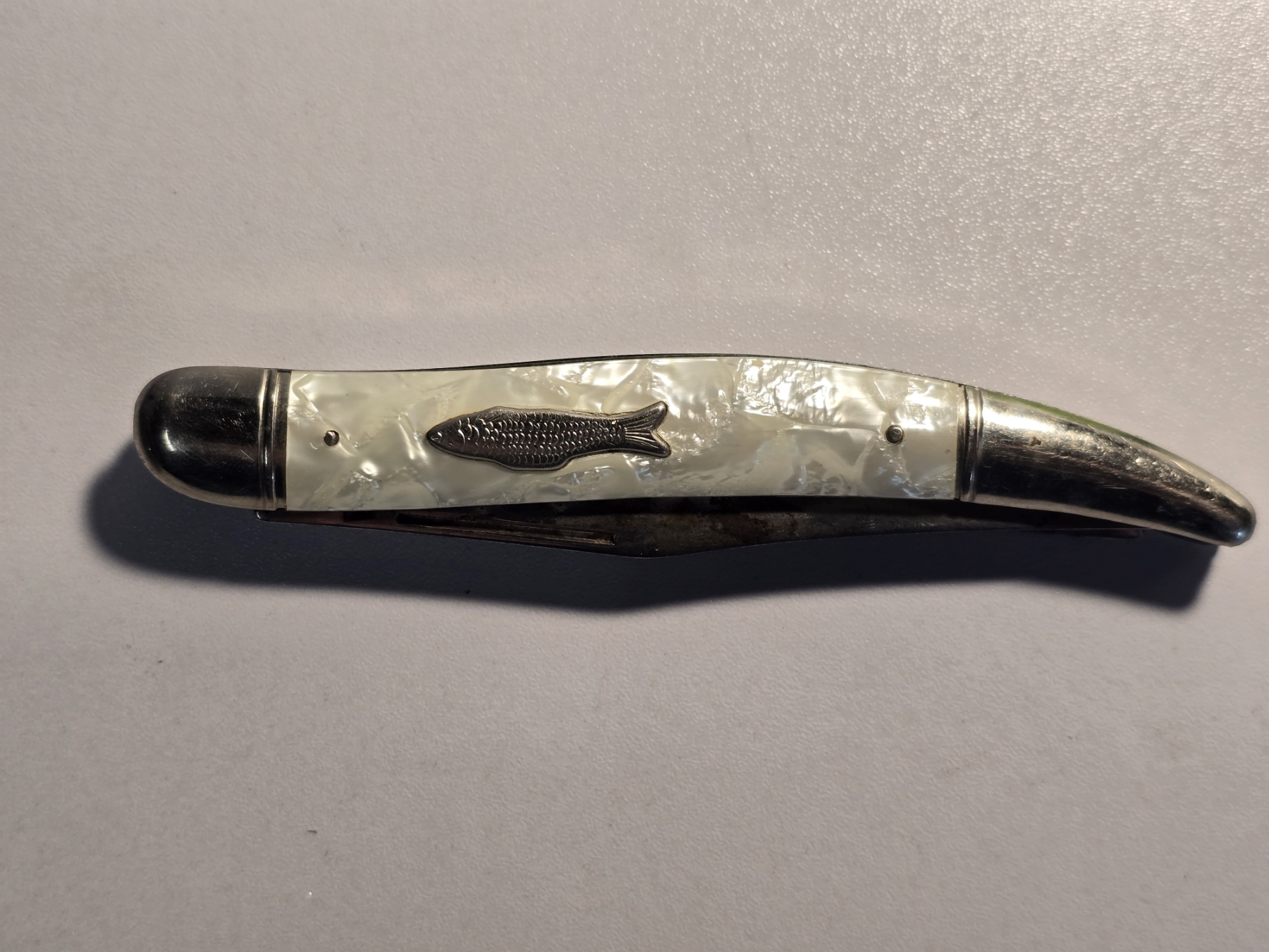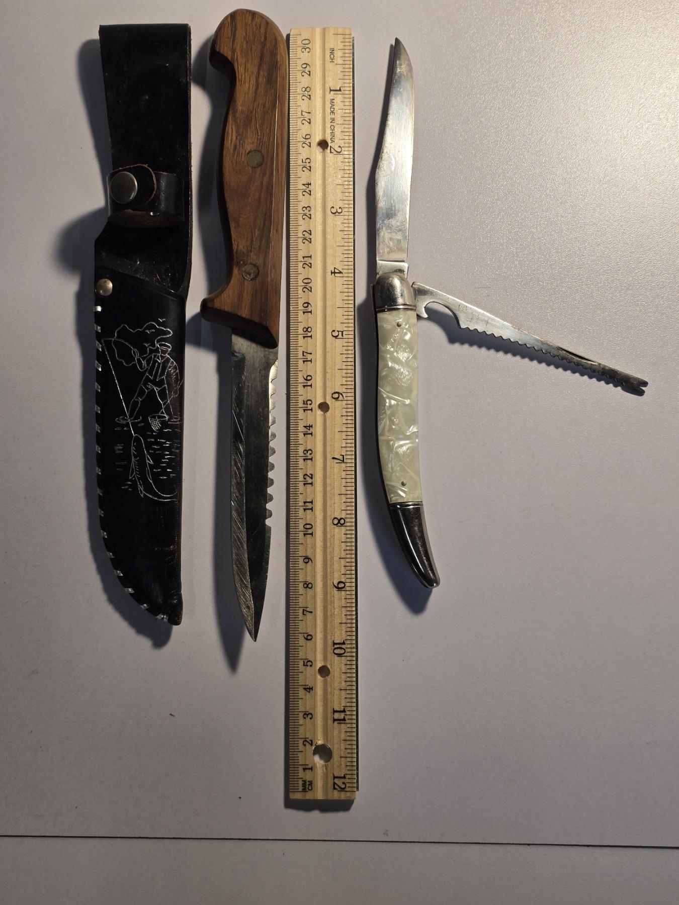 (2) Knives - Folding Knife with Pearl Handle and Double Sided Knife with Leather Sheath
