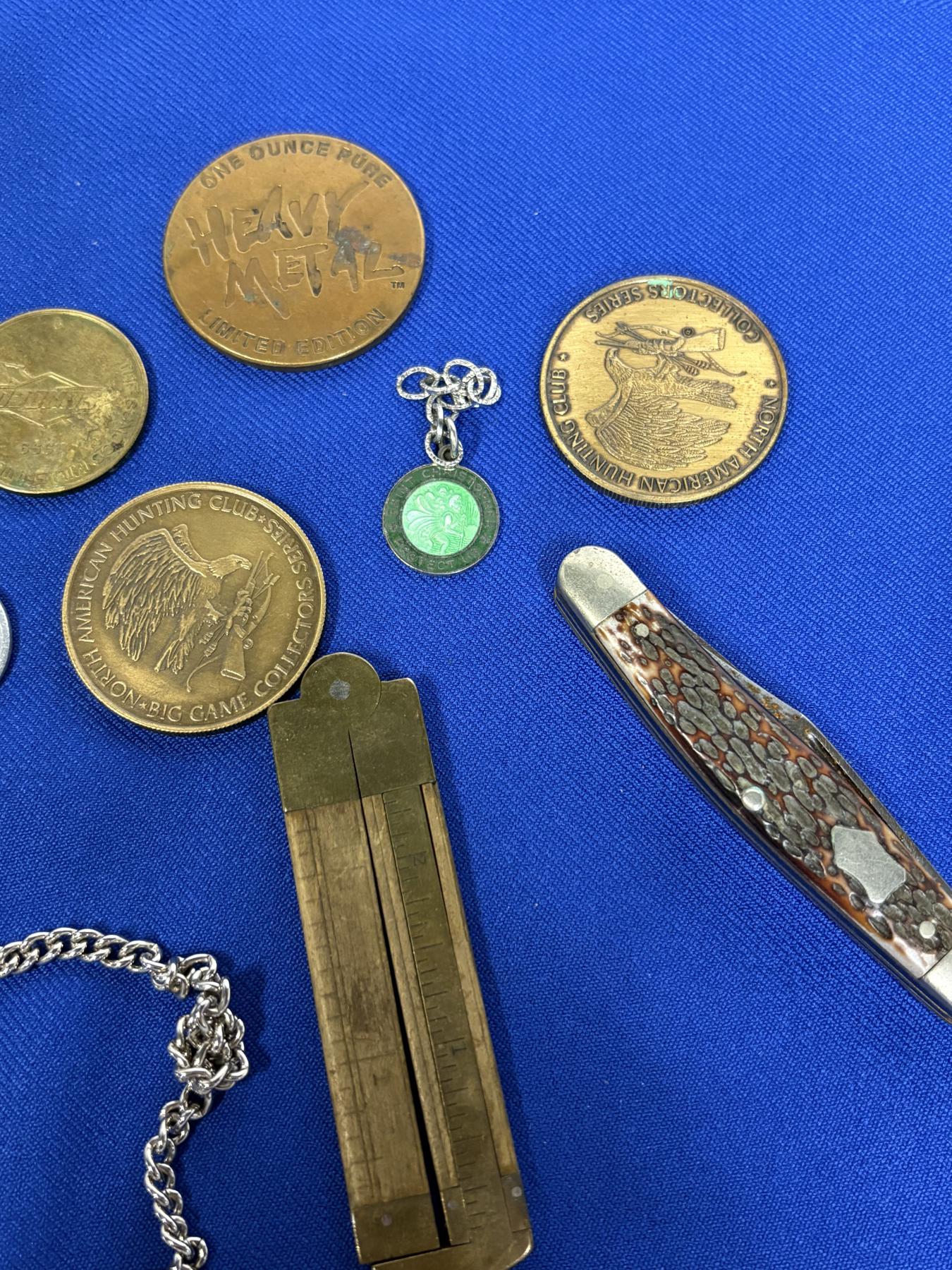2 Pocket Knives - Spoon - 5 Keychains - American Hunting Club - Tokens Heavy Metal Token - Sunoco - Whitetail Deer