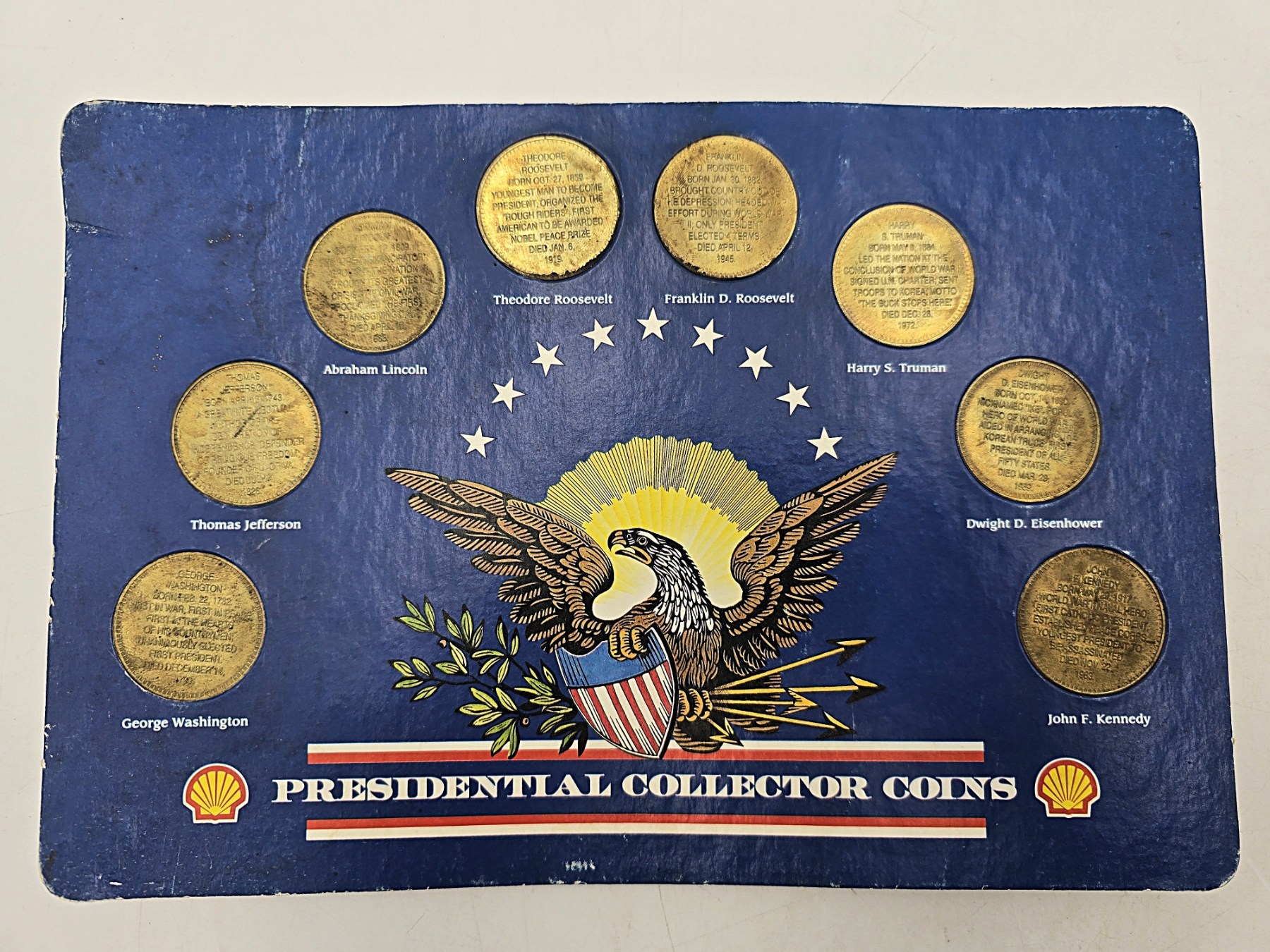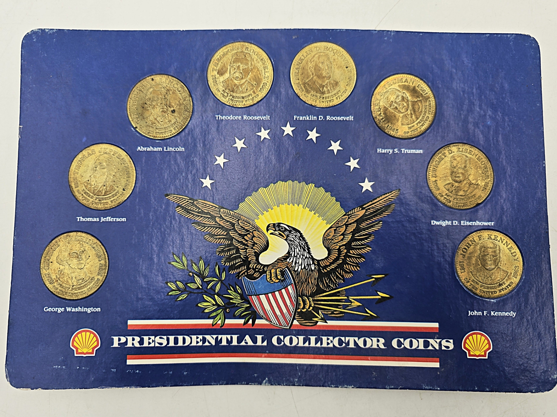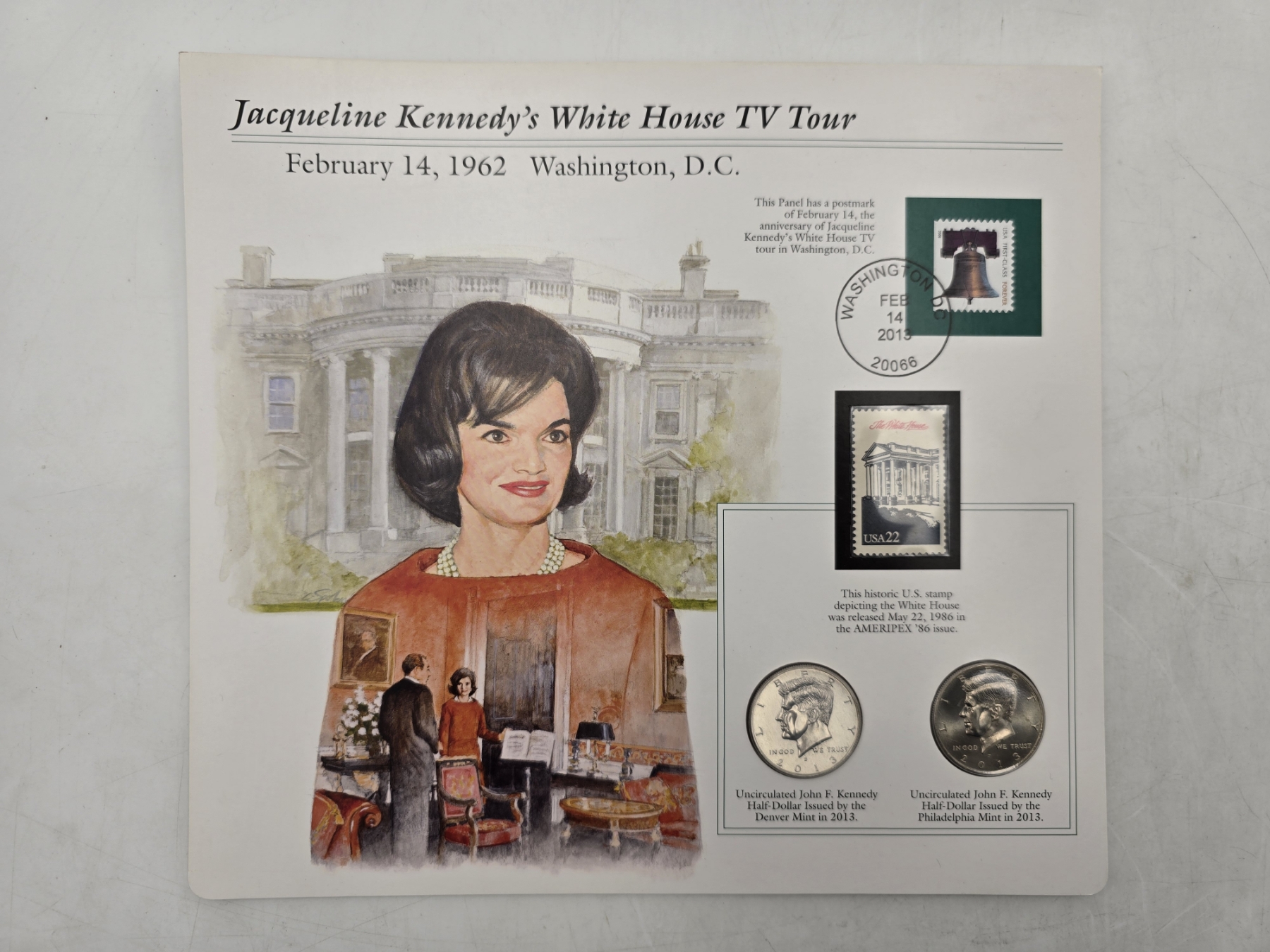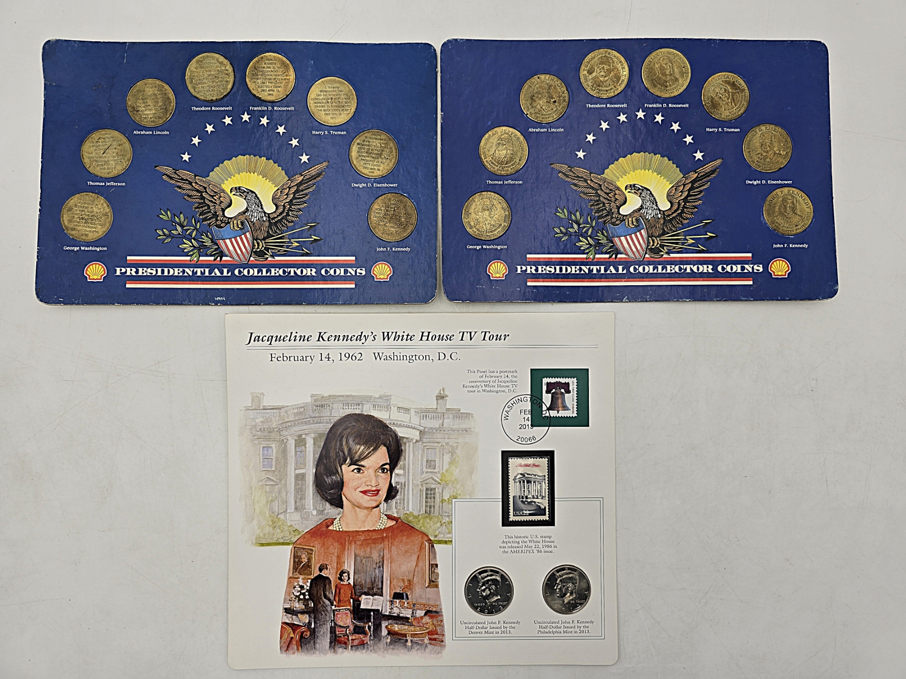 (2) Sets of Presidential Collector Coins on Display Boards & Jacqueline Kennedy Commemorative Coins and Stamp Set