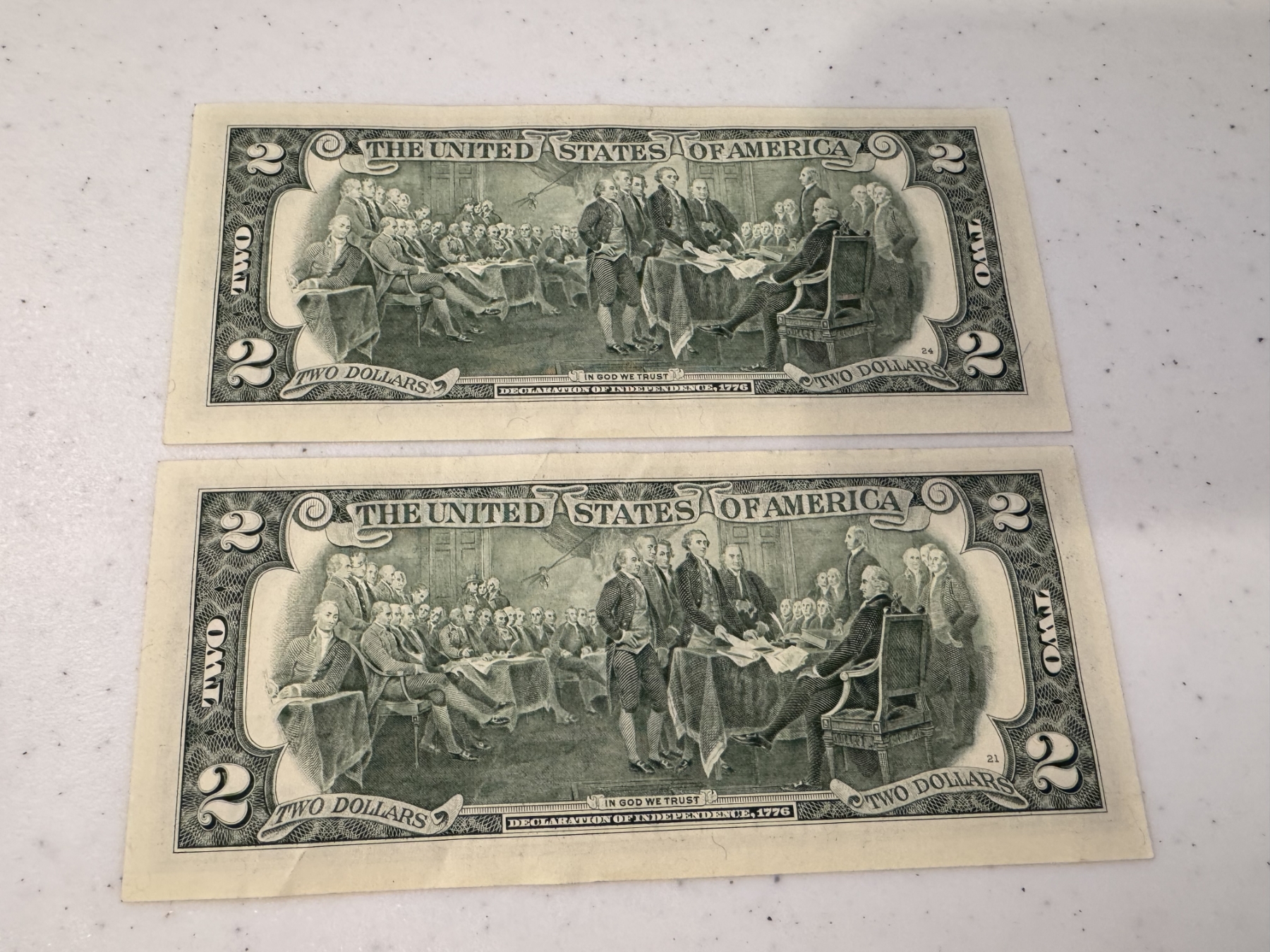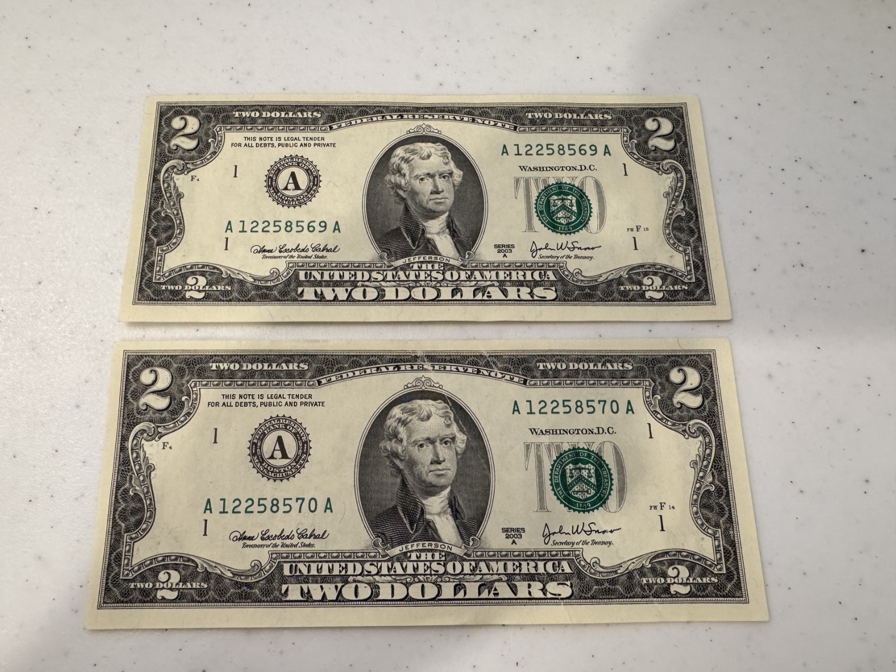 2 - United States Thomas Jefferson $2.00 Bill - Consecutive Numbered Bills - Mint Condition