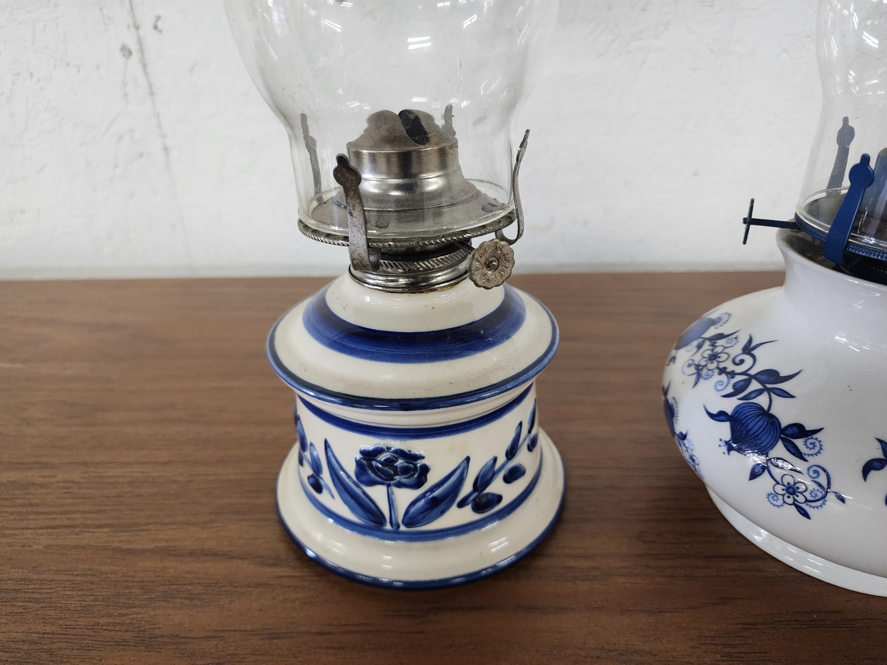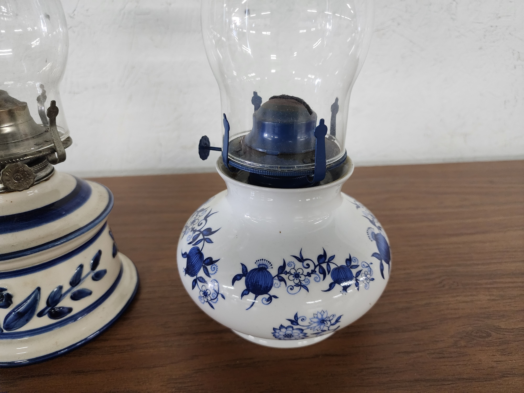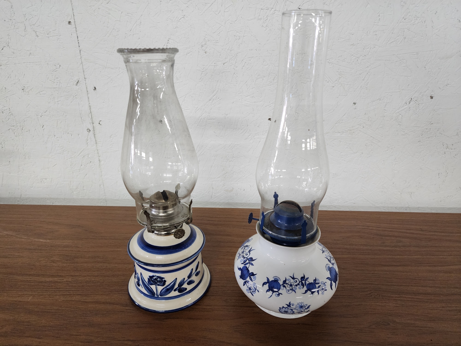 (2) Vintage Lamplight Farms Oil Lamps Blue and White Floral Designs - 16in/14in