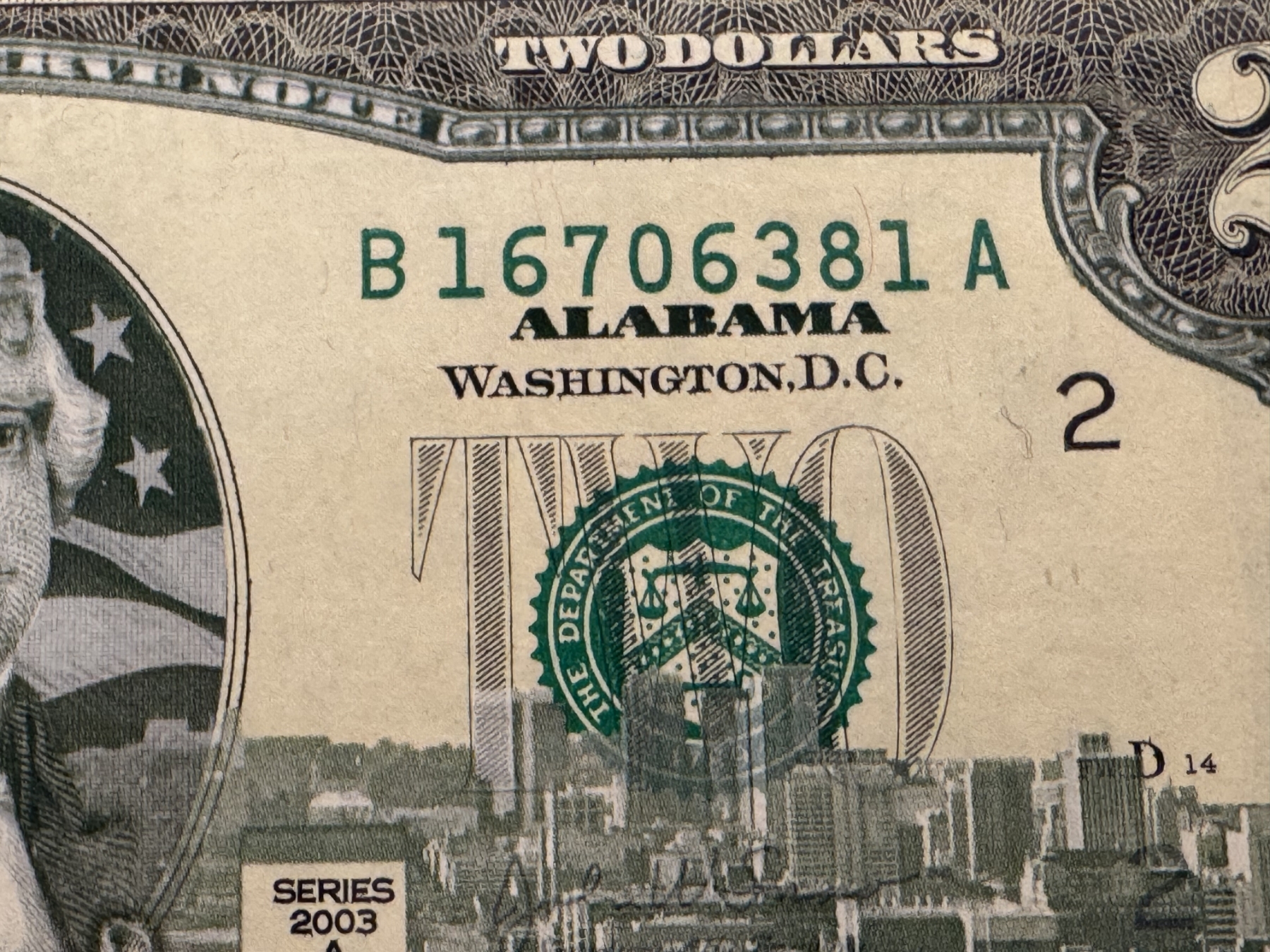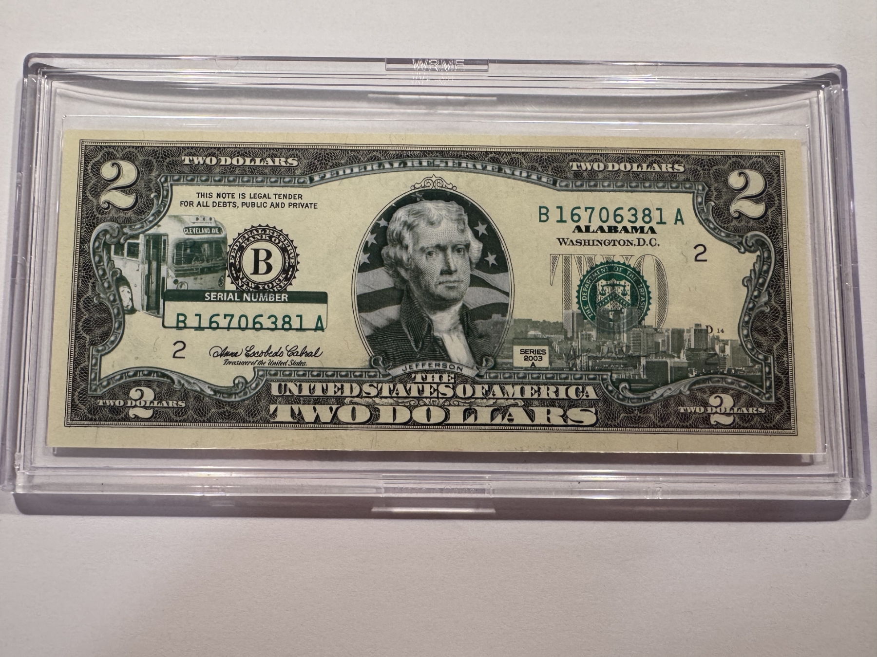 2003 United States Jefferson ALABAMA $2.00 Bill In Hard Case Holder - Mint Condition - RARE