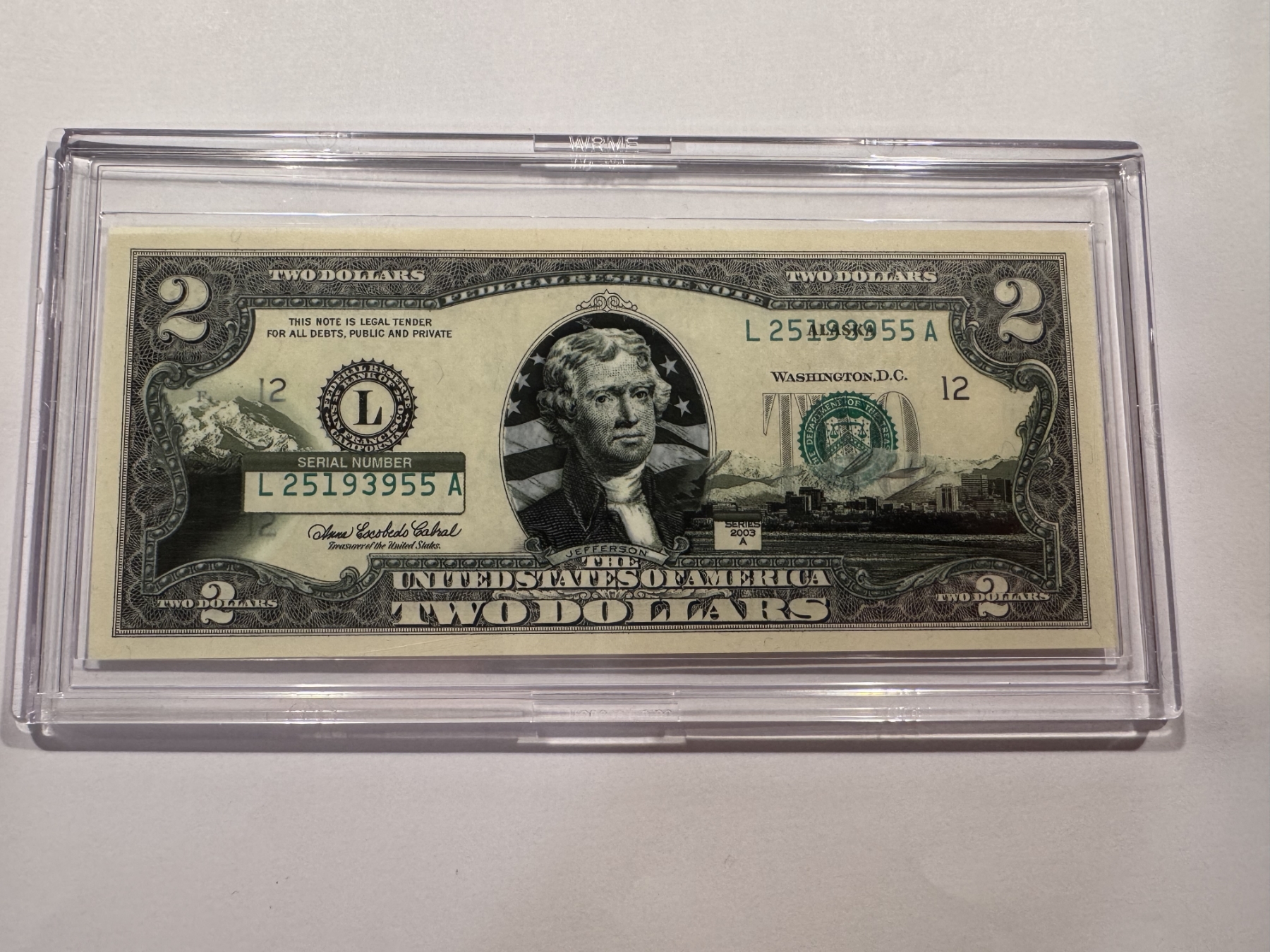 2003 United States Jefferson ALASKA $2.00 Bill In Hard Case Holder - Mint Condition - RARE