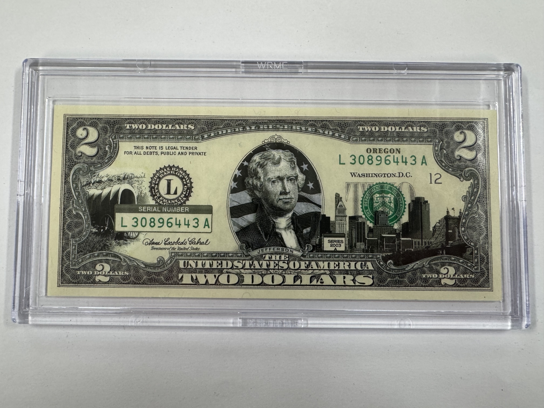 2003 United States Jefferson OREGON $2.00 Bill In Hard Case Holder - Mint Condition - RARE