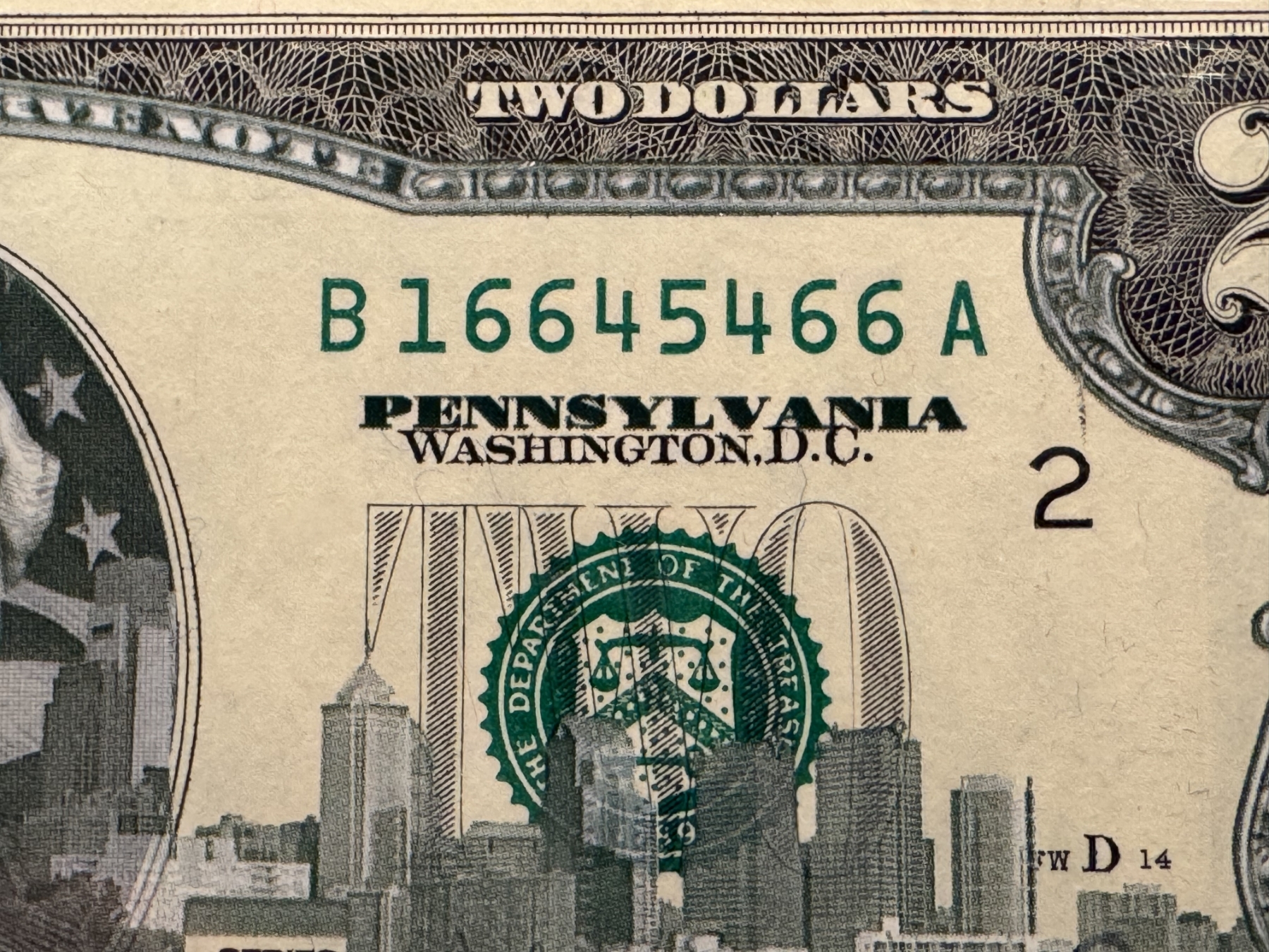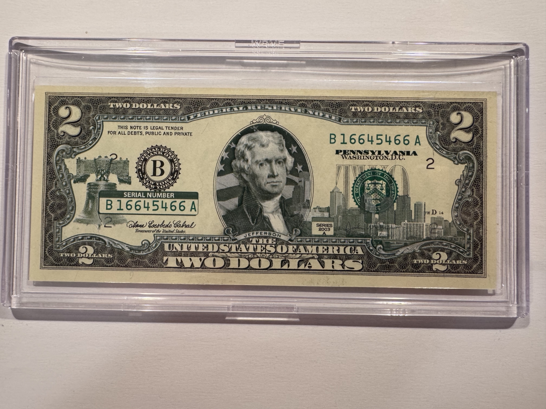 2003 United States Jefferson PENNSYLVANIA $2.00 Bill In Hard Case Holder - Mint Condition - RARE - 4 Of A Kind Serial Number - 6's