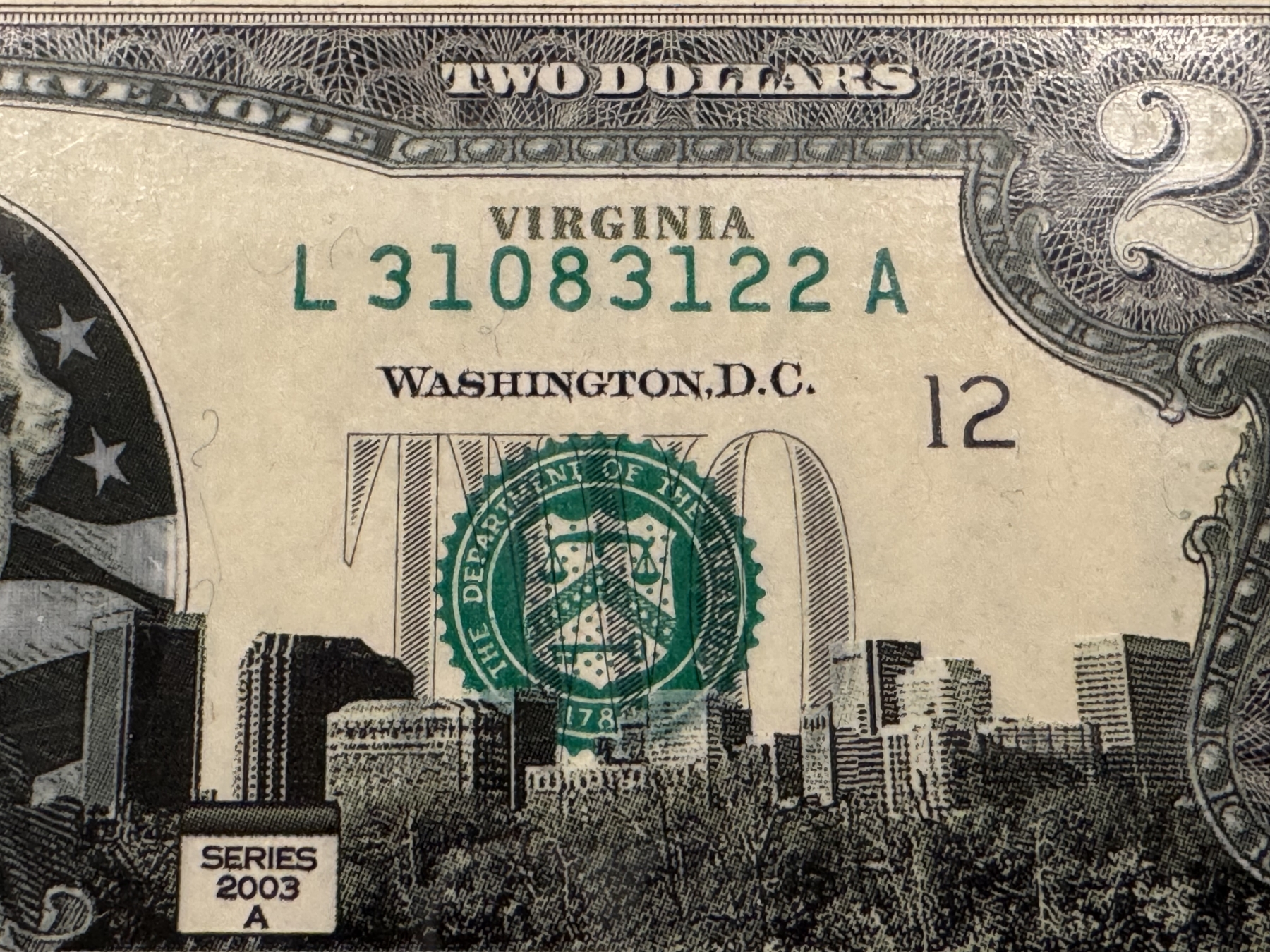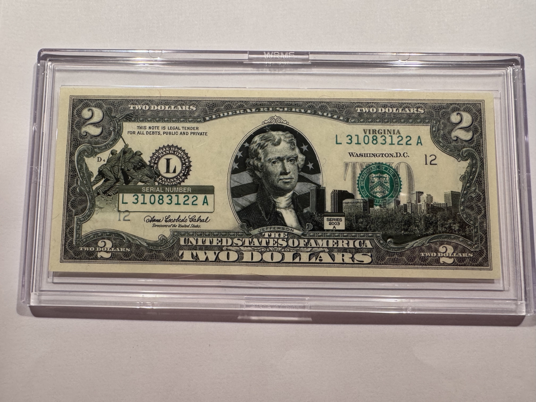 2003 United States Jefferson VIRGINIA $2.00 Bill In Hard Case Holder - Mint Condition - RARE