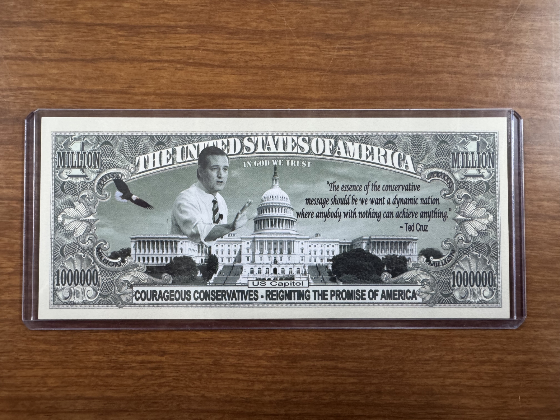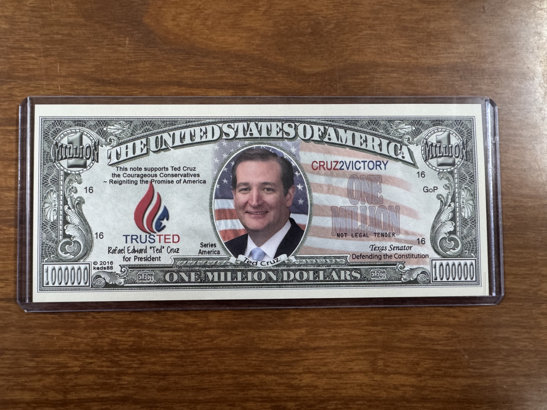 2016 Ted Cruz One Million Dollar Campaign Advertising Note In Holder - Mint Condition