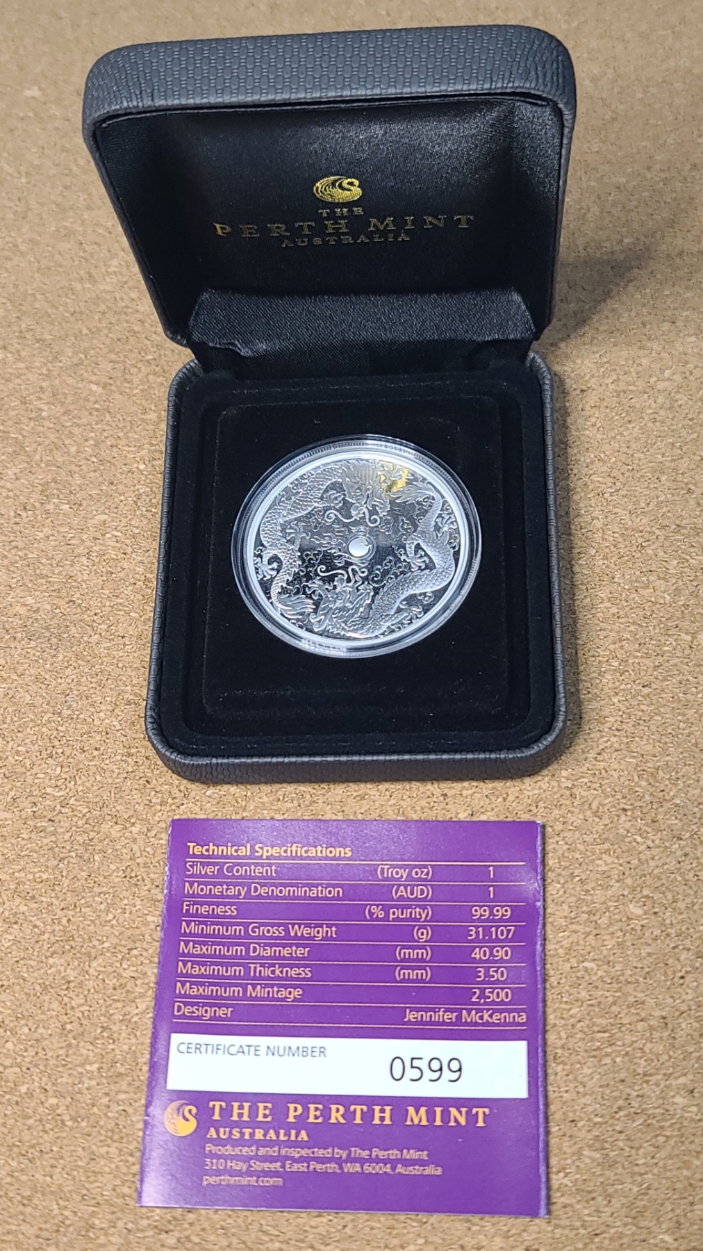 2020 1 Oz 99.99% Fine Silver $1 Proof Australian Double Dragon Coin From The Perth Mint