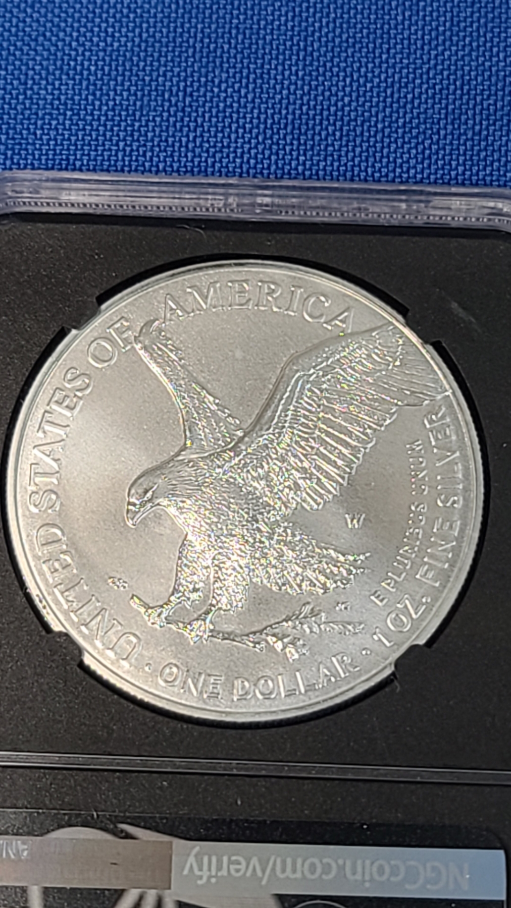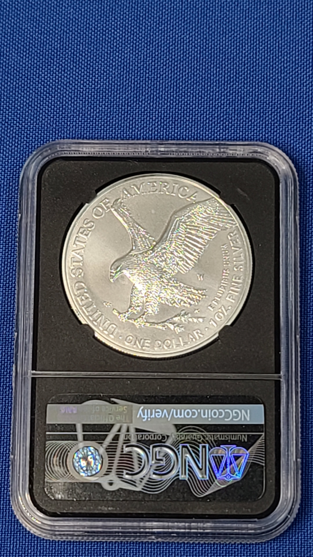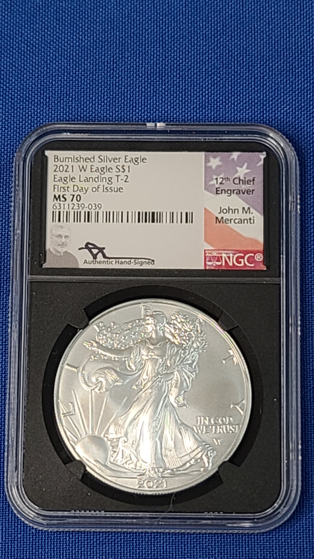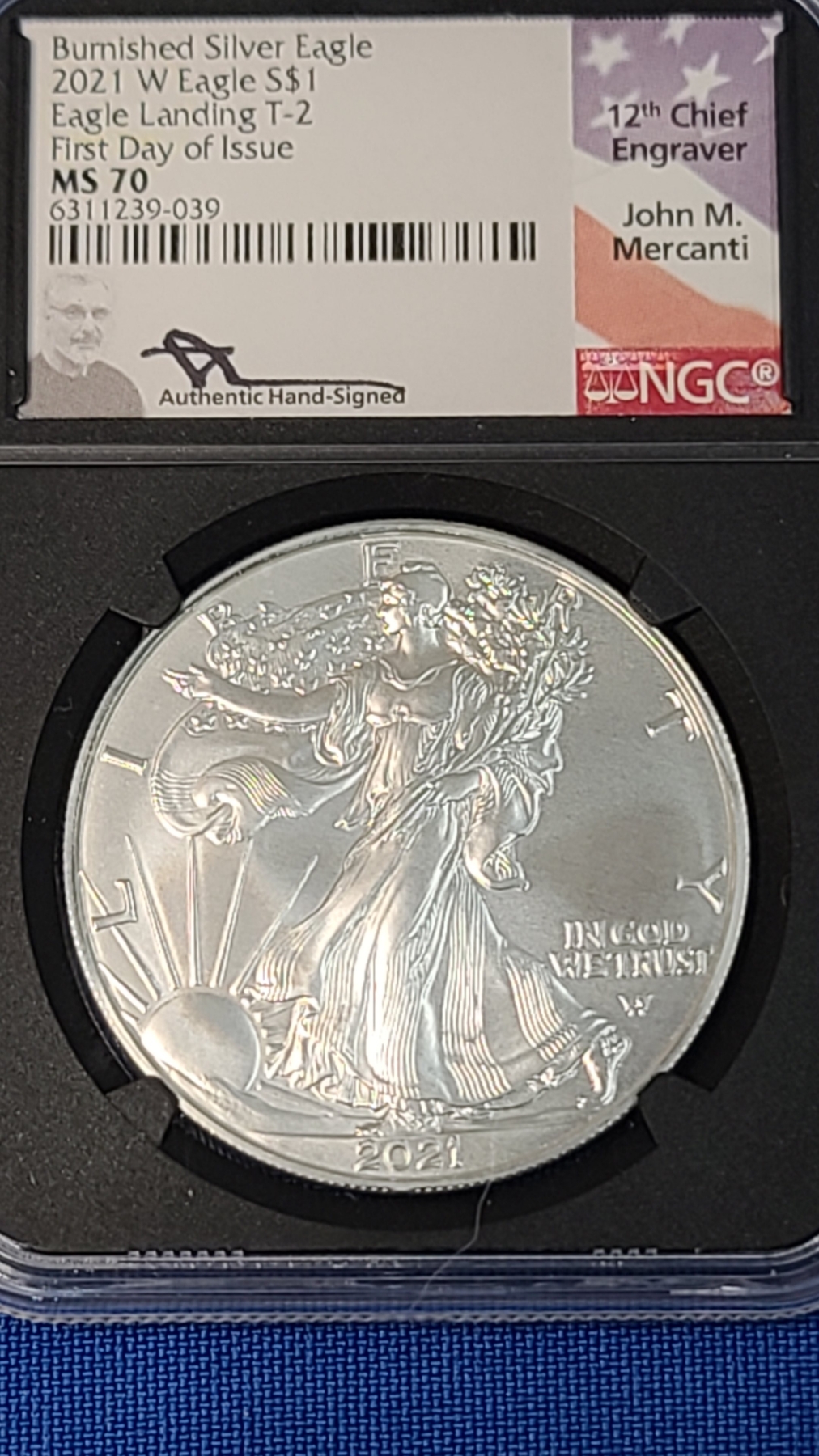 2021-W NGC Eagle Landing T-2 First Day Of Issue MS 70 Burnished 1 oz Silver American Eagle With Signature From U.S Mint Engraver John M. Mercanti